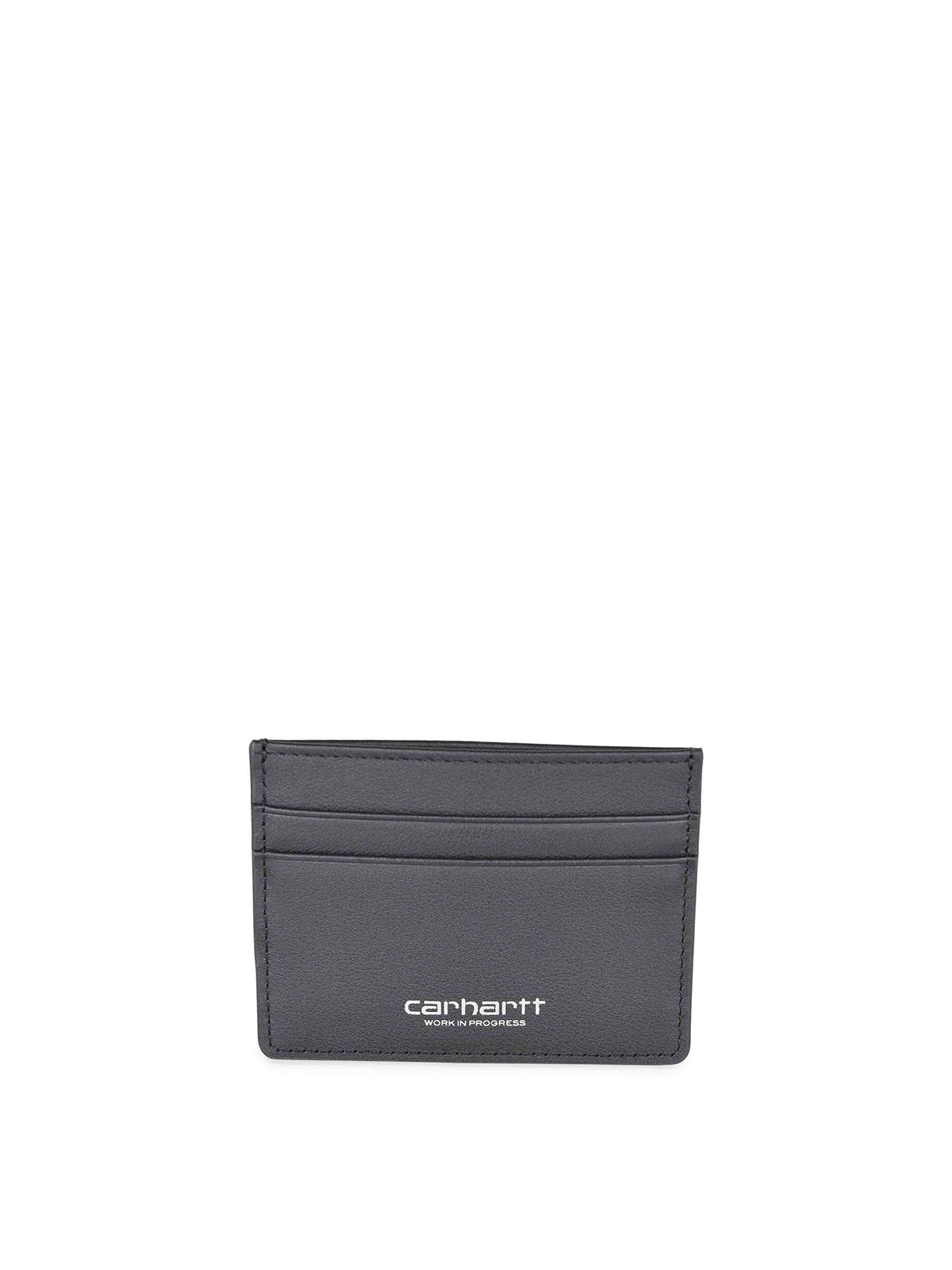 ブラックレザー製カーハートカードホルダー、メイントップコンパートメント、フロントコンパートメント2つ、バックコンパートメント1つ、フロントにコントラストの効いたロゴレタリング、7.5 x 10 cm 100% レザー