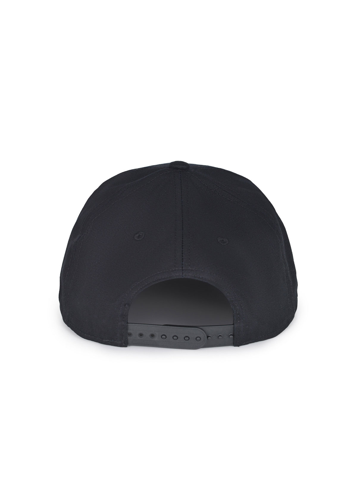 ブラックコットン製のカーハートベースボールキャップ。硬いバイザー。前面にトーン・オン・トーンのレザーロゴラベル。後ろで調節可能。100% コットン