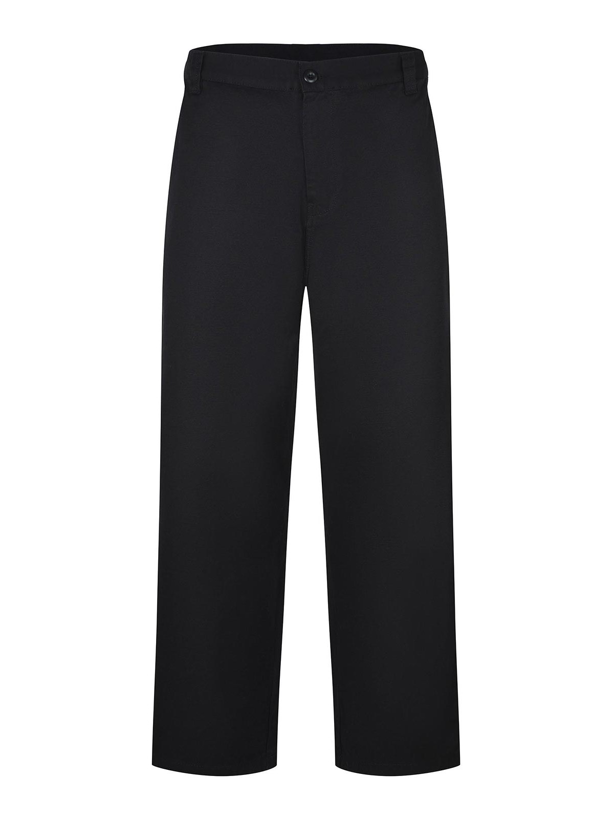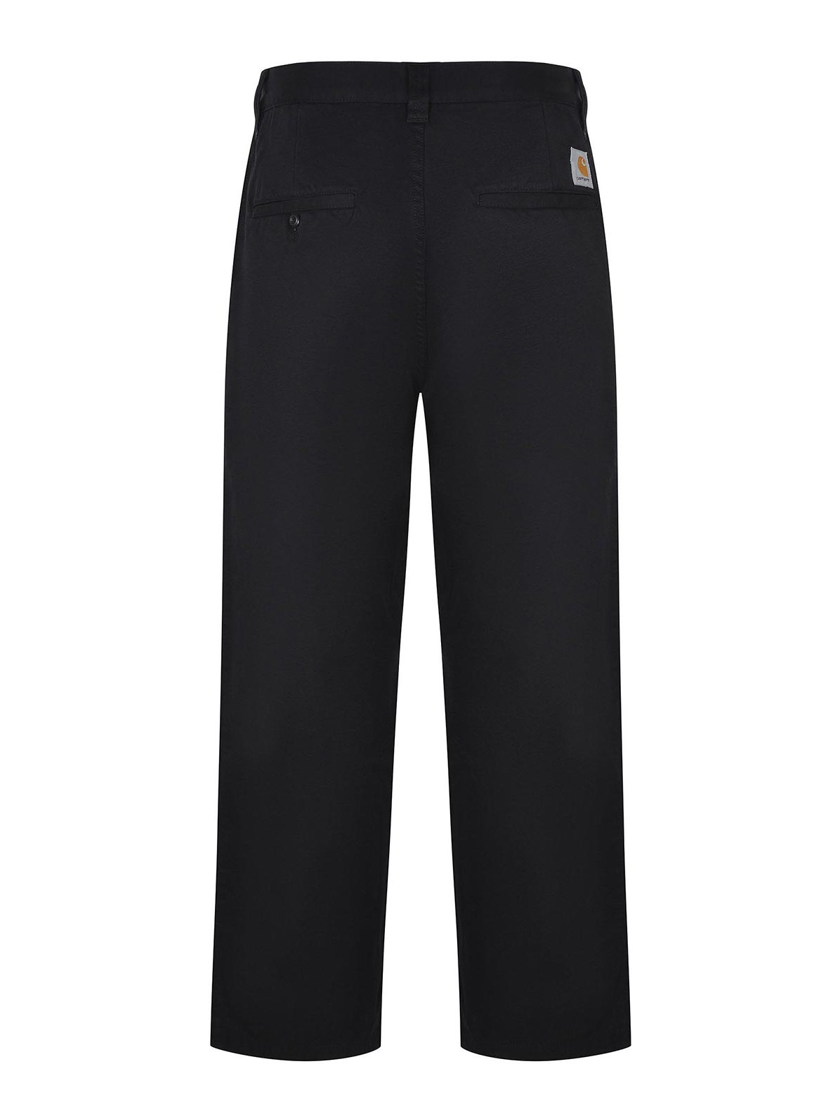 ブラックコットンツイル製のカーハートパンツ、ボタンとジッパー、ウエストにベルトループ、サイドポケット、ボタン付きバックポケット、バックポケットにコントラストの効いたロゴラベル、100% コットン