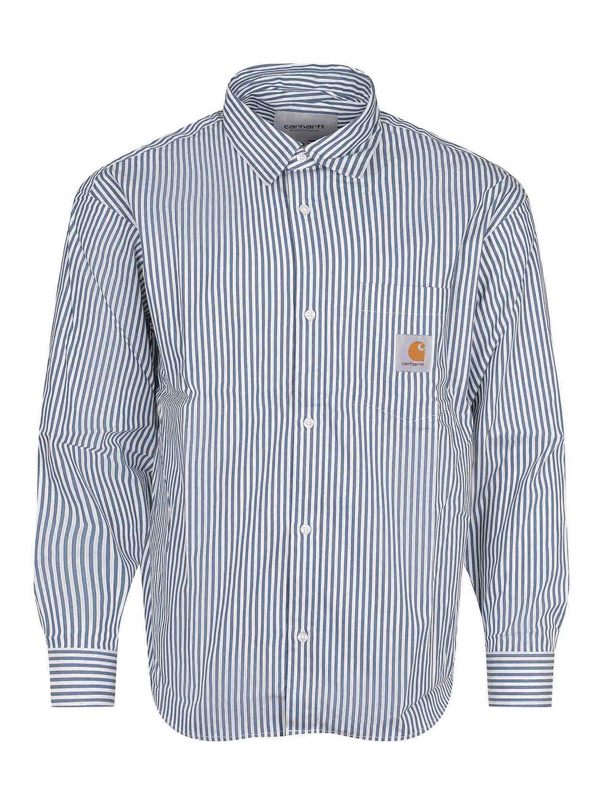 ライトブルーコットン製カーハートシャツ、ストライプ柄、クラシックカラー、ボタン付きカフス付きロングスリーブ、フロントボタン留め、コントラストの効いたロゴパッチ付き胸ポケット、100% コットン