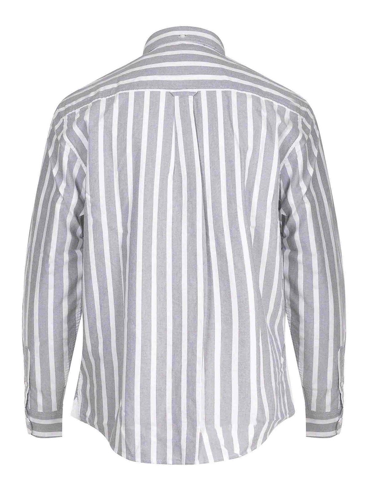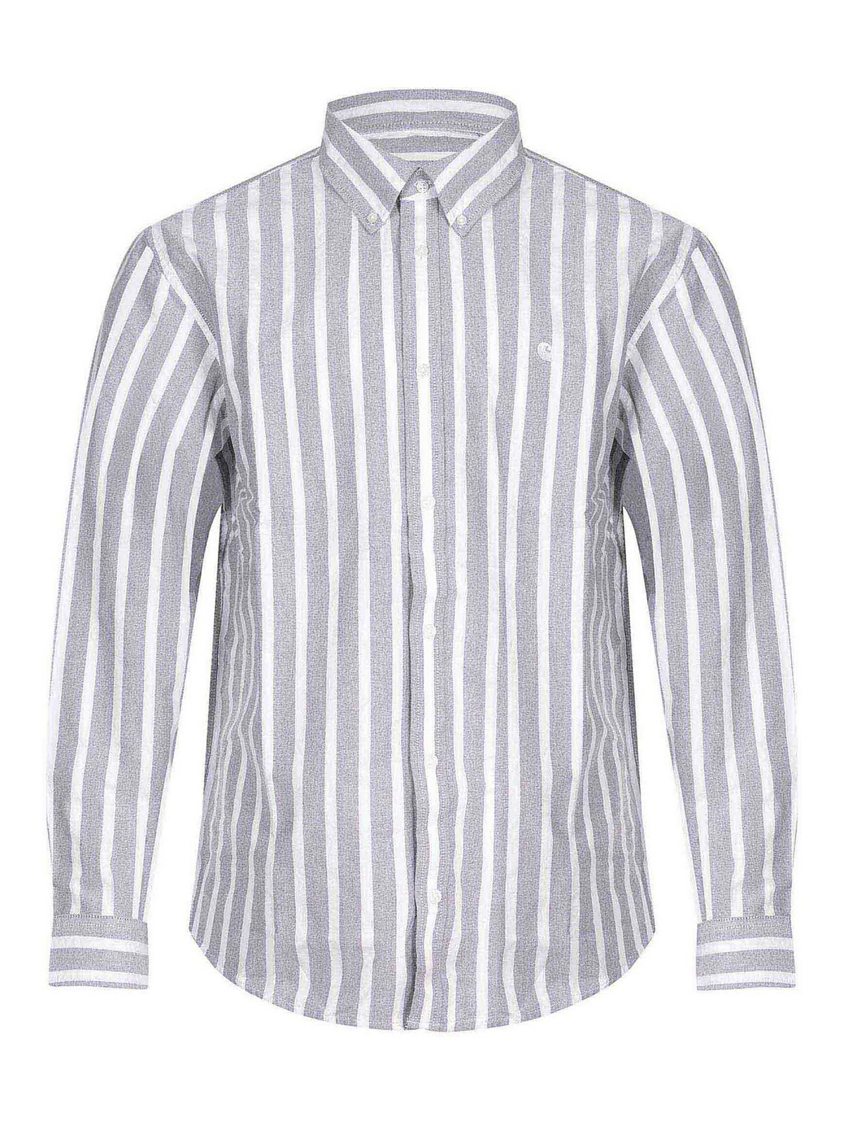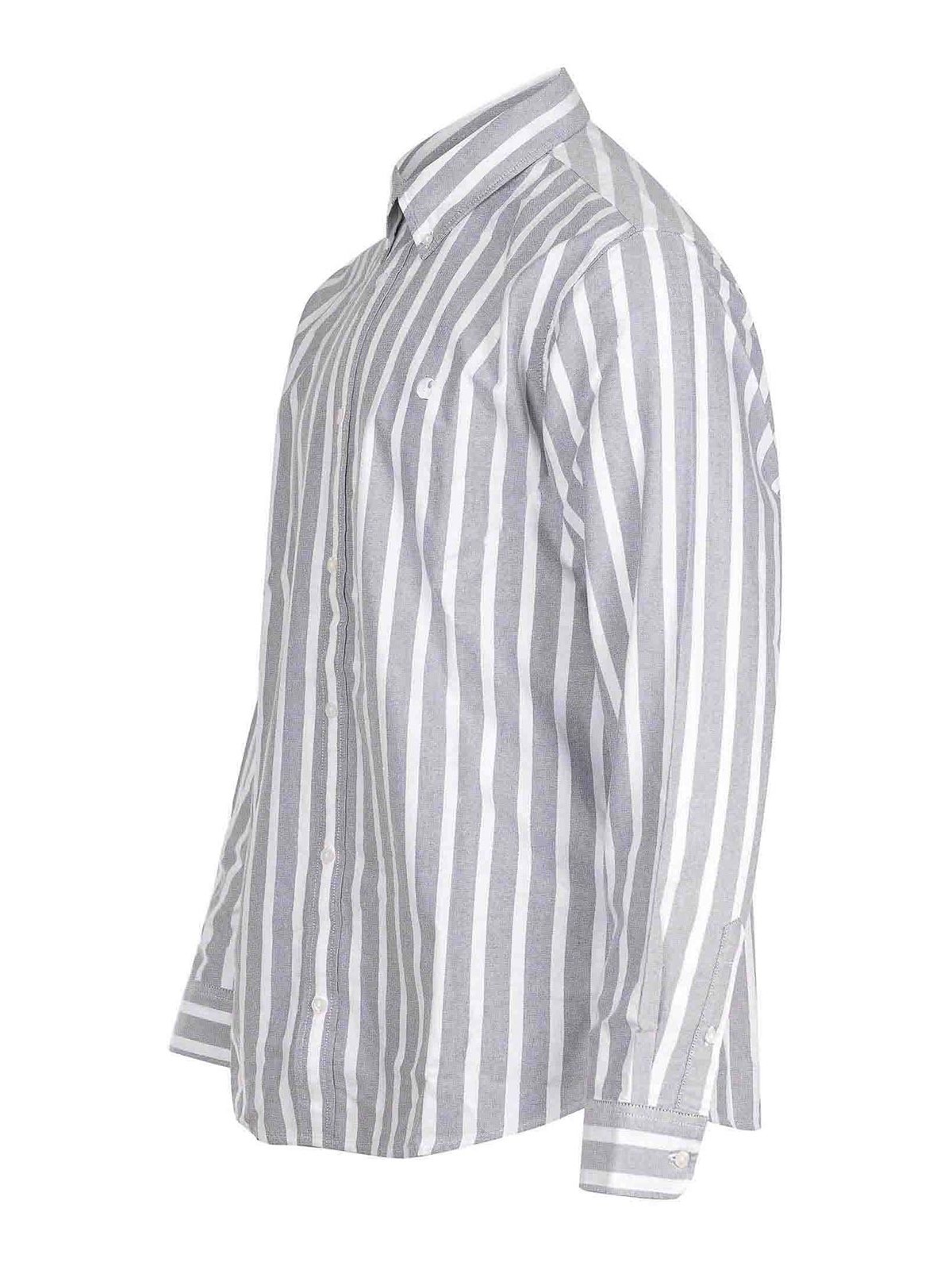 グレーコットン製のカーハートシャツ、ストライプ柄、クラシックなボタンダウン襟、長袖、フロントボタン留め、胸にコントラストカラーのロゴモノグラム刺繍、100% コットン