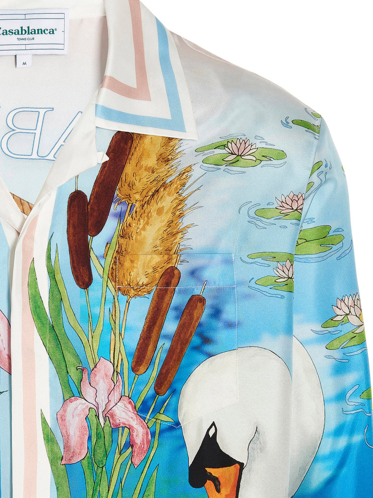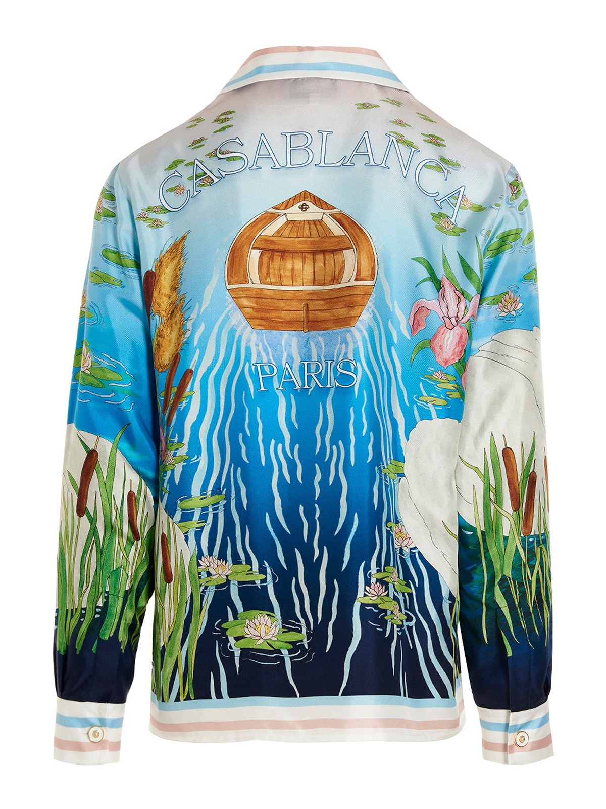 全面プリントのシルクシャツ、ボタン留め、長袖カフス、フロントポケット、背面にロゴ付き。