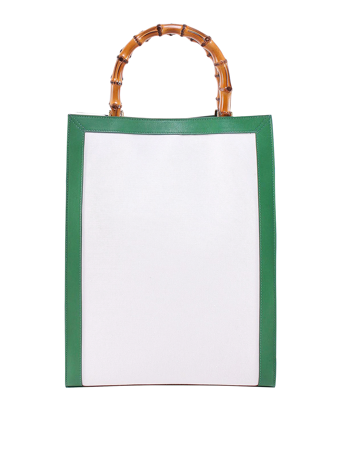 前面にロゴが入ったキャンバスハンドバッグ。マグネットボタン付きクロージャー、竹製ハンドル、レザープロファイル、内部ポケットが特徴です。