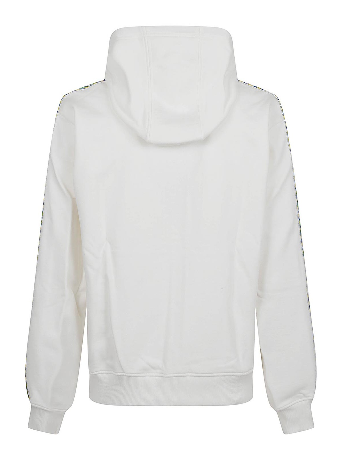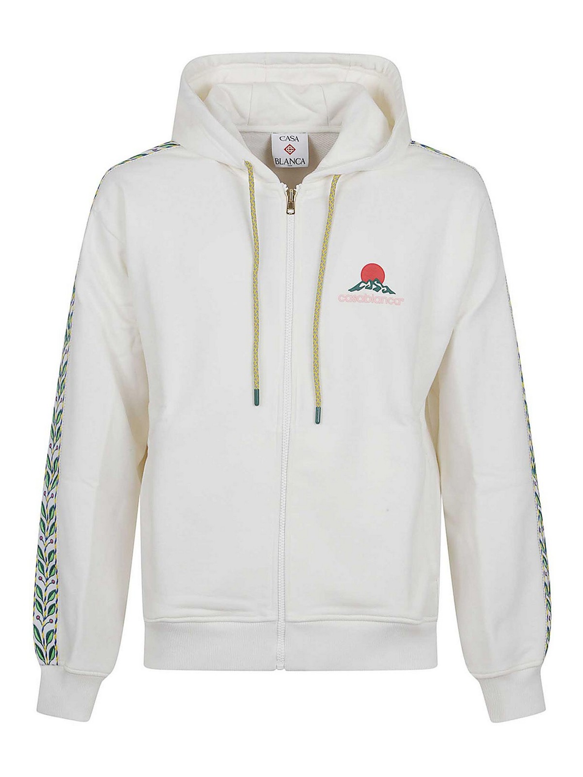 カサブランカオーガニックコットンのテクニカルポケット&ローレルテープ付きスウェットシャツ。ドローストリングフード、フロントファスナー、ロングスリーブ、リブ編みの袖口と裾、胸にプリント、袖にローレルリーフのリボンが特徴です。