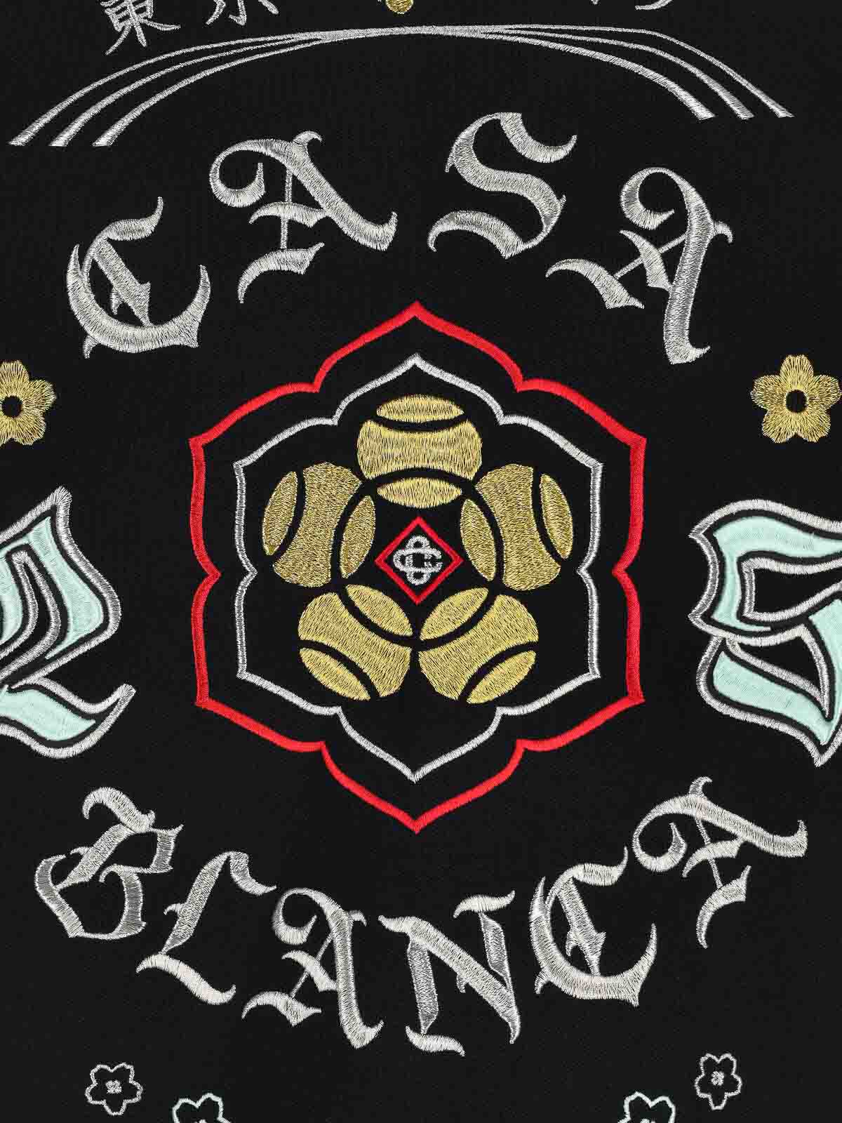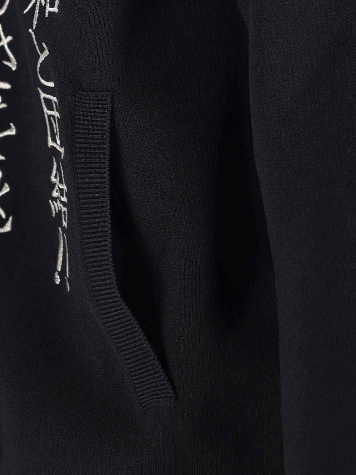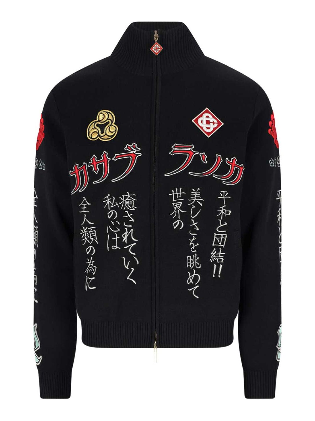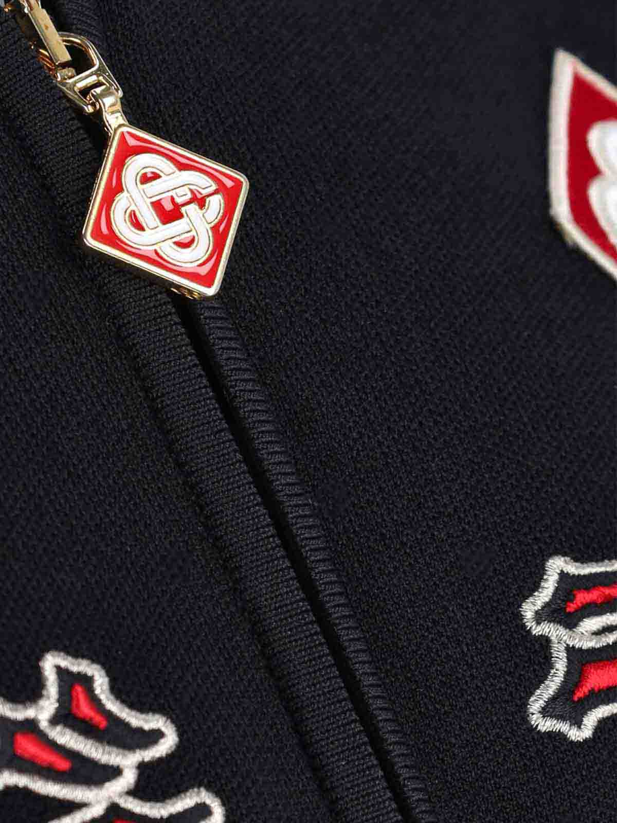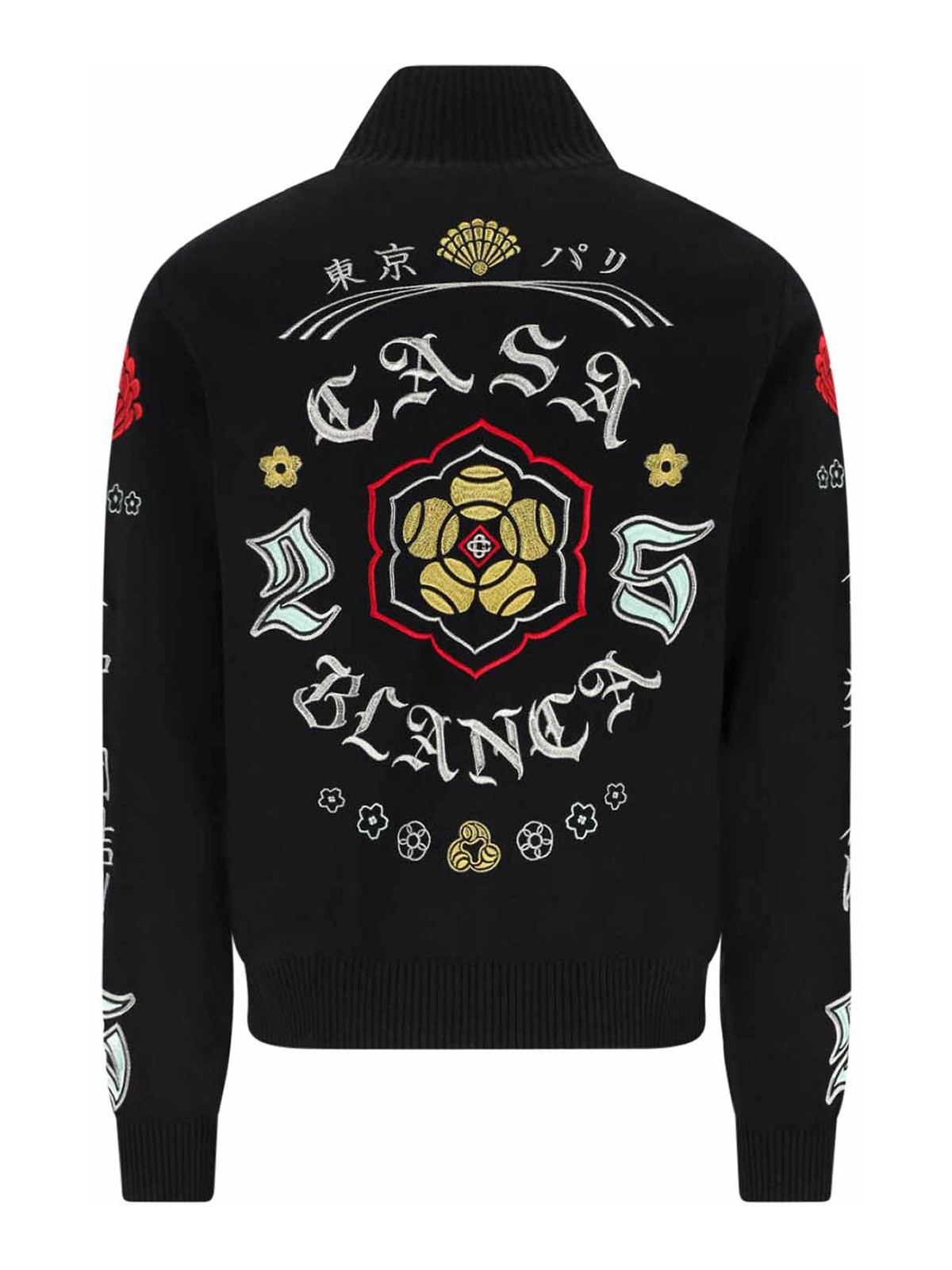 カサブランカロゴジップスウェットシャツ、ブラックビスコース混紡ニット構造、ハイカラー、ダブルジッパー、ロゴジッププーラーディテール、全面マルチカラーロゴ刺繍、サイドポケット2つ、背面にマキシマルチカラーロゴ刺繍、リブ仕上げ、ストレートヘム。