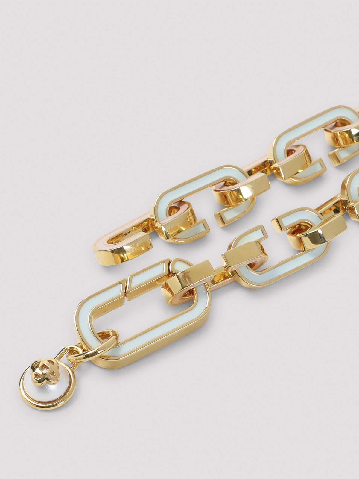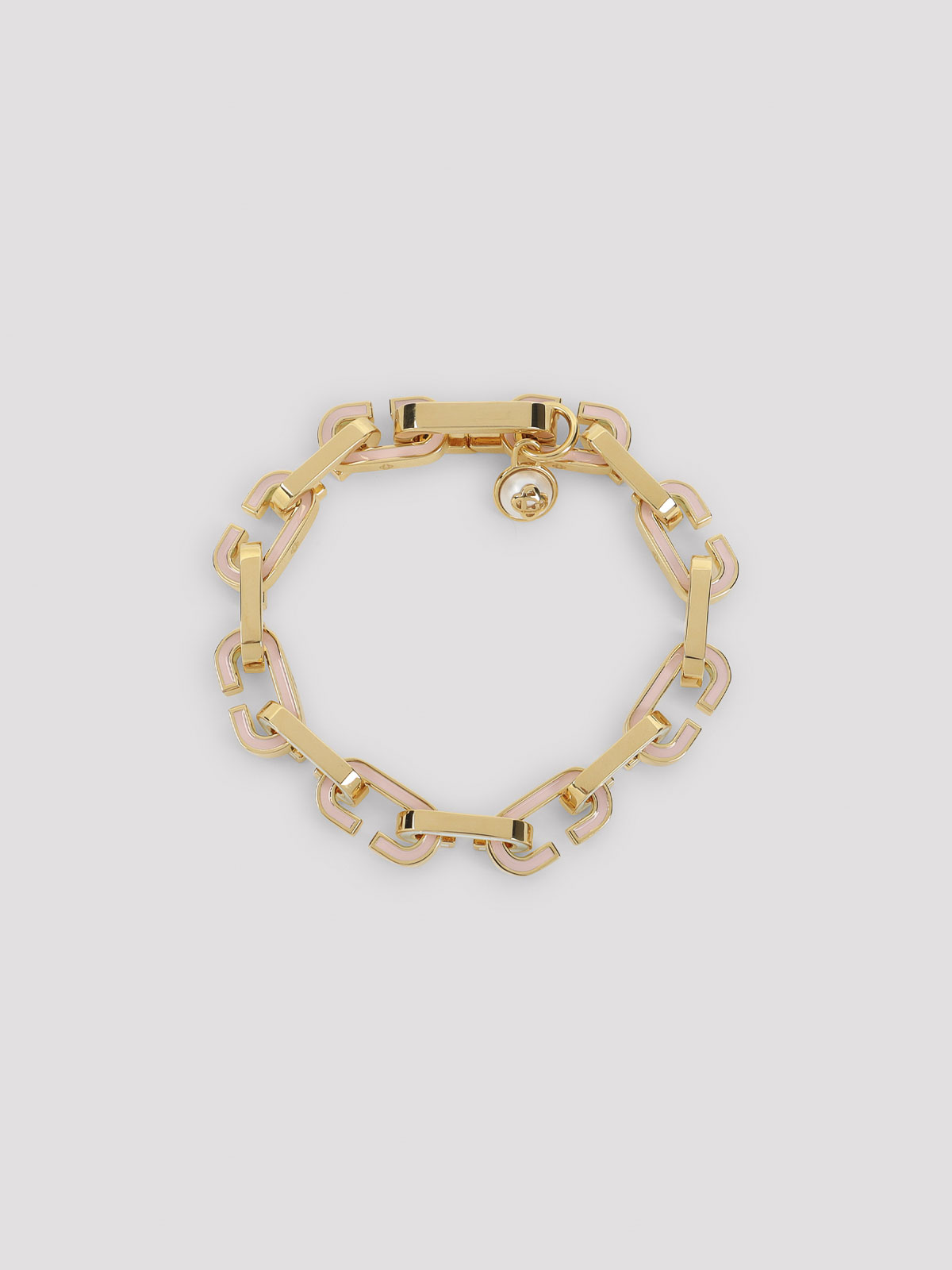 カサブランカエナメルのCリンクピンクとライトブルーの真鍮ブレスレット。ピンクとライトブルーのエナメルのディテールをあしらったゴールド仕上げの真鍮製Cリンクチェーン、背面にはブランドパールチャーム、隠し留め具。