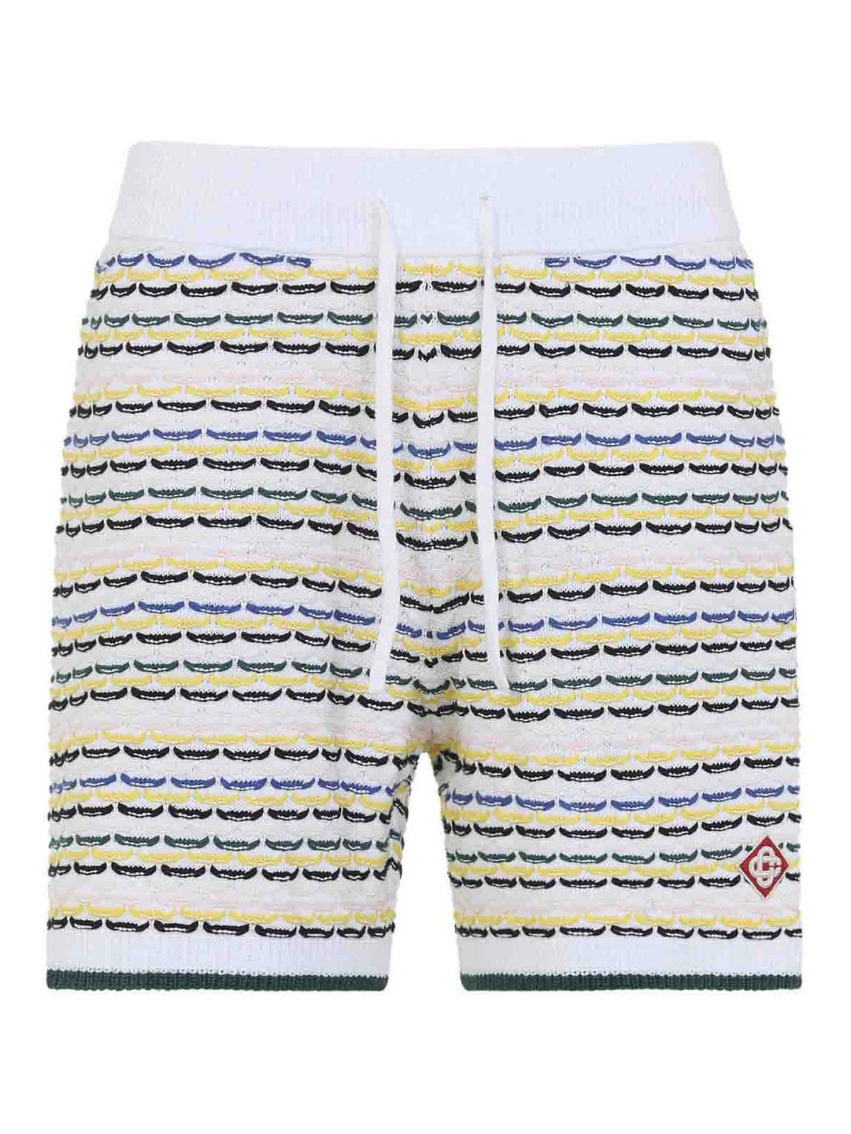 カサブランカタックステッチのホワイトコットンバミューダパンツ。かぎ針編みのホワイトコットンバミューダパンツ。全体にイエロー、ブルー、グリーンの刺繍、ドローストリング留めの伸縮性ウエストバンド、股下サイドポケット、フロントのロゴパッチ、リブ編みのエッジが特徴です。