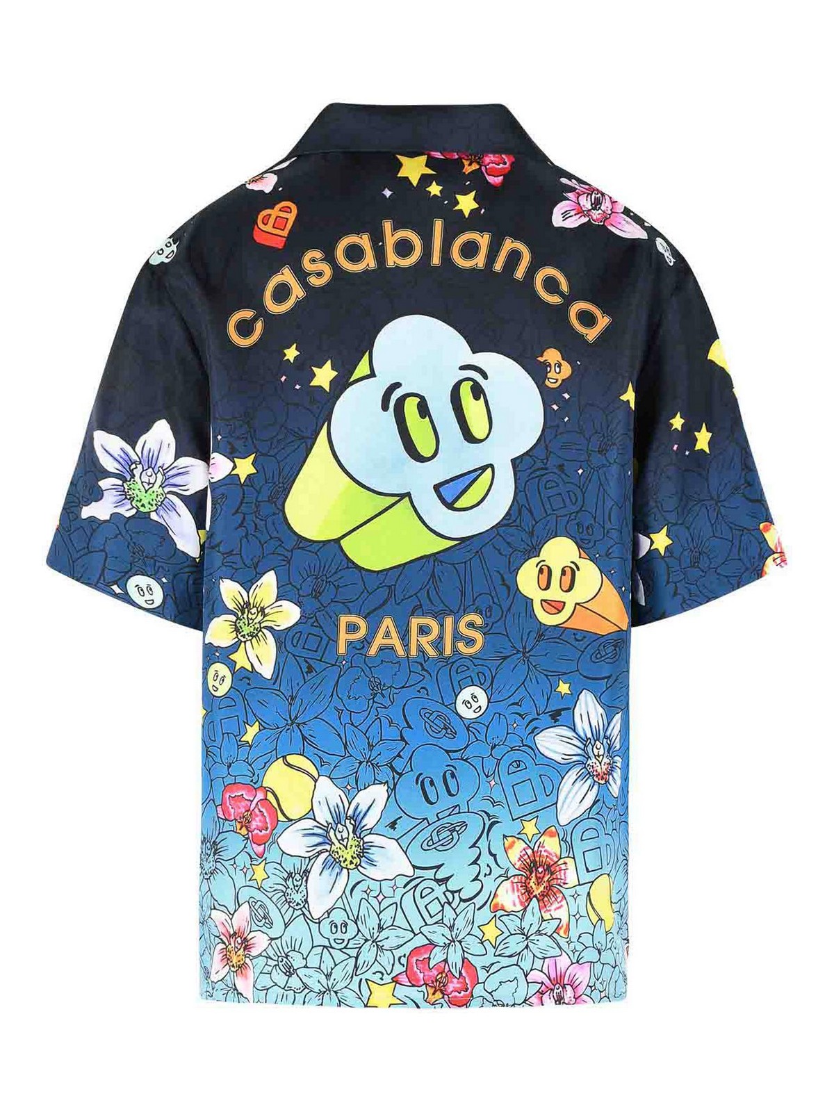 キューバンカラー、カバー付きボタン、胸パッチポケット、「コラージュディコーン」のシェードパターン