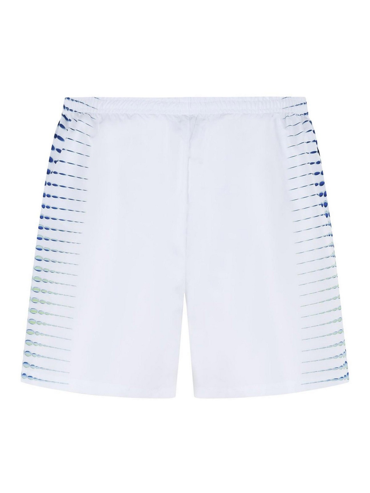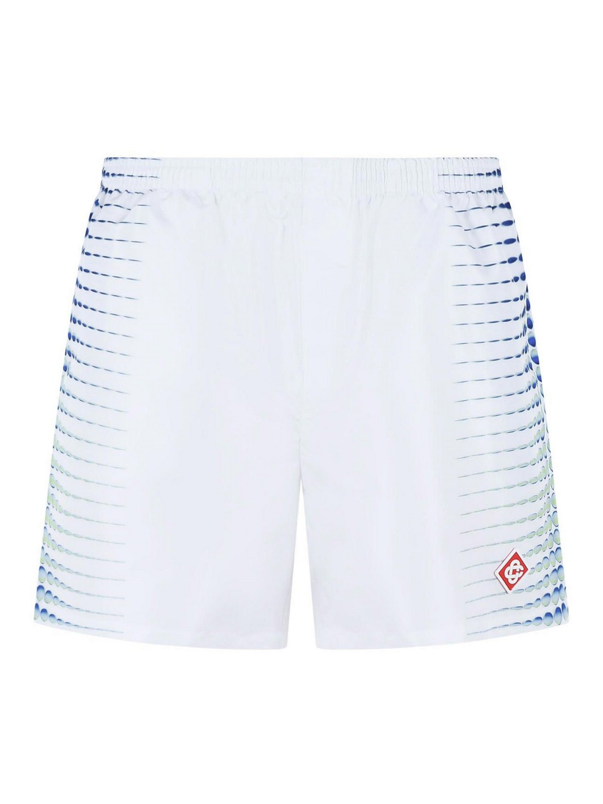 内側にドローストリングが付いた伸縮性のあるウエストバンド、サイドにウェルトポケット、裾にアイコニックなシリコンパッチ、「ドット」パターンのサイドプリント