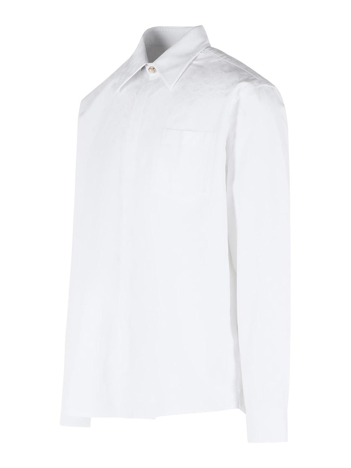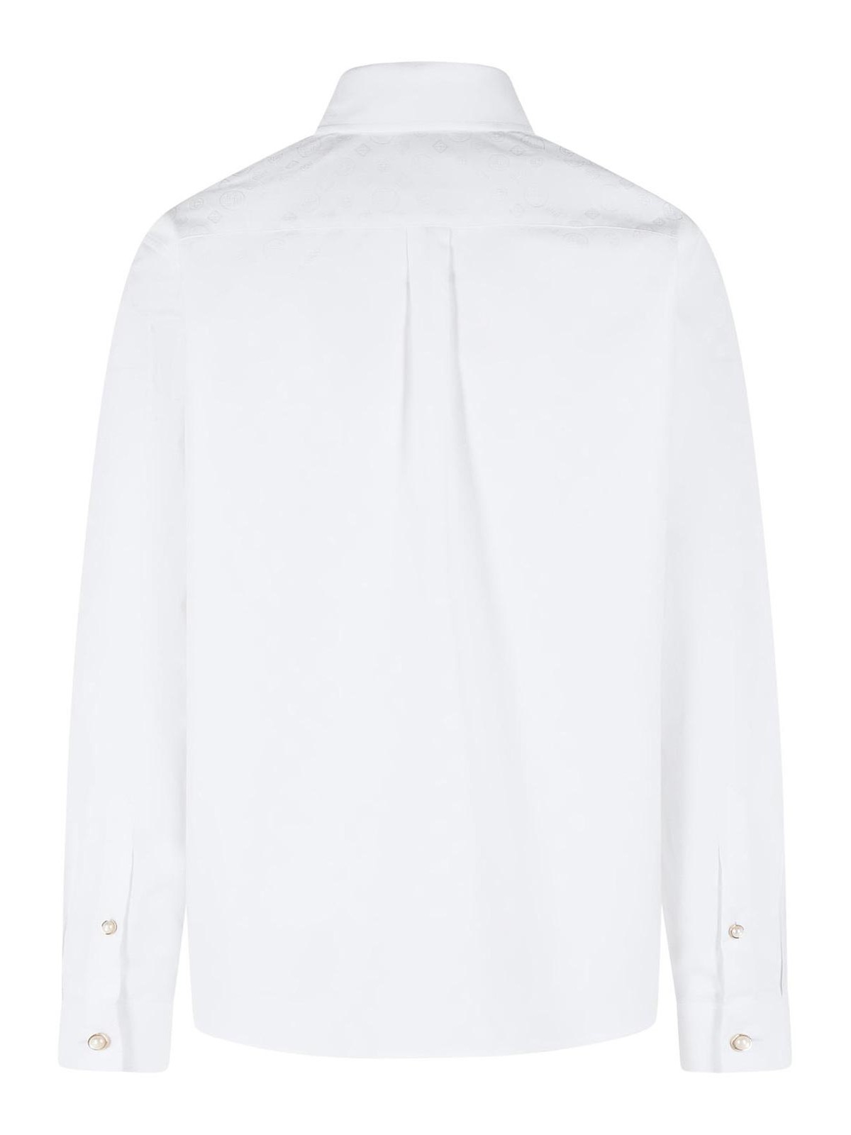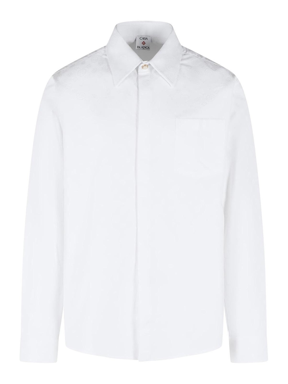 ポインテッドカラー、モノグラム入りオーバートーンパターン、フロントカバーボタン、胸パッチポケット、ボタンカフス、丸みのある裾