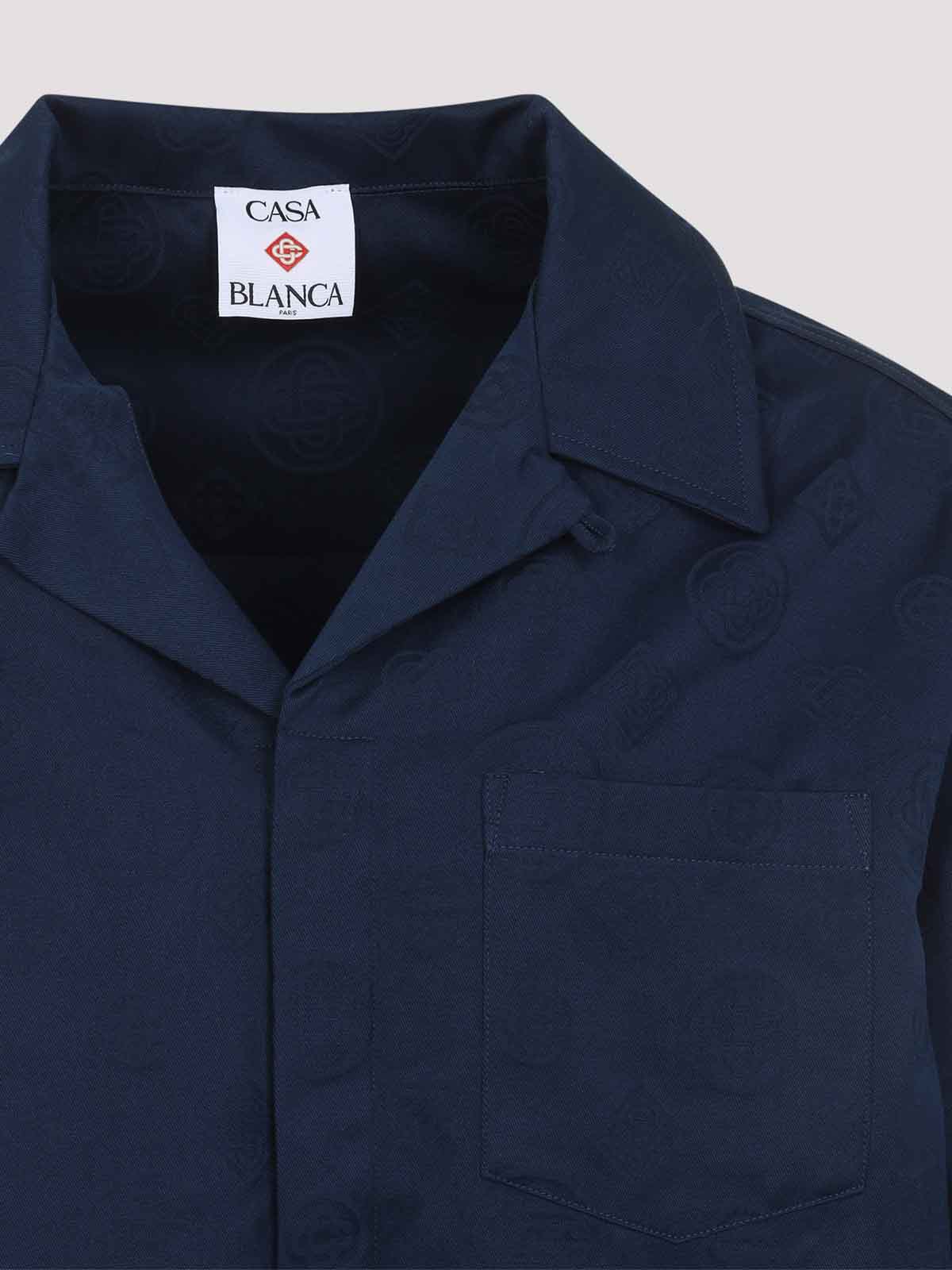 カサブランカブルーモノグラムコットンロングスリーブシャツ。ピュアブルーモノグラムコットンシャツ、ボウリングカラー、フロントボタン留め、胸パッチポケット、ロングスリーブ、ボタン付きカフス、ストレートヘム、全体に同系色のモノグラムパターンデザイン。