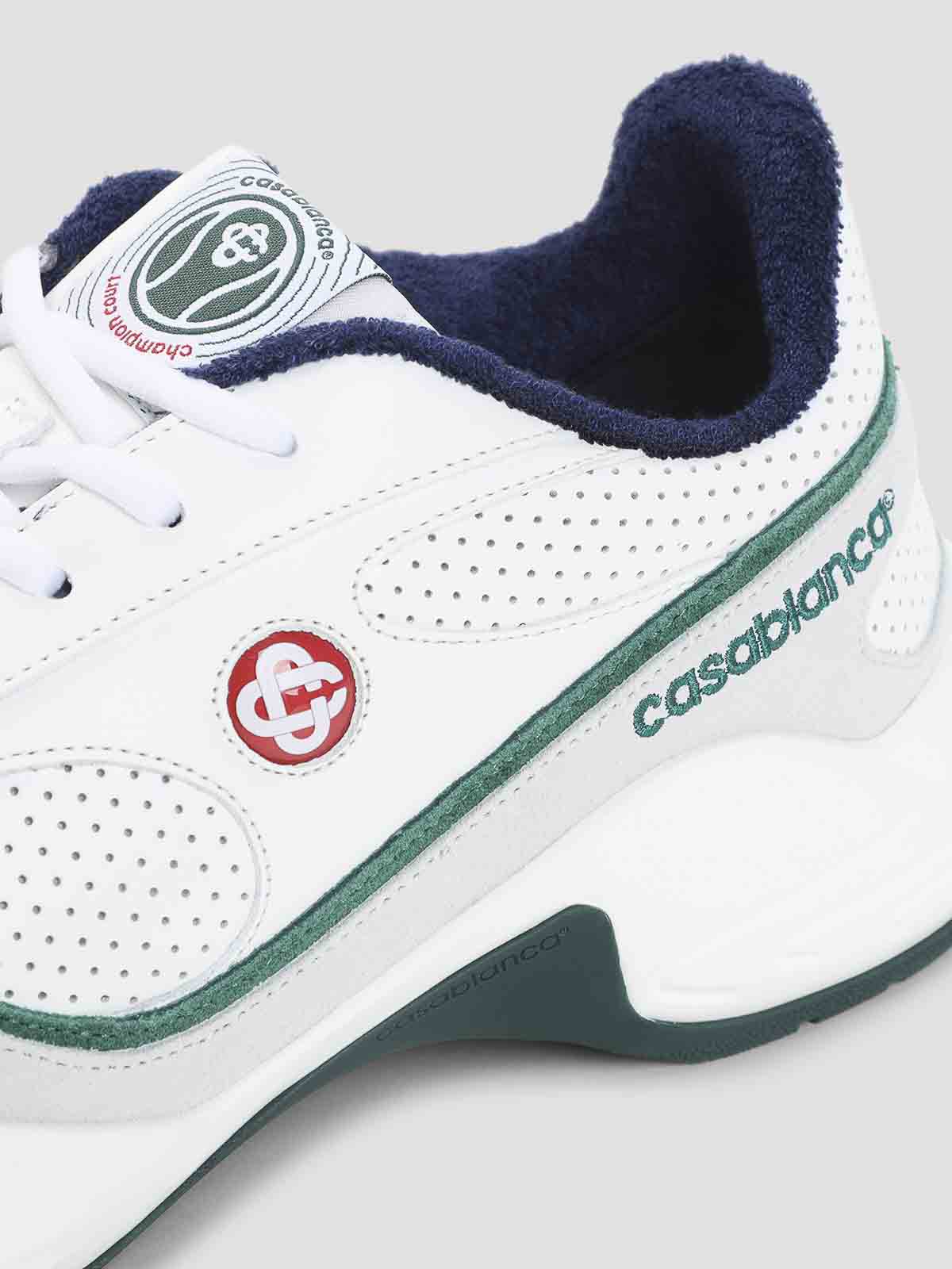 カサブランカコートチャンピオンシップホワイトレザースニーカー。ホワイトレザーと穴あきレザーインサートで作られた、ラウンドトウ、グリーンのディテール、レースアップファスナー、タンにブランドラベル、サイドにロゴ、サイドにシグネチャーの刺繍、テキスタイルの裏地、ラバーアウトソールが特徴です。