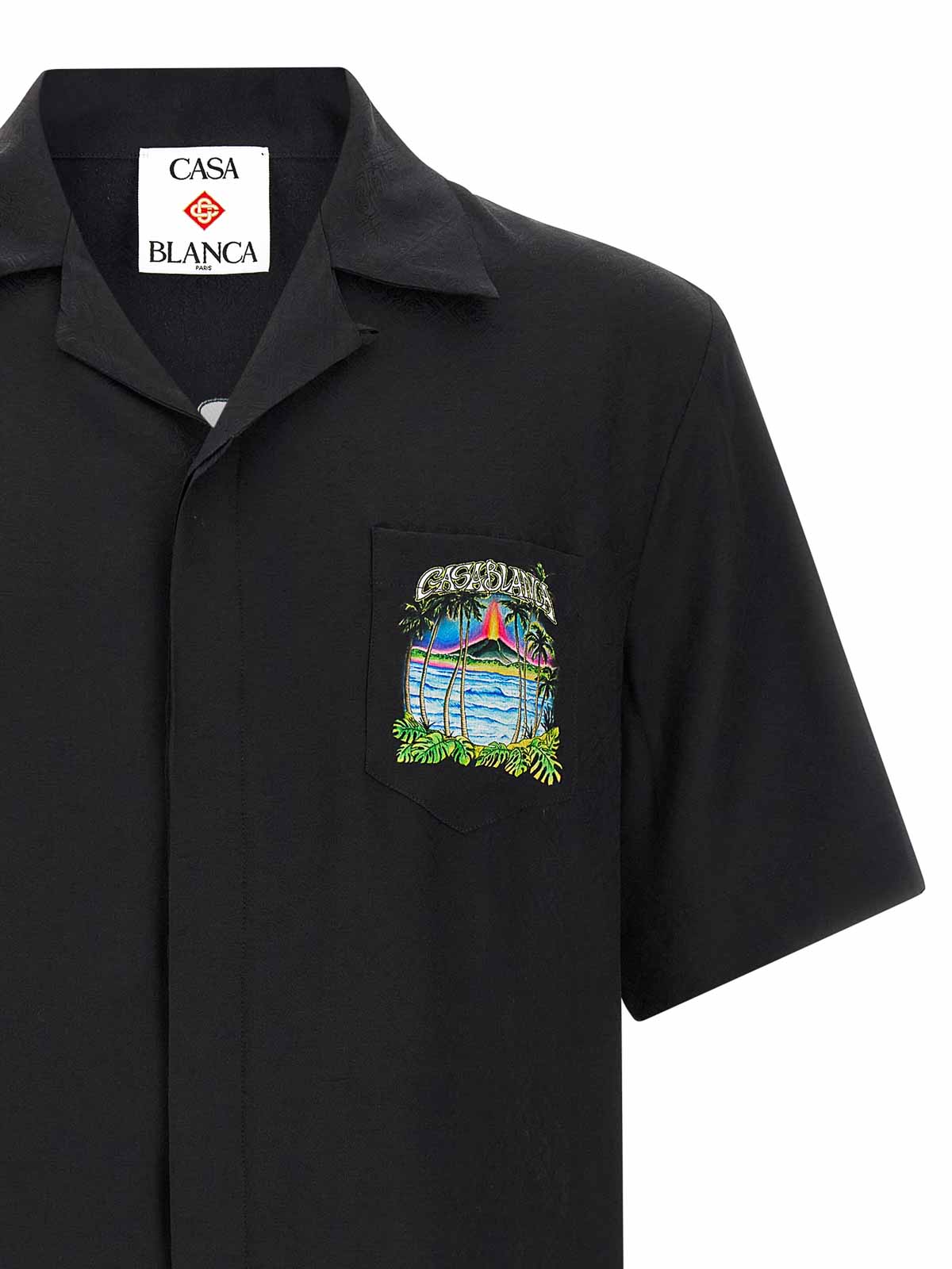 モノグラムジャカードシルクのシャツ、「ボルケーノ」のプリントをあしらったポケットとバック、フロントボタン留め、ドロップショルダー付きのショートスリーブ。