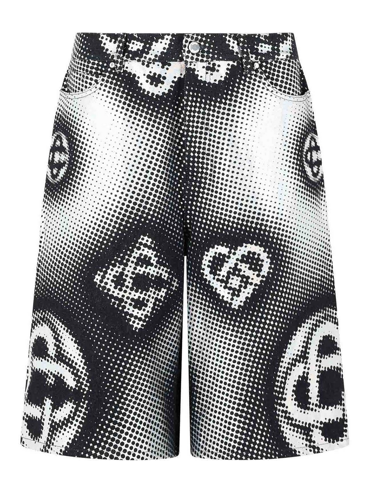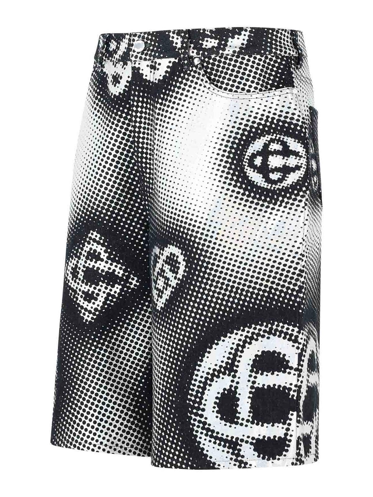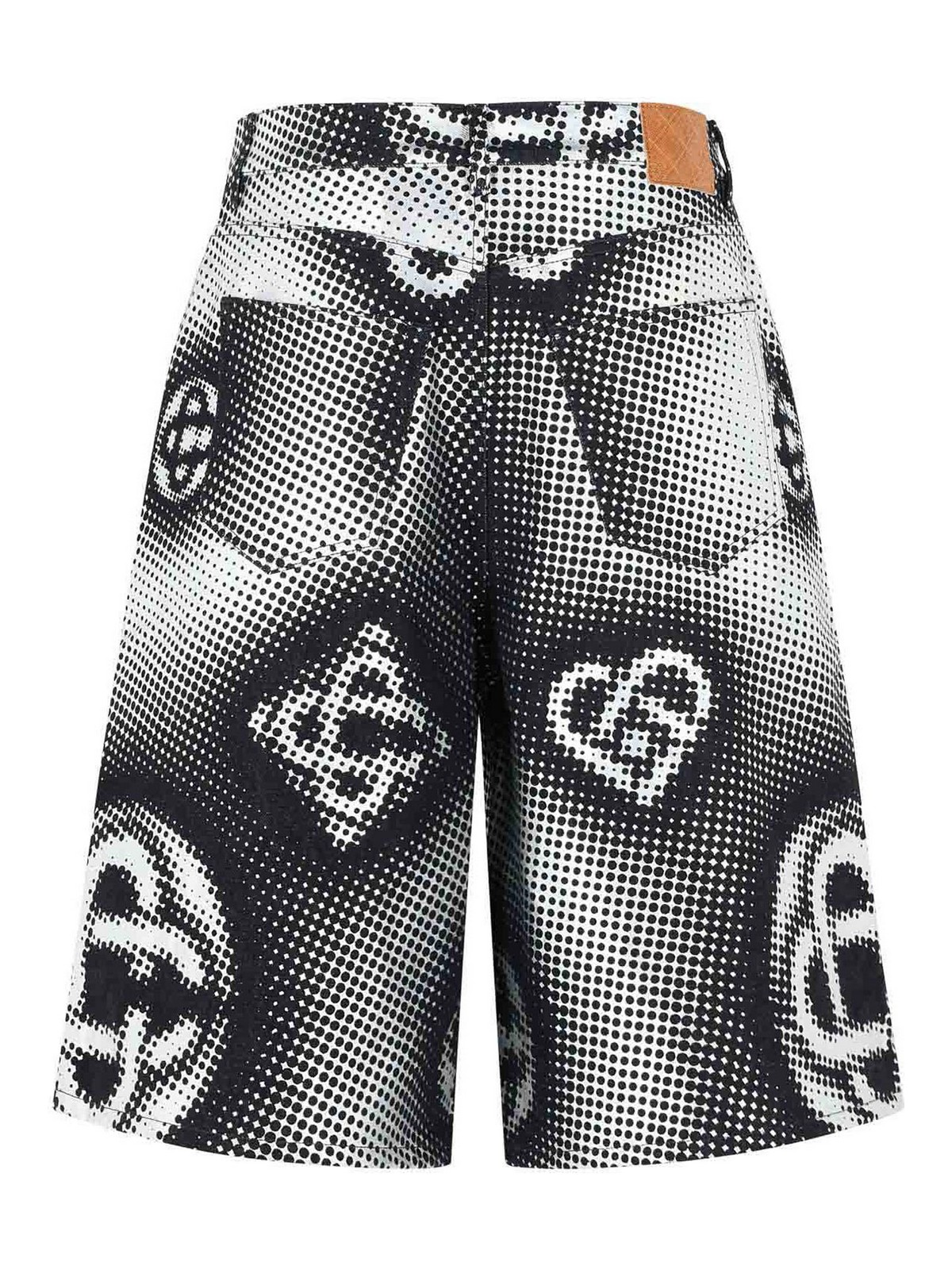 ベルトループ、ボタンとジッパー、5ポケットデザイン、パールセントエフェクトロゴモノグラムパターン、モノグラムエンボス加工ロゴパッチ