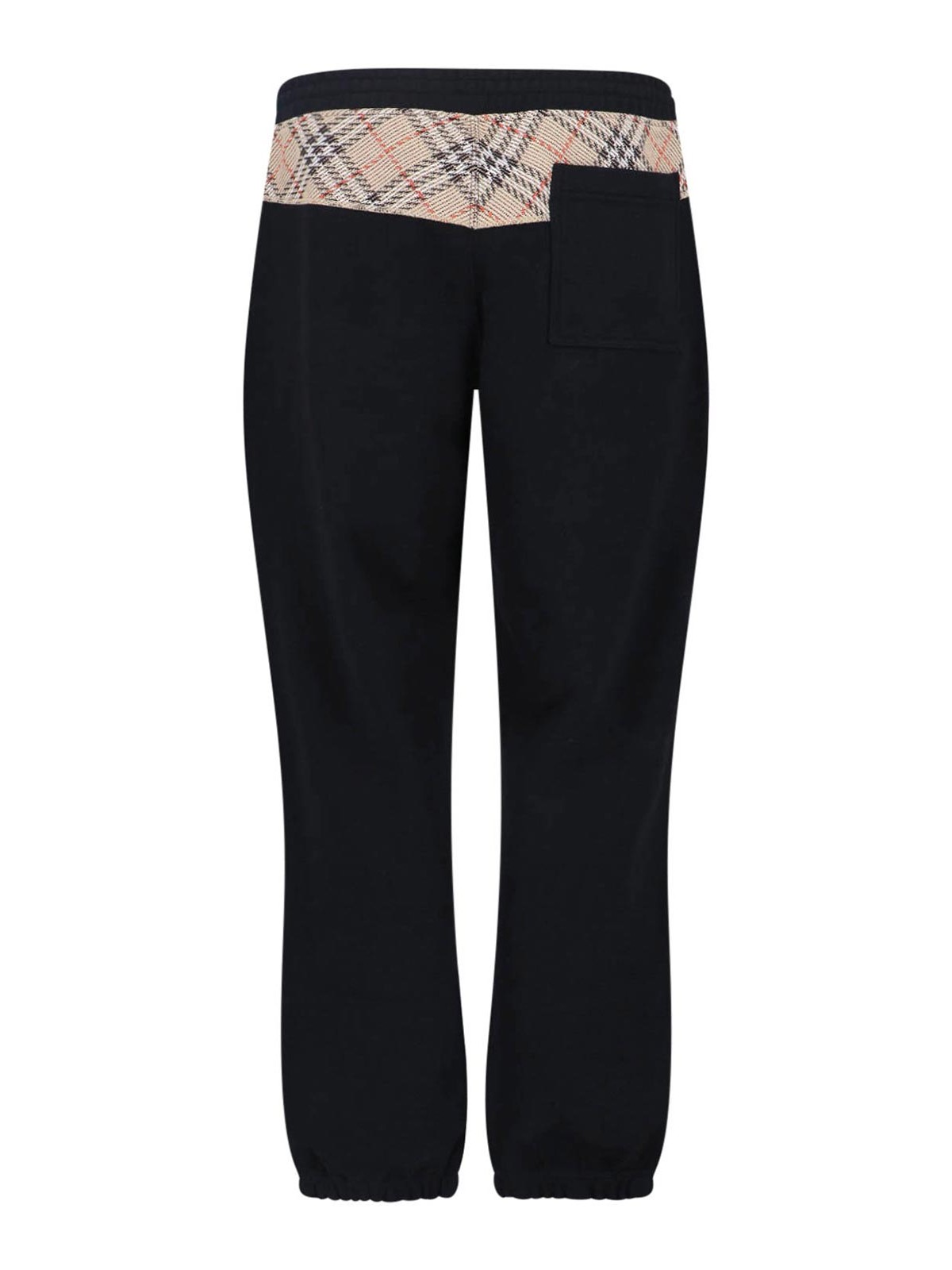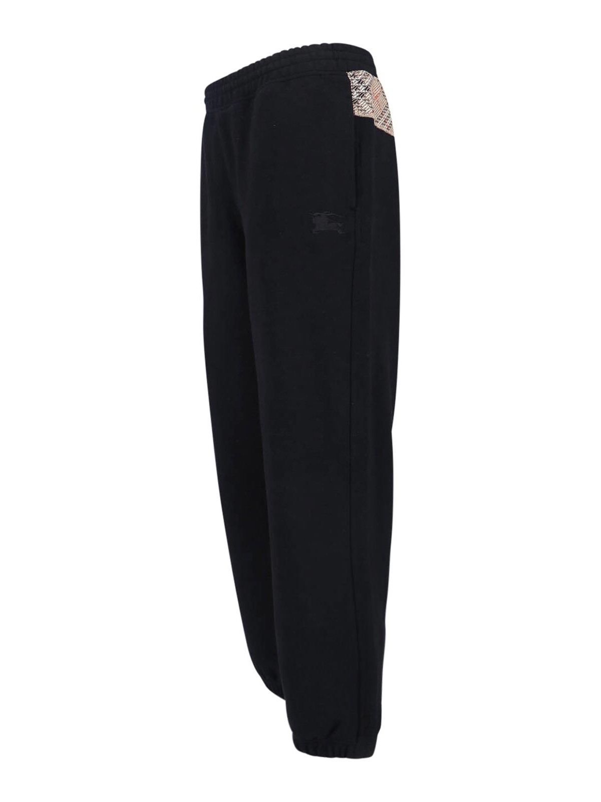 ブラックコットンのバーバリーチェックスポーツパンツ、ミディアムエラスティックウエスト、サイドポケット2つ、バックにチェックモチーフのディテール、サイドにトーンオントーンのEKDロゴの刺繍、伸縮性のあるヘム。