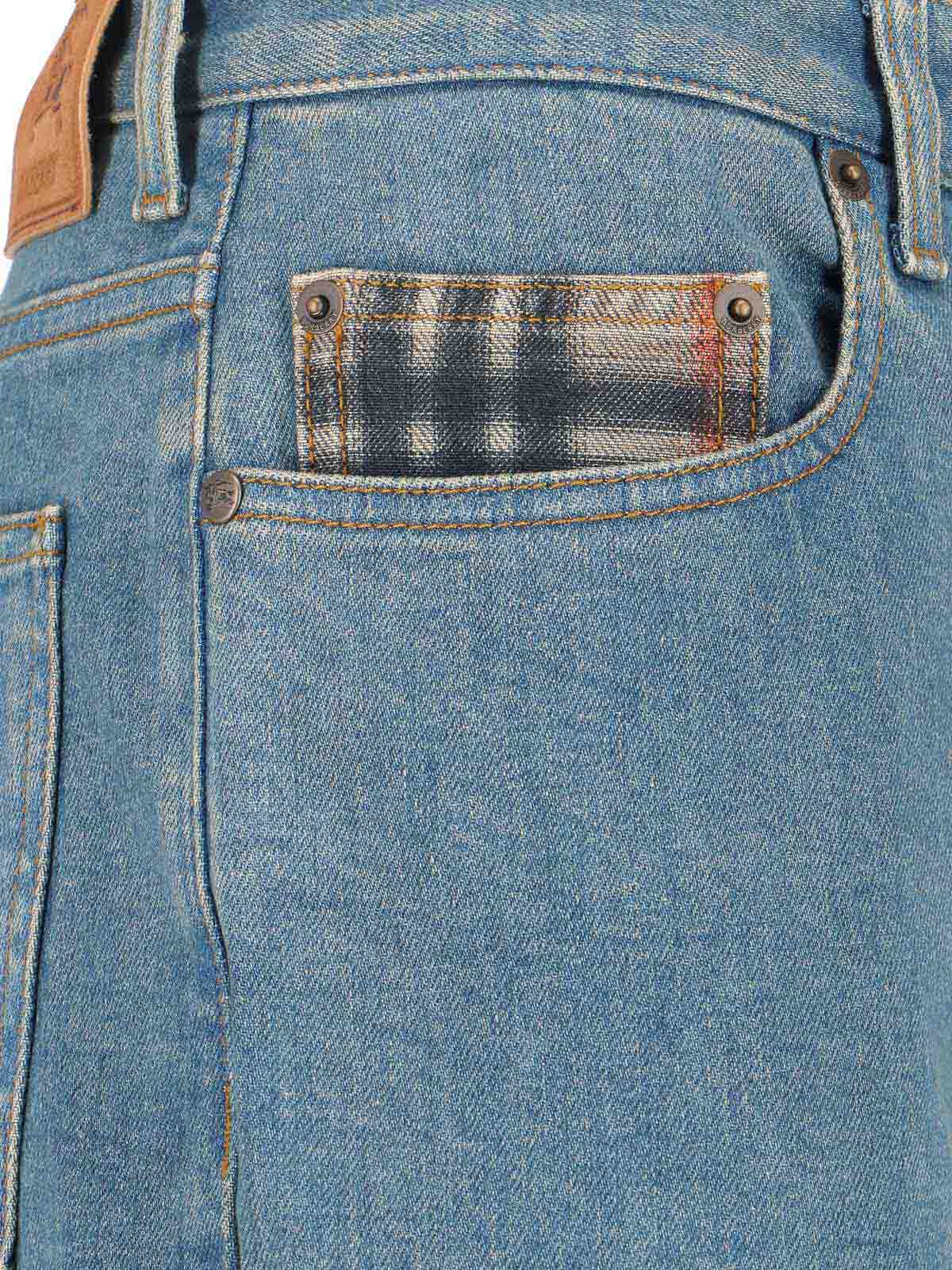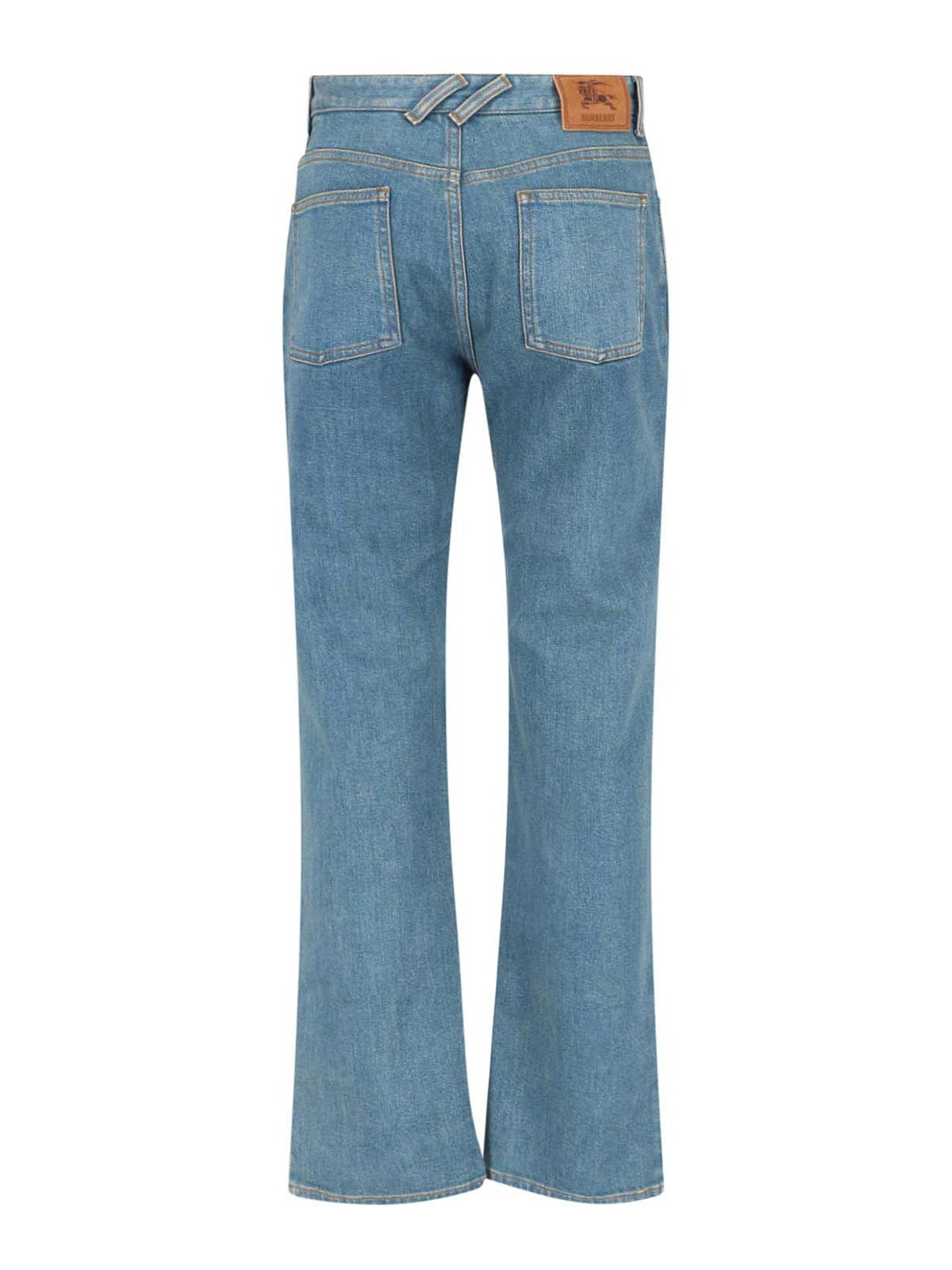 ブルーコットンデニムのバーバリーブーツカットジーンズ、ミディアムウエスト、ボタンとジッパー、ベルトループ、5ポケットデザイン、ポケットのチェックモチーフのディテール、背面にレザーロゴタグ、ストレートレッグ。