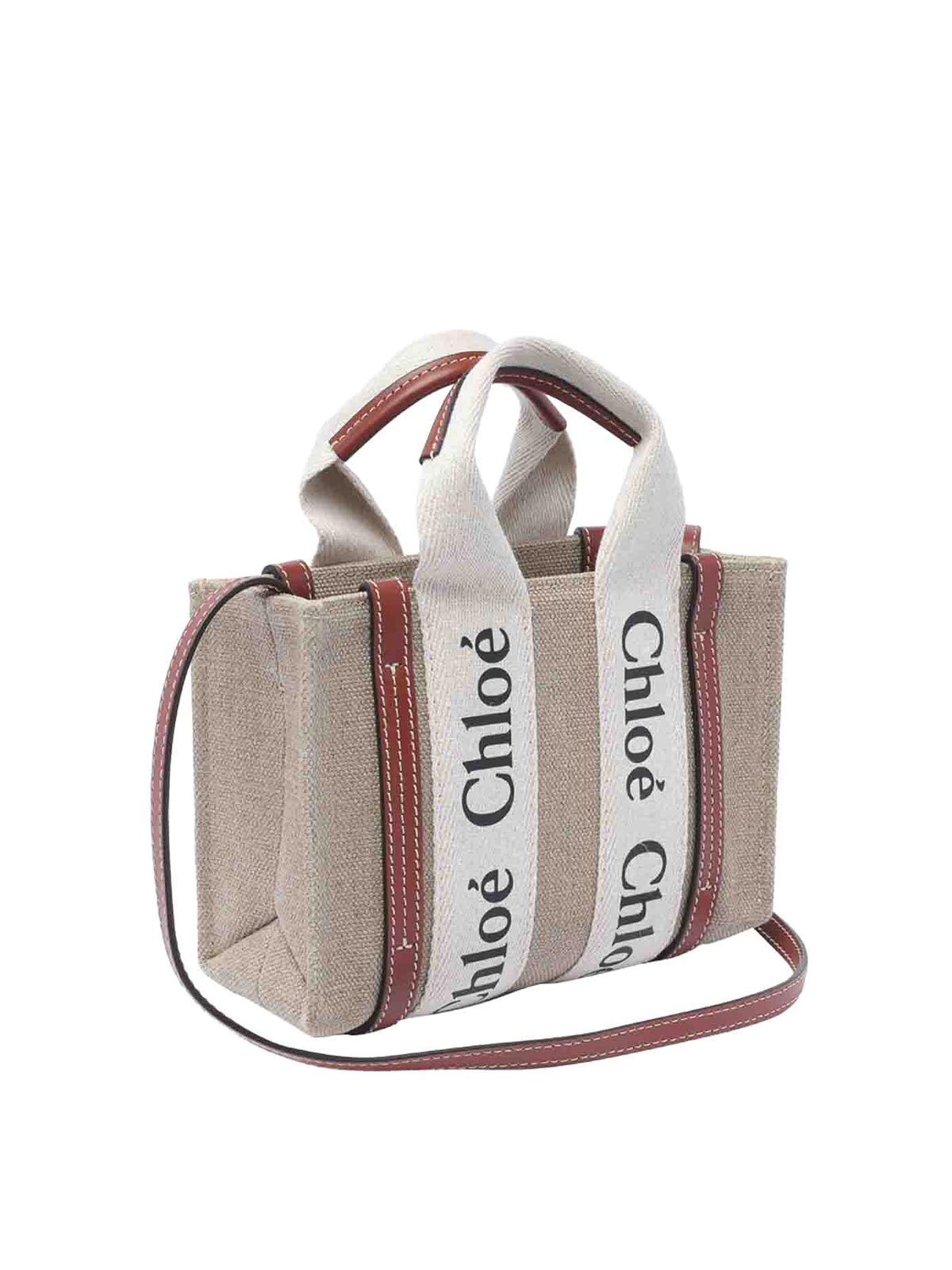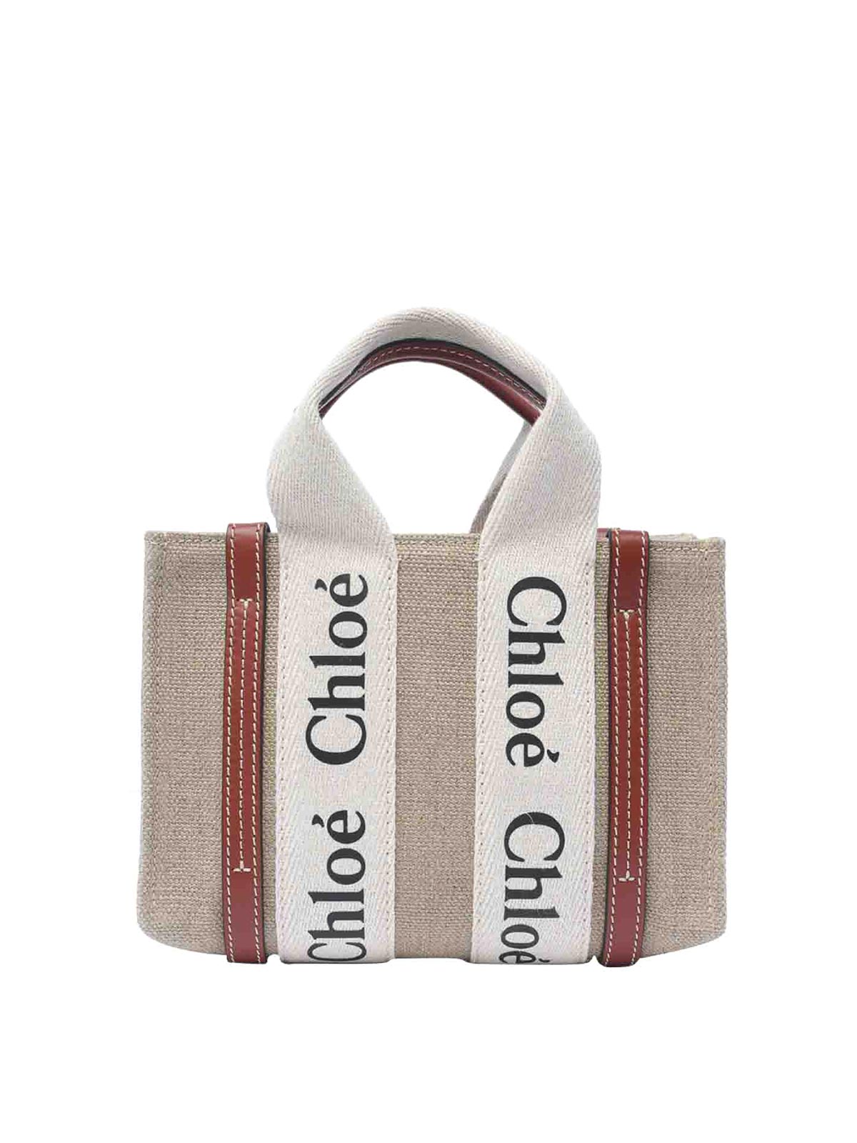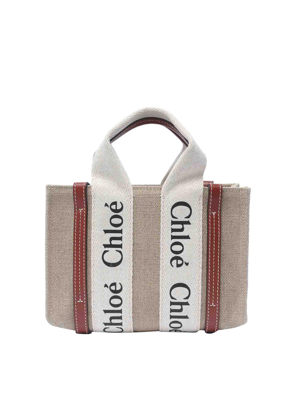 Chloe' ベージュとブラウンウッディートバッグオープンポケットハンドル調節可能で取り外し可能なショルダーストラップロゴミニモデル