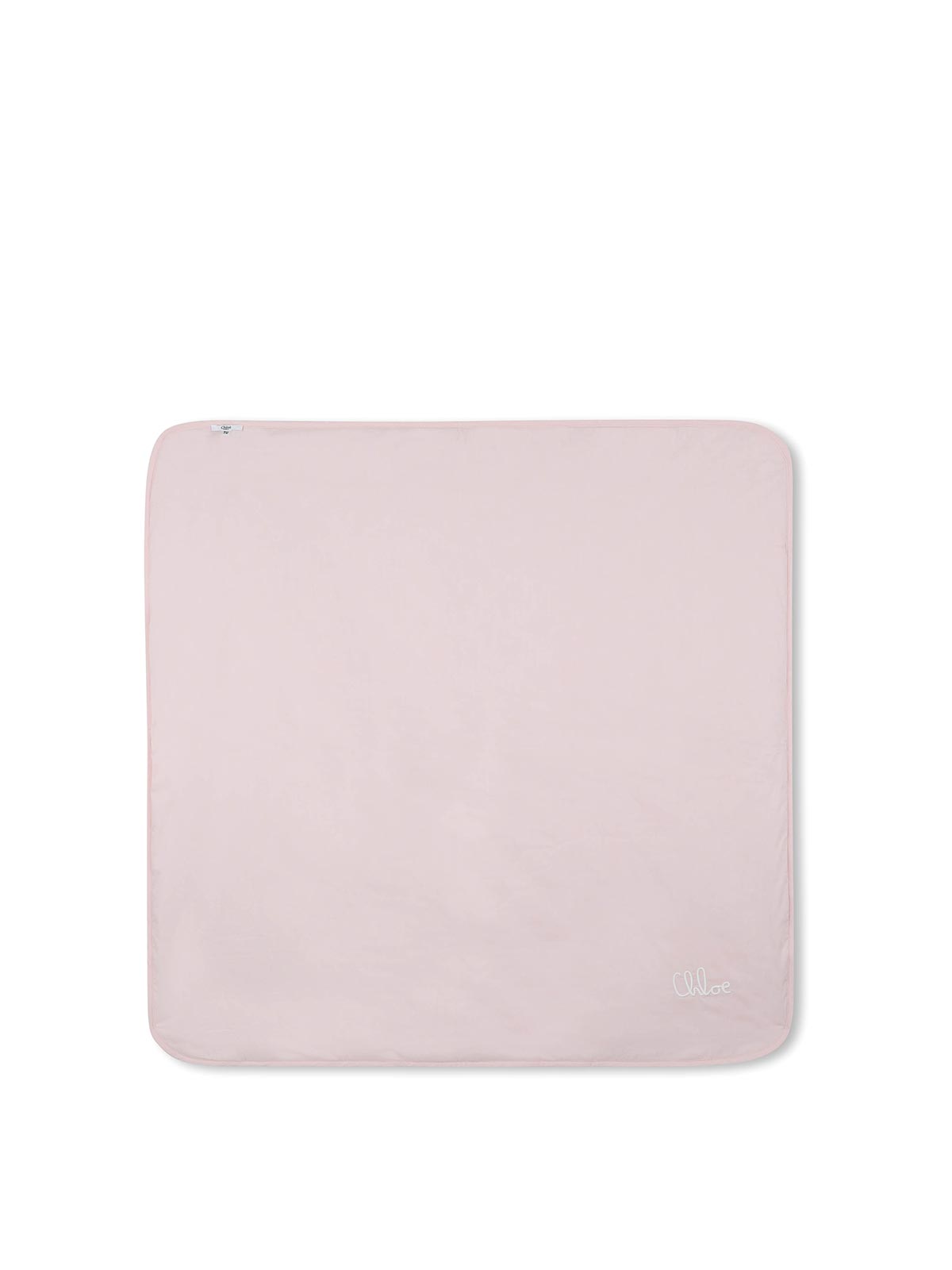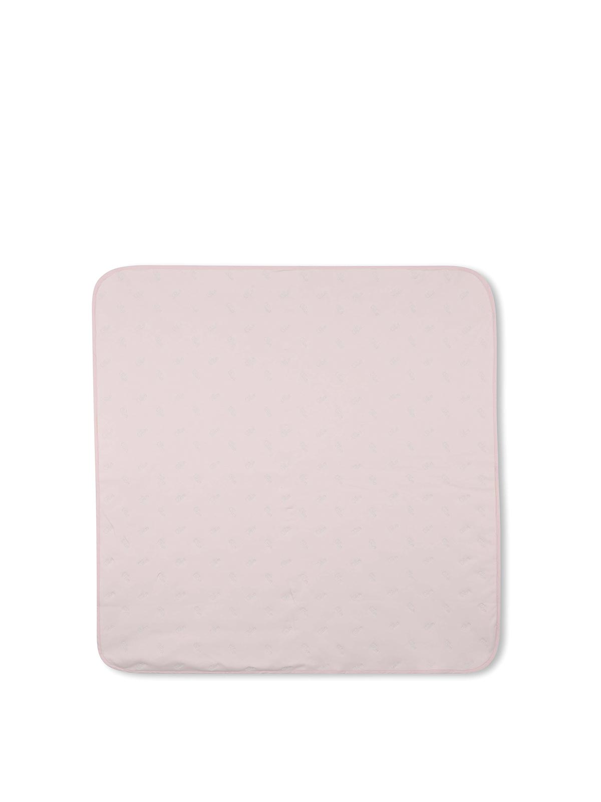 背面にスナップボタン付きのライトピンクのロゴ刺繍、お揃いのブランケットシューズ付き、ピュアオーガニック