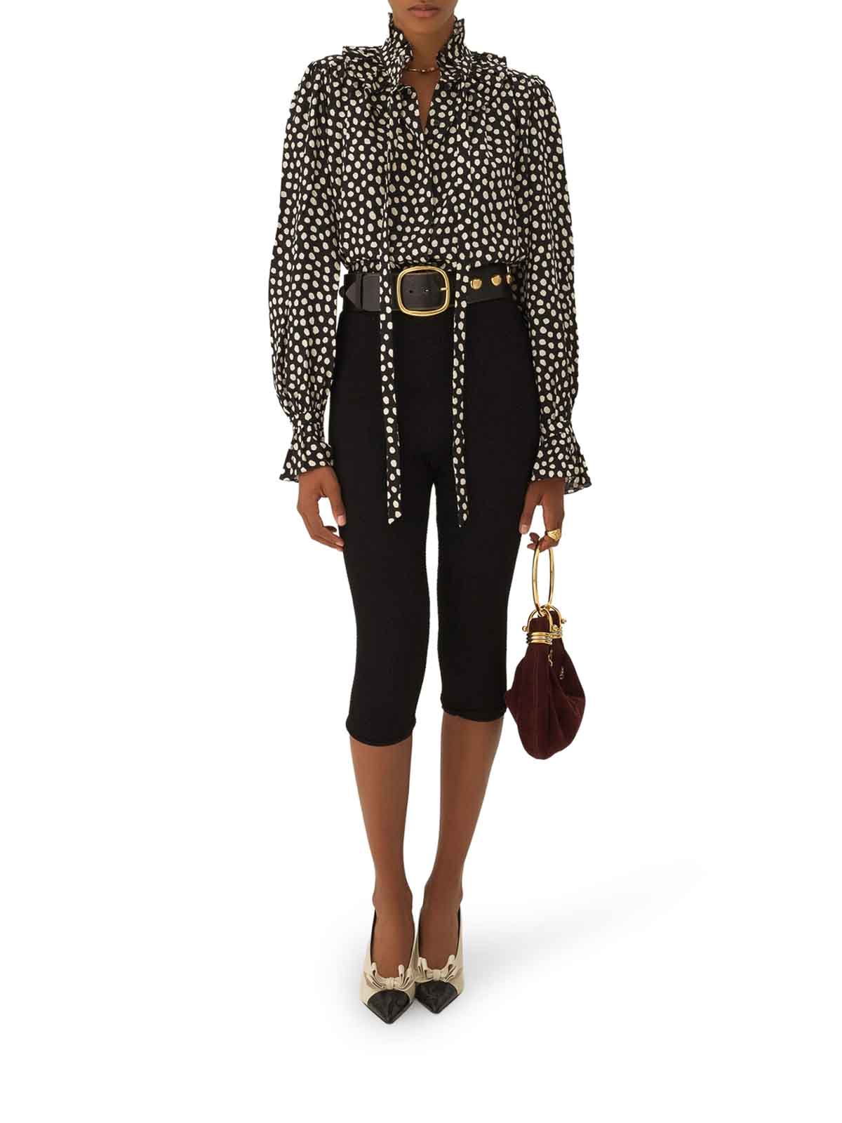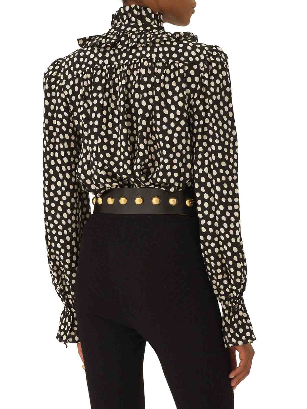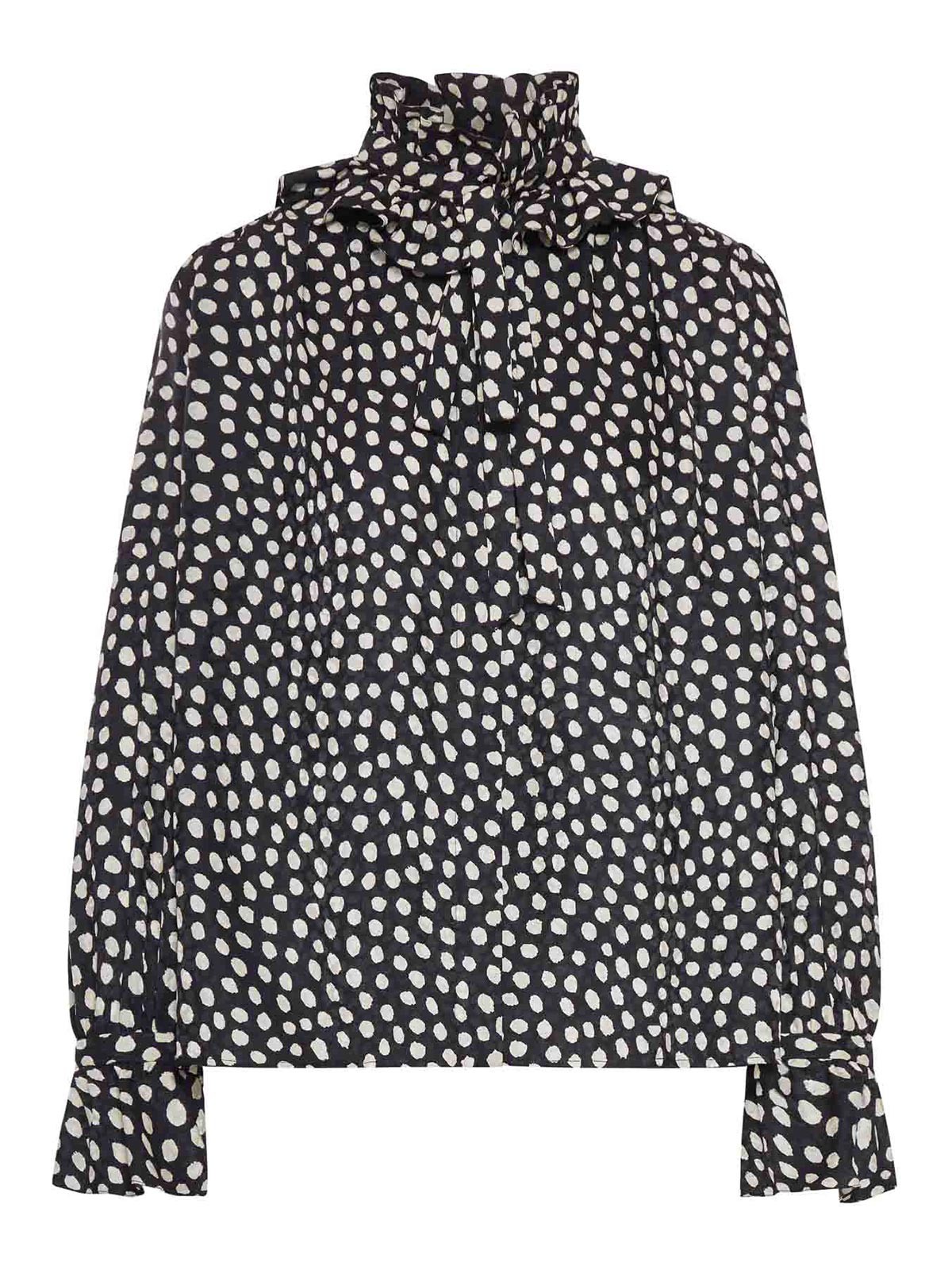 フロントにシルクジャカードでフリルとリボンが付いたブラウス、プリントされたシルクブラウス、フロントにリボン、フロントとカフスにマザーオブパールボタン、フロントとカフスにマザーオブパールボタン、フリルブラウスの外側:シルク 100%、ボタン:100%マザーオブパール、フィット:ルーズ、モデルの身長は178cm、サイズ36を着用しています。色:黒
