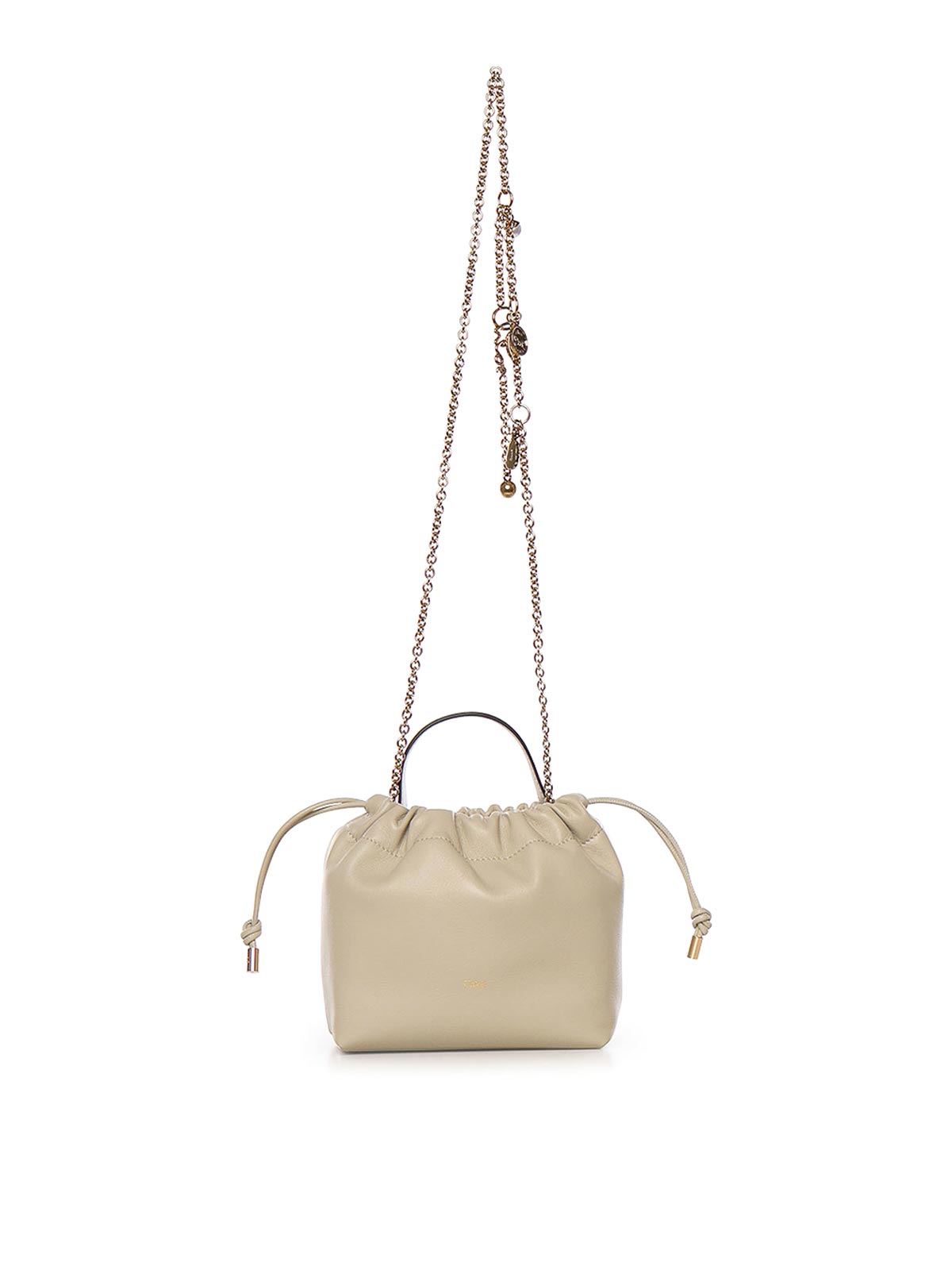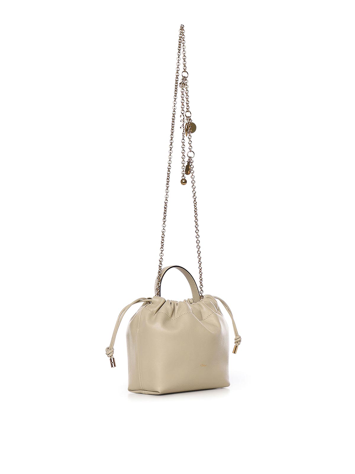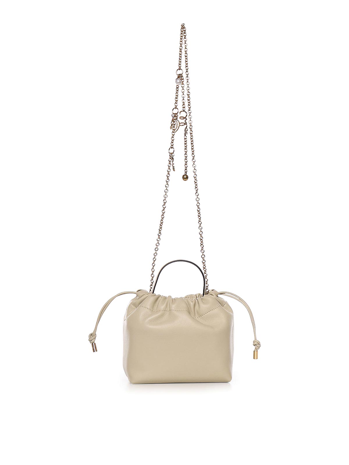 ラムスキン製、ドローストリングクロージャー、トップハンドル、エンボス加工チェーン、内側はイタリア製、寸法:17 x 16 x 8 cm、デザイナーカラー:クラウディクリーム