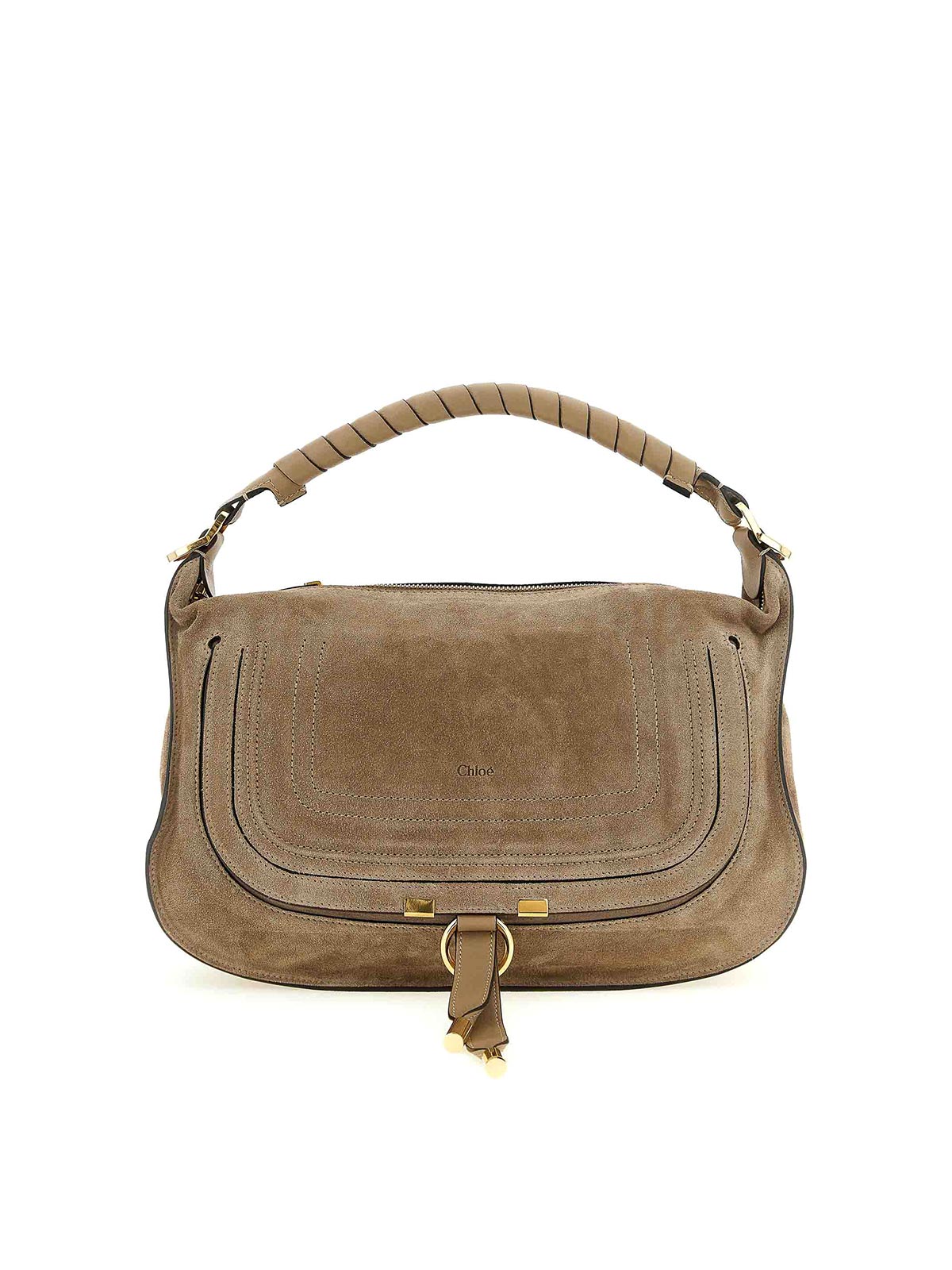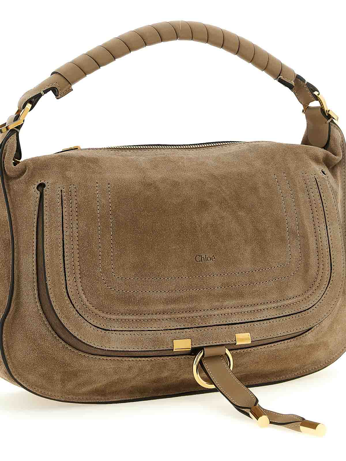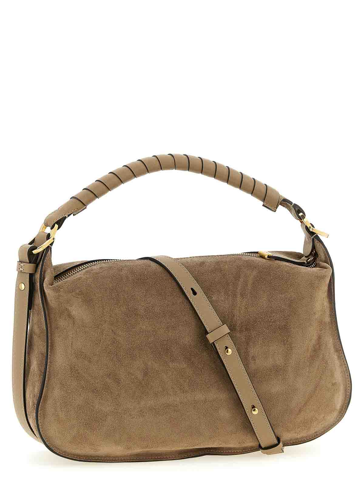 サドルステッチを施した小さな「マーシー」スエードショルダーバッグ、タッセル付きフラップクロージャー付きフロントポケット、固定式手巻きハンドル、上部ジッパー、調節可能で取り外し可能なショルダーストラップ。
