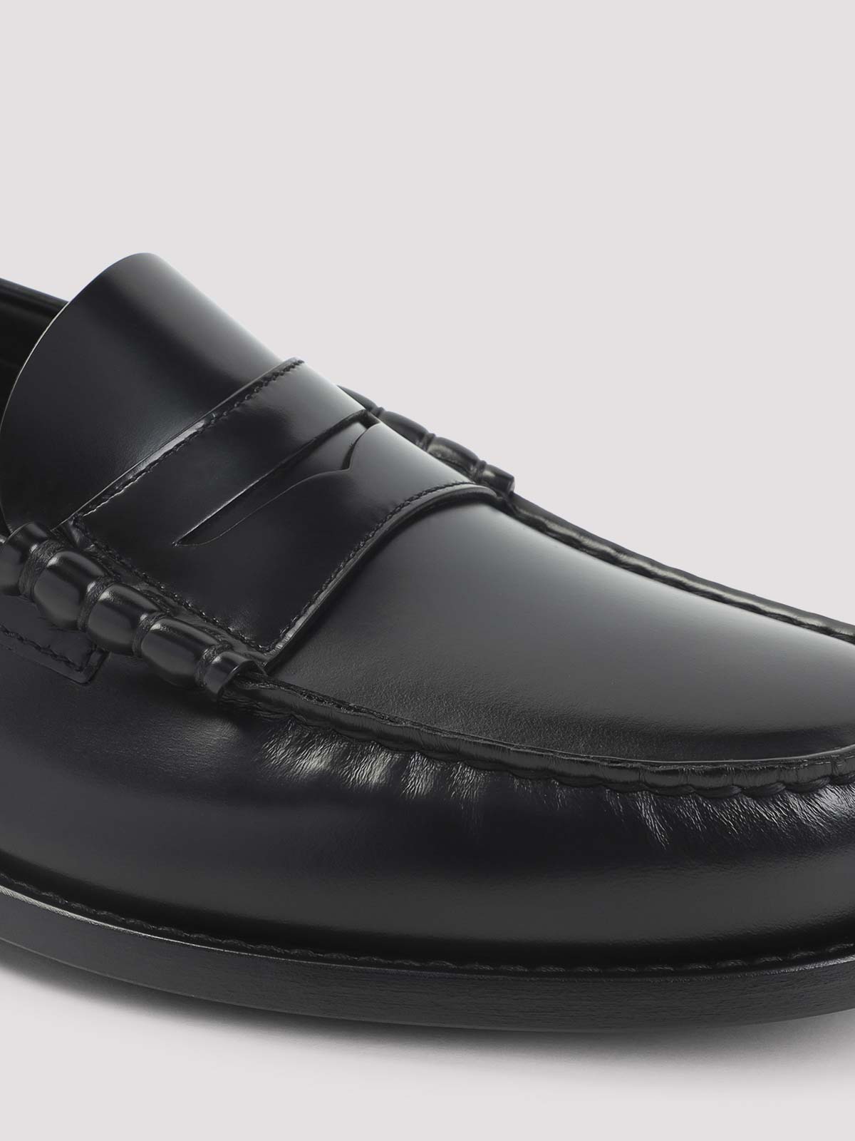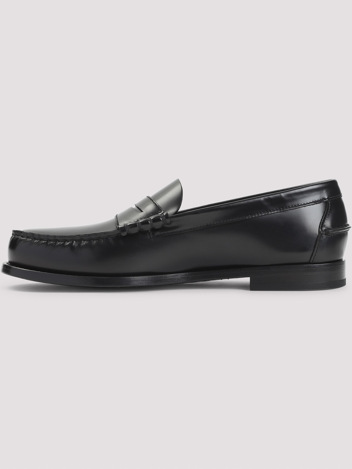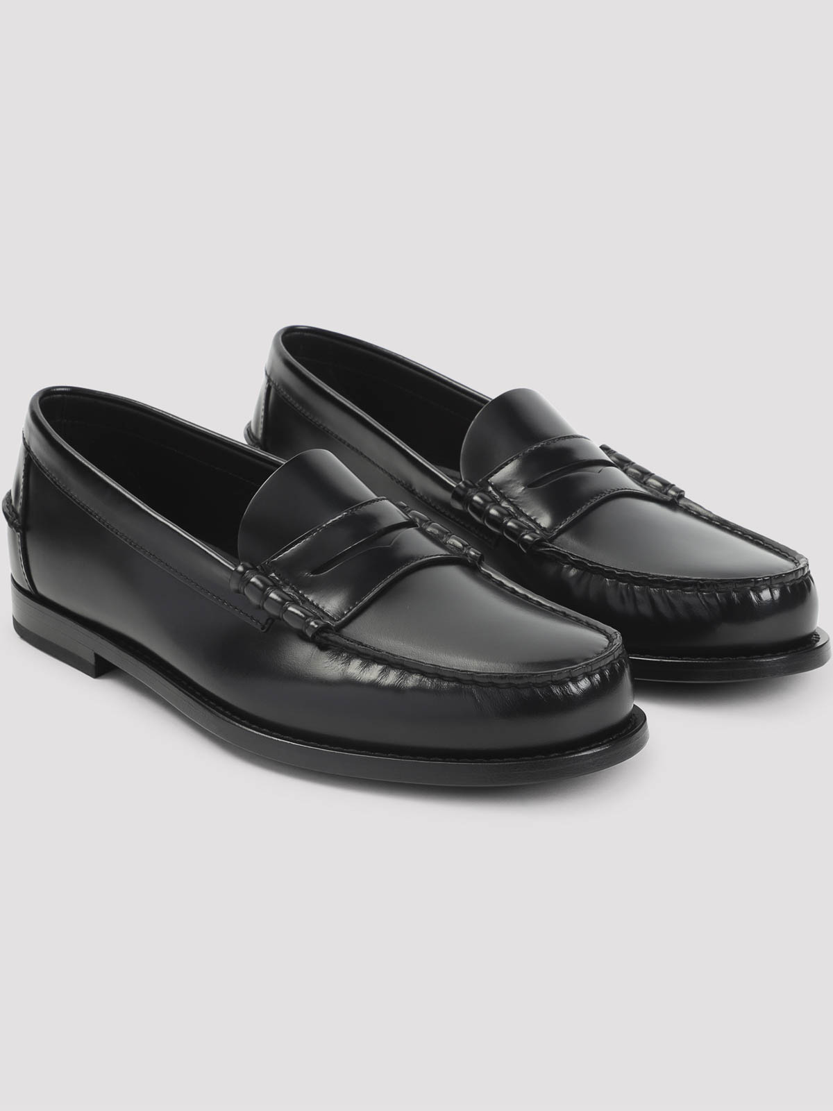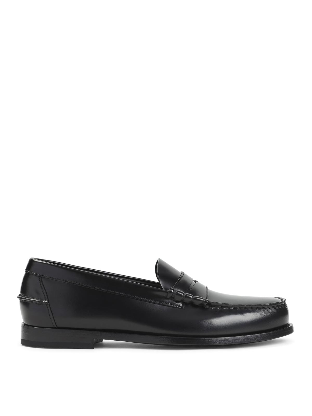 チャーチズブラックカーフレザーロザーローファー。ピュアブラックカーフレザーローファー、ラウンドトウ、トップペニースロット、スリッポンスタイル、バックエンボスステッチトーナルソール。