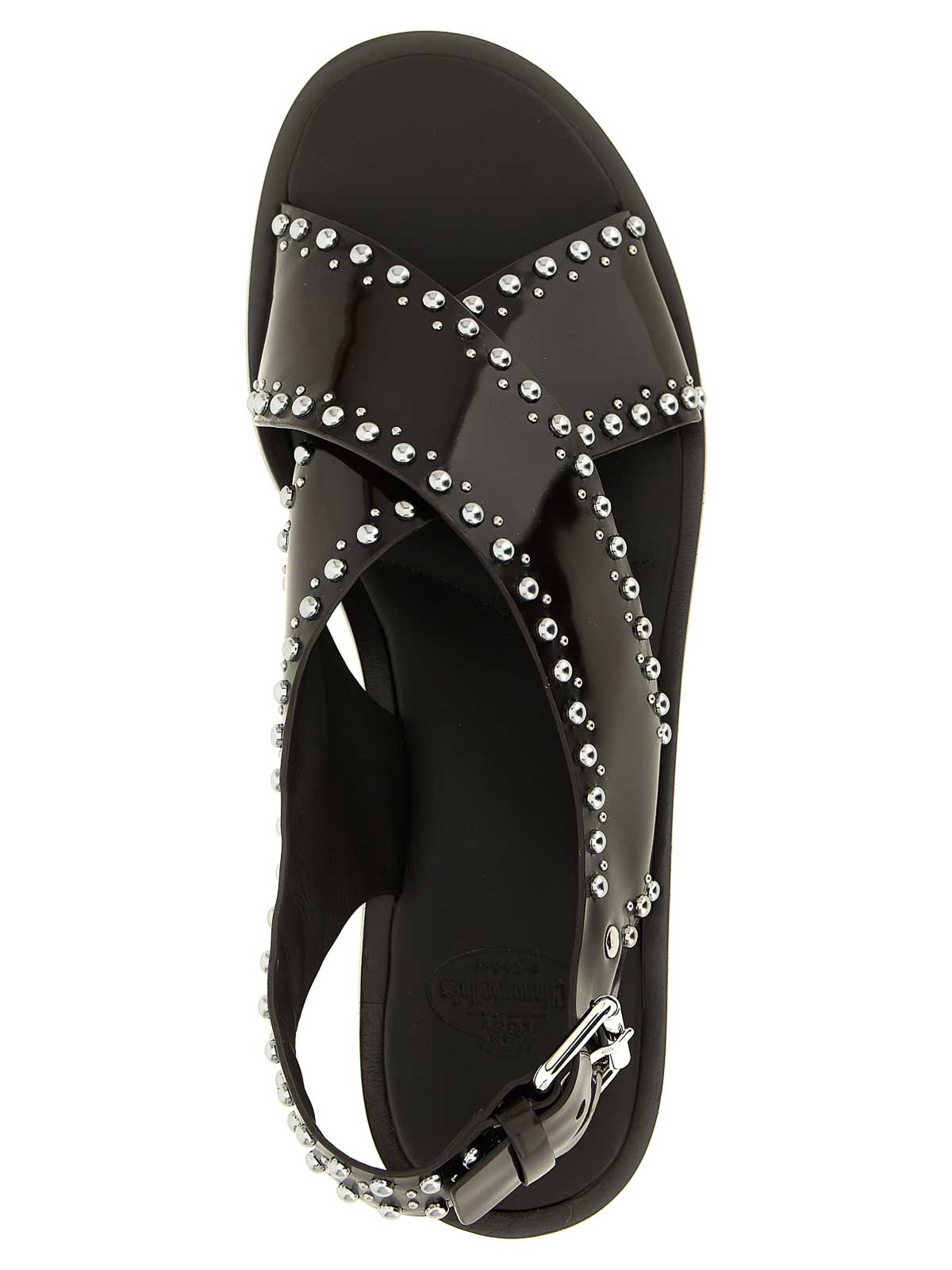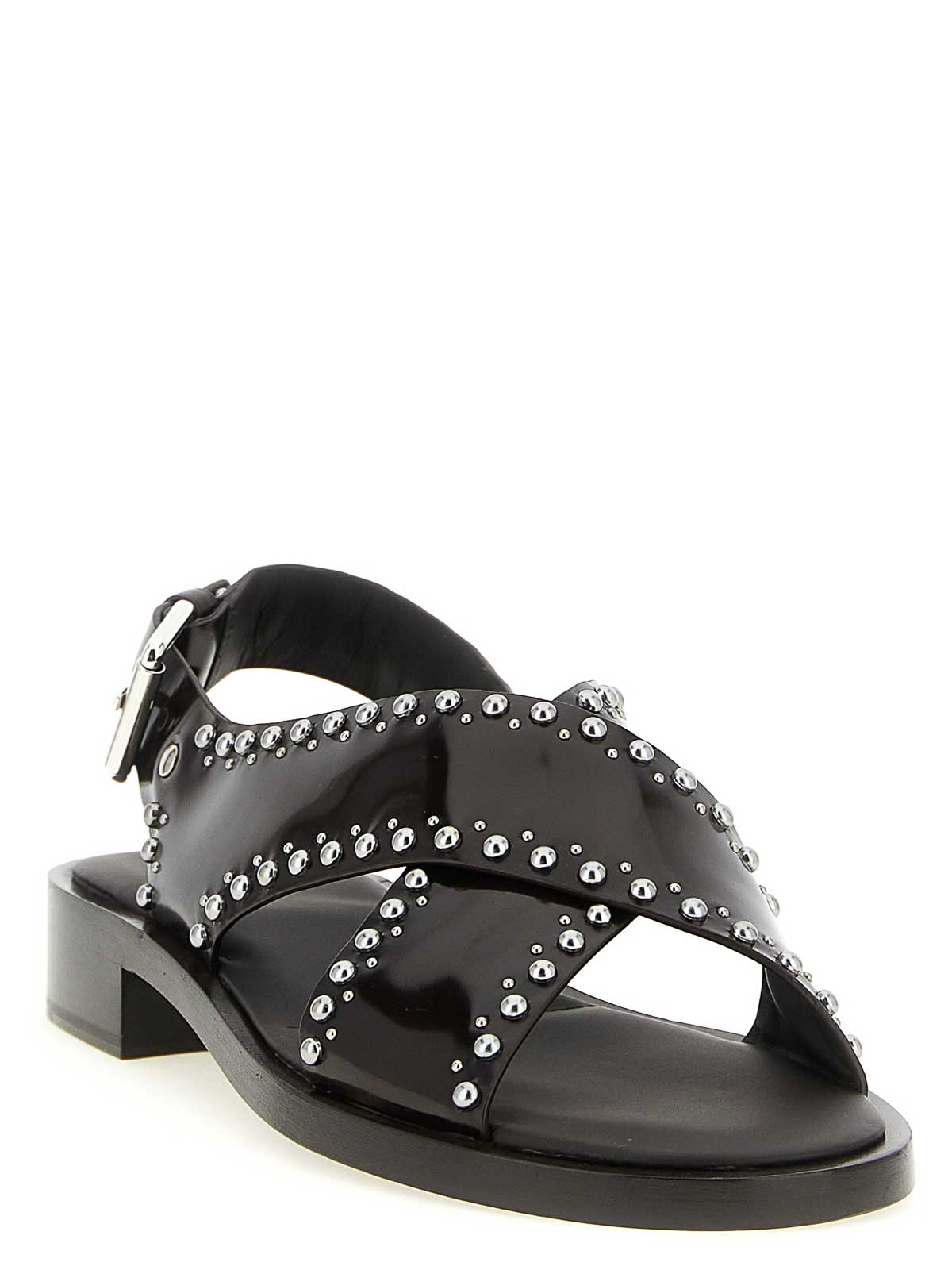 メタルスタッドアップリケ、インターロッキングストラップ、調節可能なストラップ、パッド入りインソール、レザー、ラバーソールが付いたスモーキーシャイニーレザーのレミサンダル。カラー:ベリーブラウン