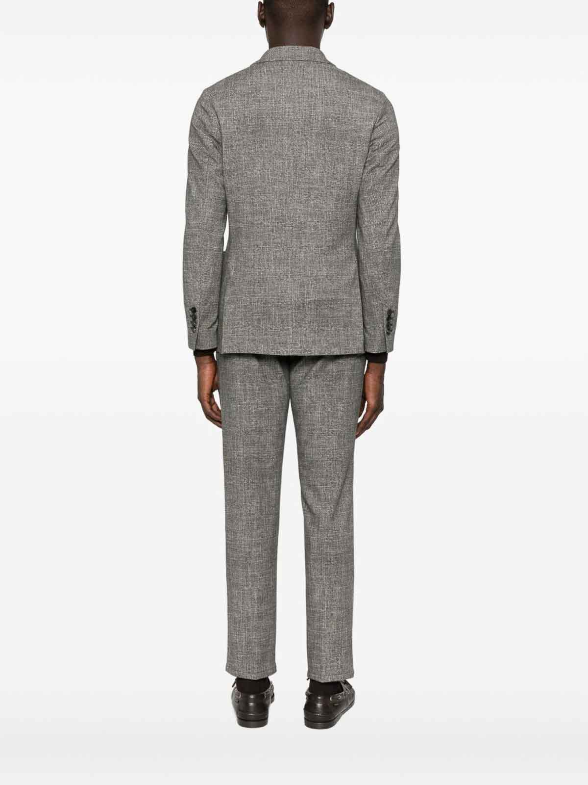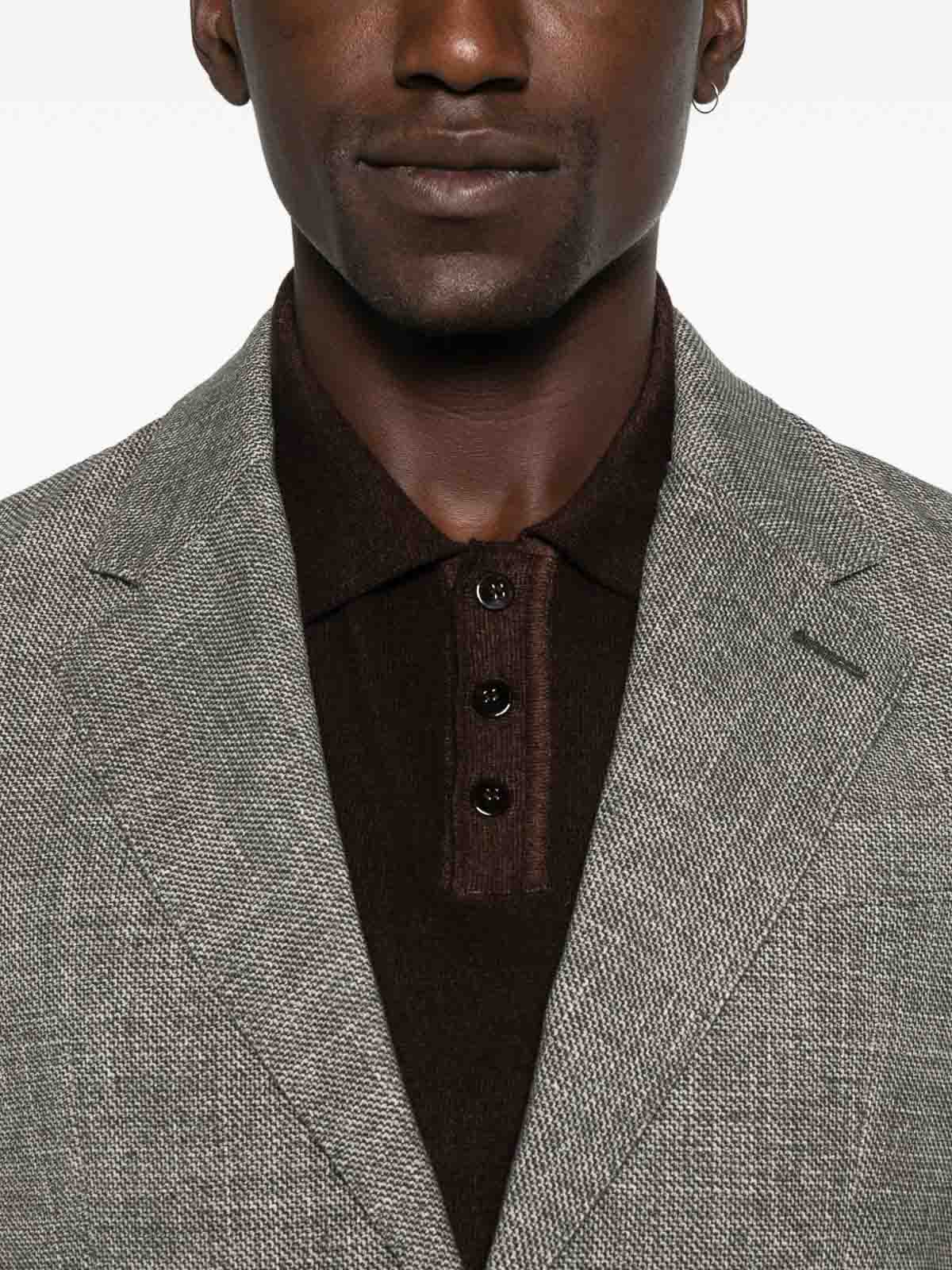グレーのボタンプラケット、ノッチドラペル、カーブした裾が特徴