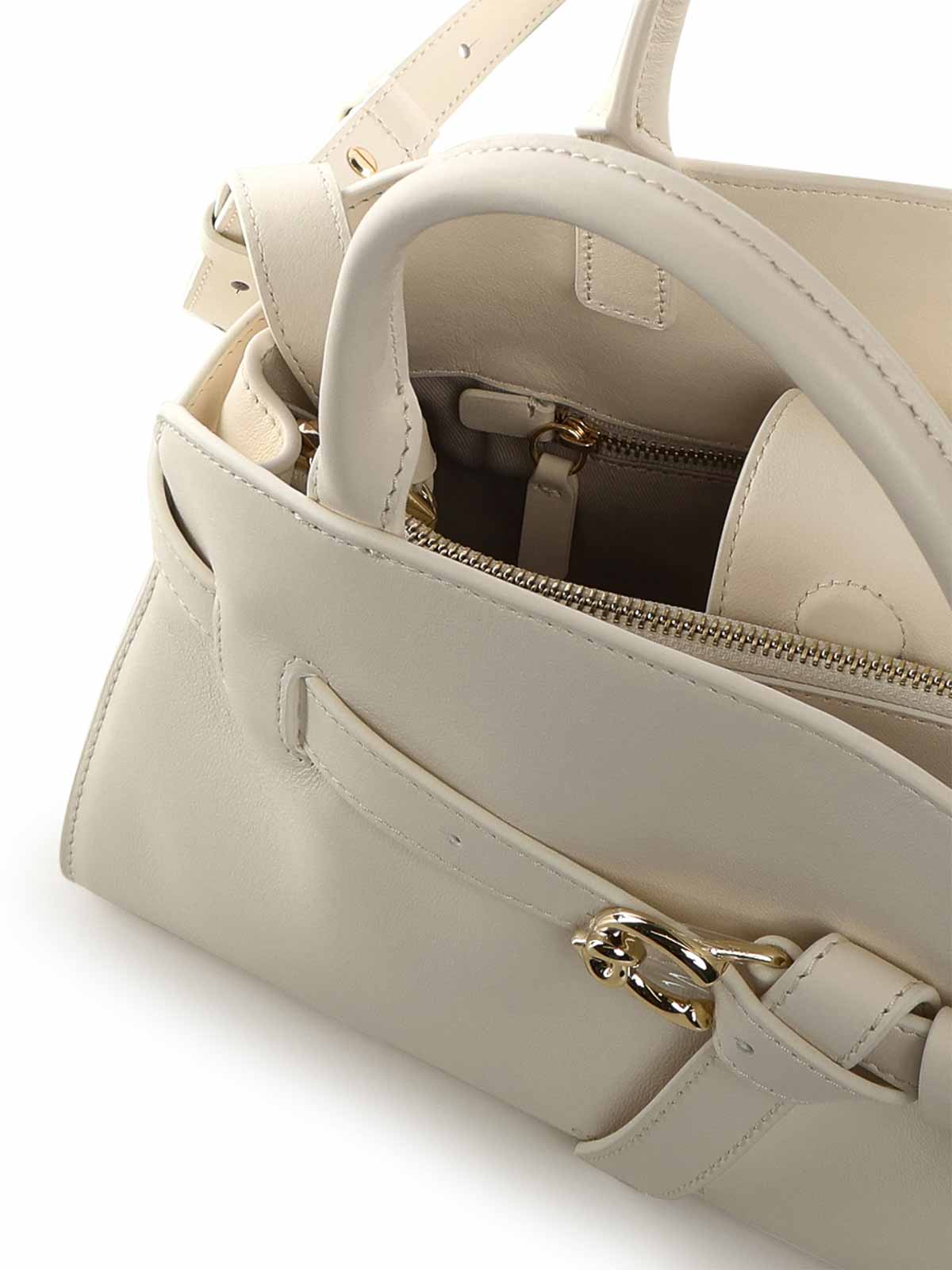 スムースレザー製、マグネットクロージャー、レザーハンドル、調節可能で取り外し可能なショルダーストラップ、ロゴレタリング、寸法:29 x 21 x 10 cm、デザイナーカラー:パール