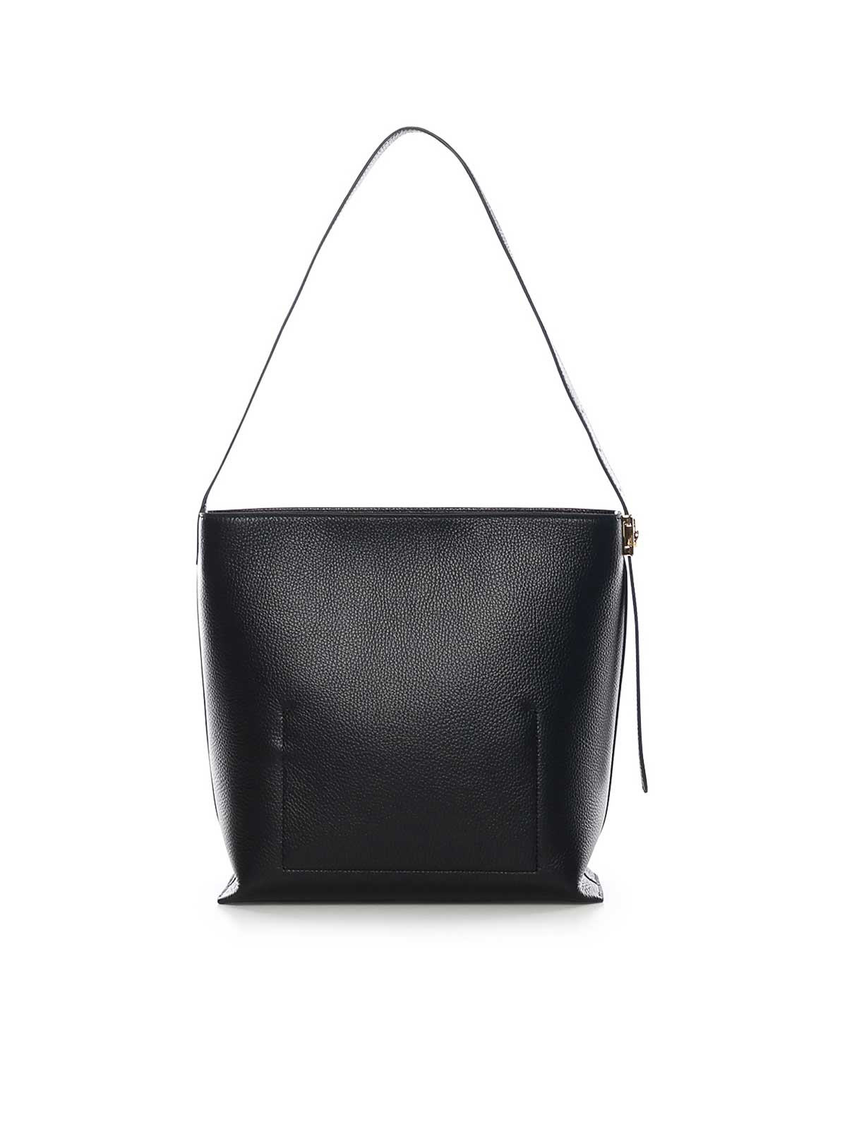 グレインレザー製、ファスナー開閉、トップレザーハンドル、レタリングロゴ、寸法:29 x 31 x 10 cm、色:黒