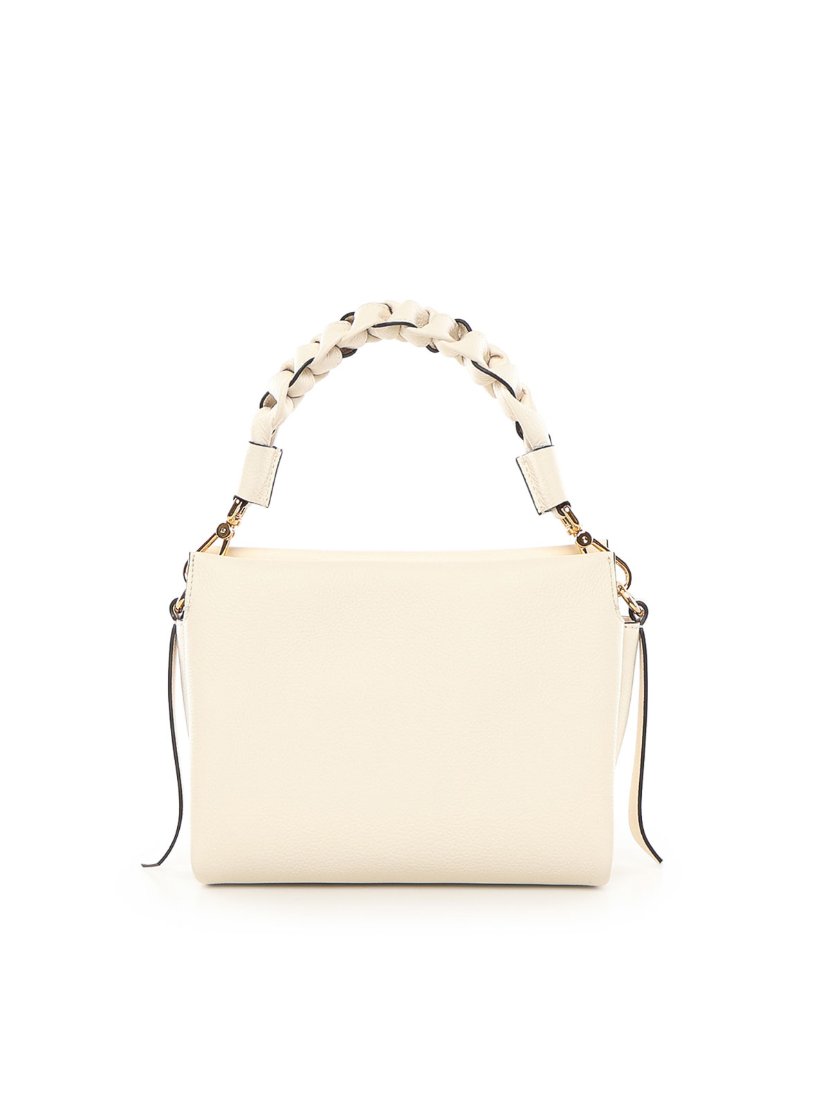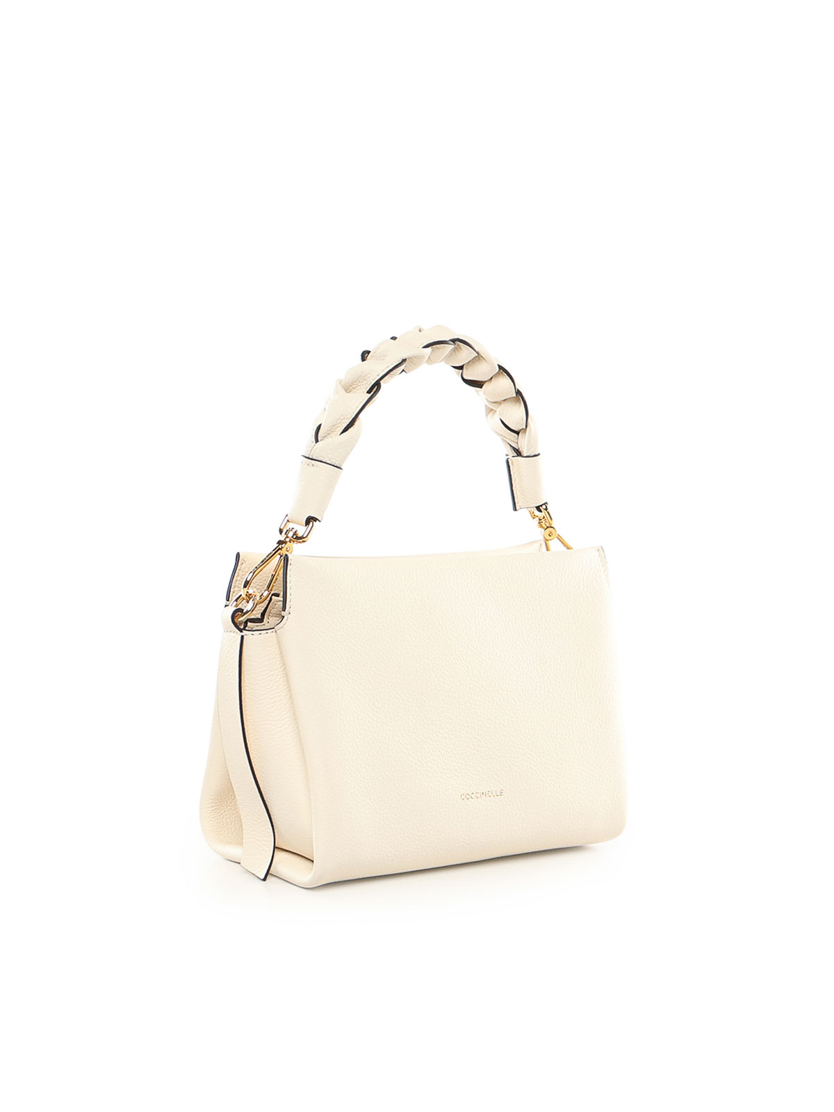 ダブルレザー製、ファスナー開閉、編み込みハンドル、手持ちでも肩掛けでも持ち運び可能、マグネットで閉じる2つのコンパートメント、取り外し可能で調節可能なショルダーストラップ、寸法:23 x 18 x 10 cm、デザイナーカラー:パール、コニャック