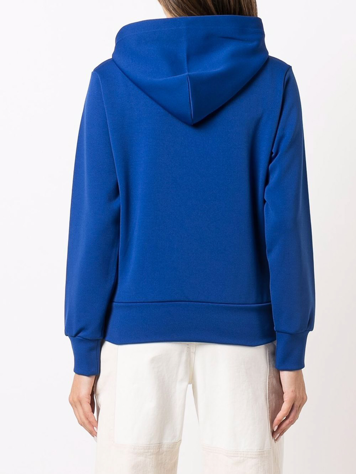Comme des Garcons playのロイヤルブルーのハート刺繍プルオーバーパーカーは、ハートモチーフ、ドローストリングフード、ロングスリーブ、フロントポーチポケット、ストレートヘムが特徴です。