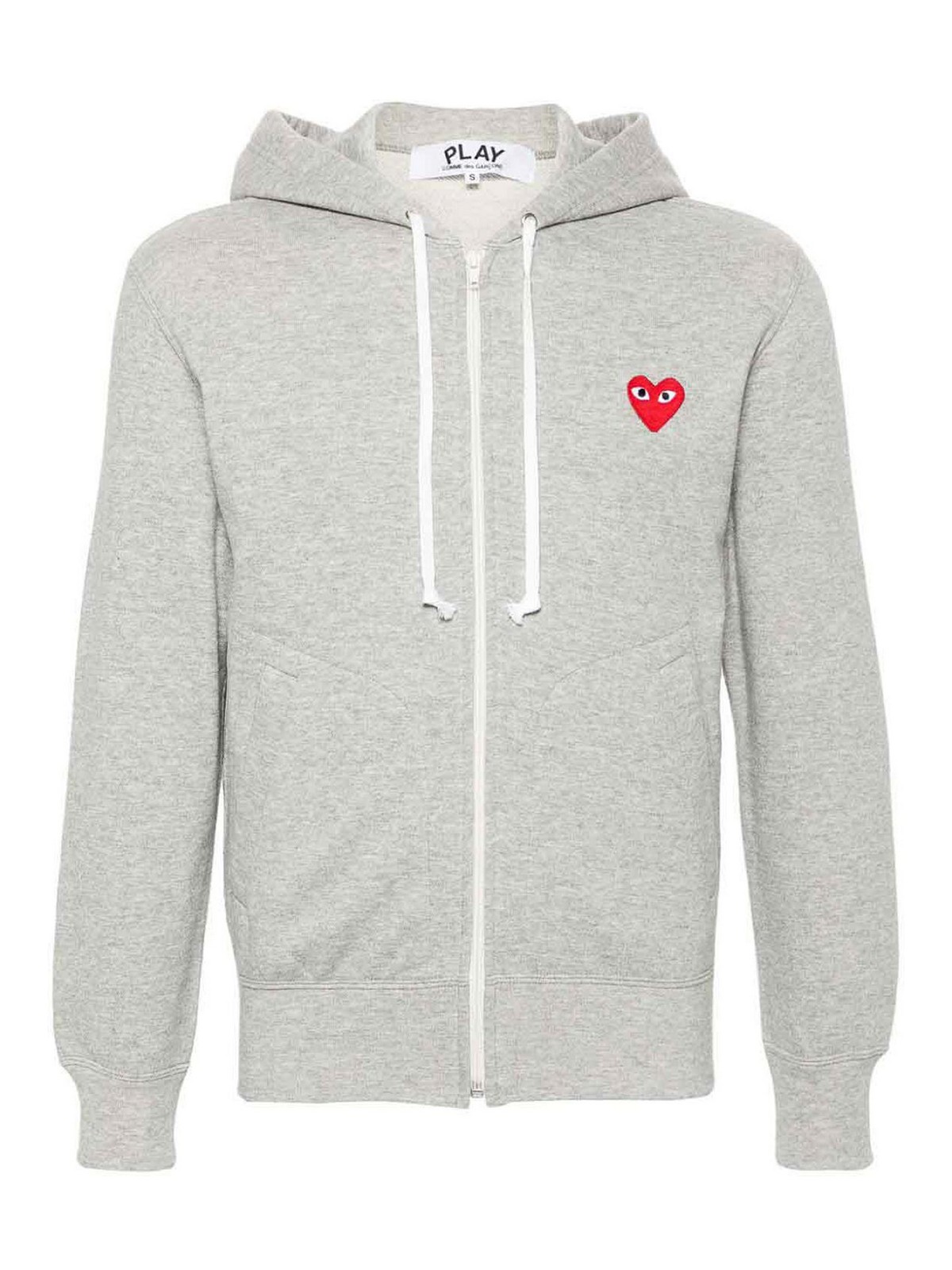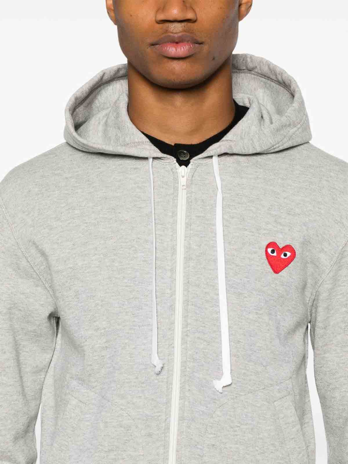 ティンバーウルフグレーのニット構造、メランジエフェクトシグネチャーハートパッチ、ゆったりとしたドローストリングフード、ファスナー付き長袖、リブ編みの袖口と裾、両サイドにウェルトポケット、ストレートヘム、フレンチテリー(ご購入時)