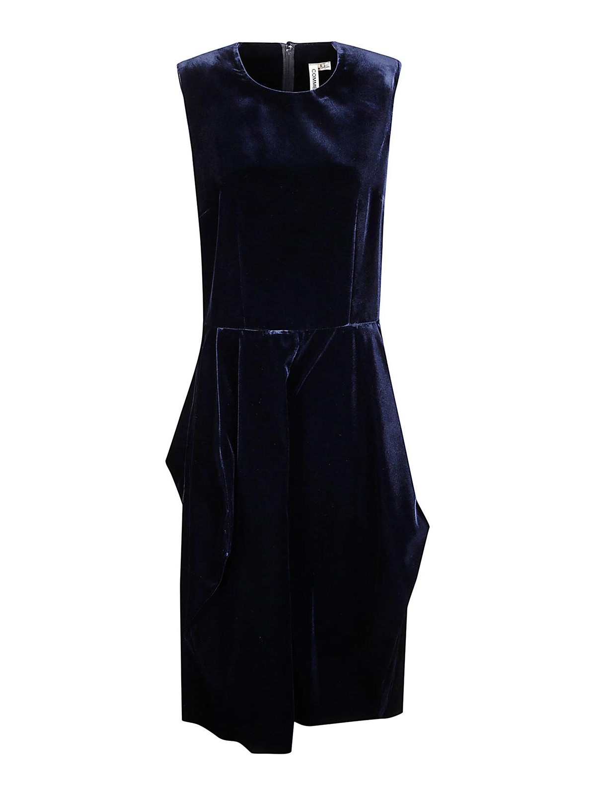 ダークブルーのベルベットパンツドレス、サイドポケット、背面に隠しファスナー付き。