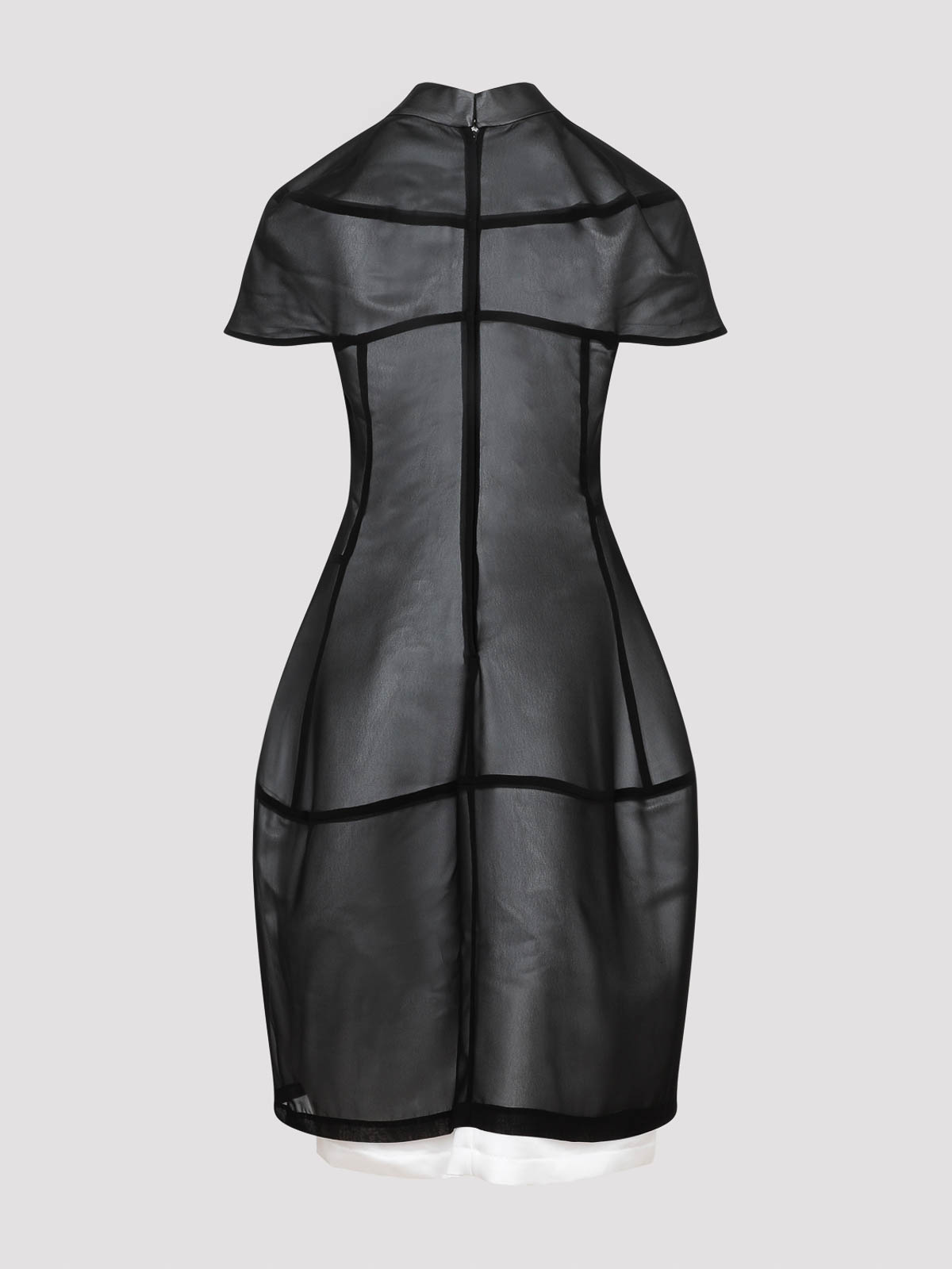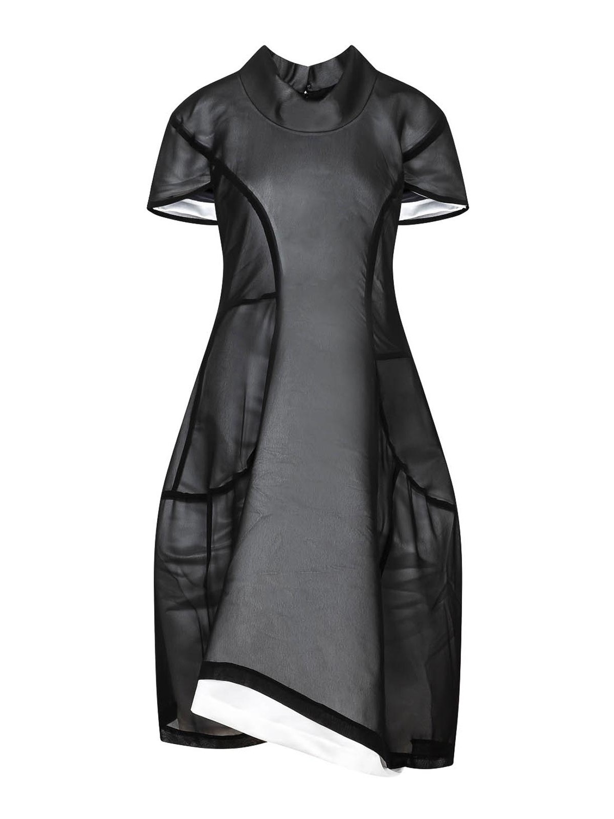 Comme des Garons ブラックホワイトポリエステルミニドレス。半透明のブラック生地で作られ、コントラストの効いた白い裏地、スタンディングカラー、ショートスリーブ、バルーンスカート、ブラックの大胆なディテール装飾、バックコンシールクロージャー。