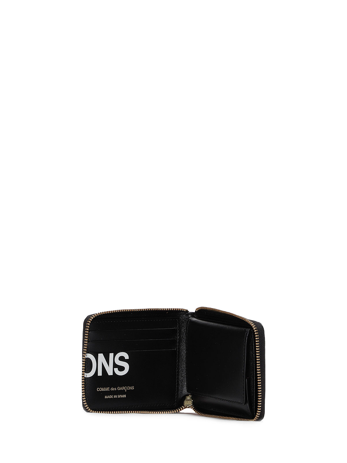 ロゴがプリントされたレザーウォレット、ファスナー開閉、紙幣、カード、コインをすっきり収納できる大きな内装。