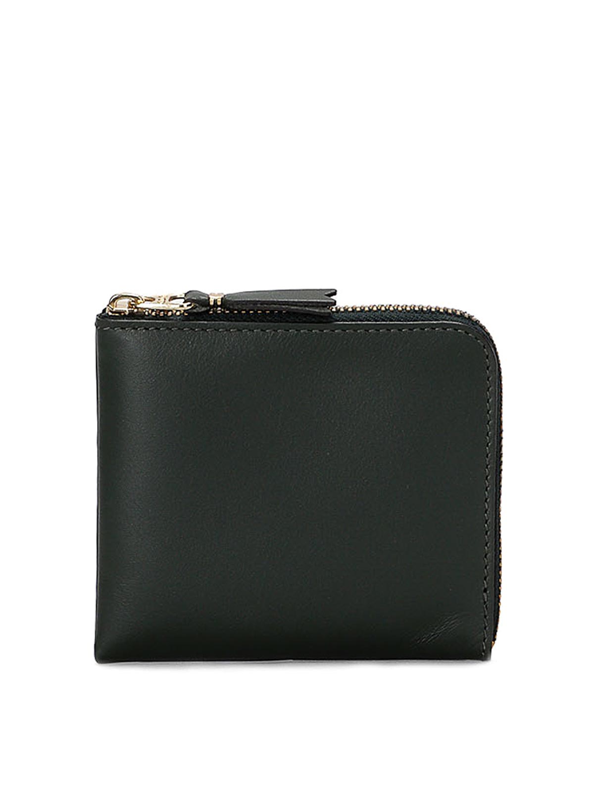 クラシックなダークグリーンの財布、ゴールドジッパー付きサイドクロージャー、内部ポケットコンパートメント。