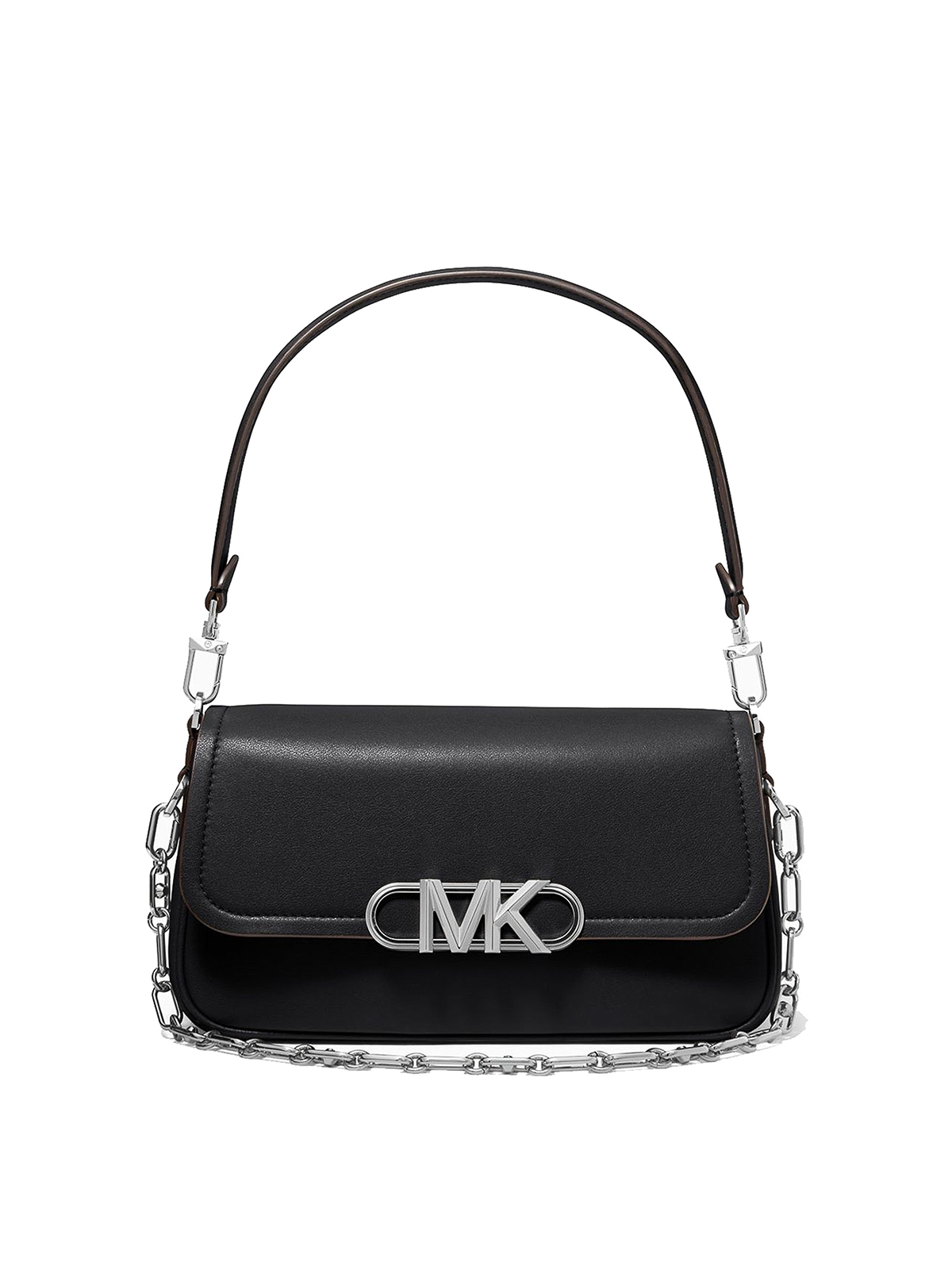 レザーとチェーンのショルダーストラップ、マグネットクロージャー、メタルロゴ付きショルダーバッグ。