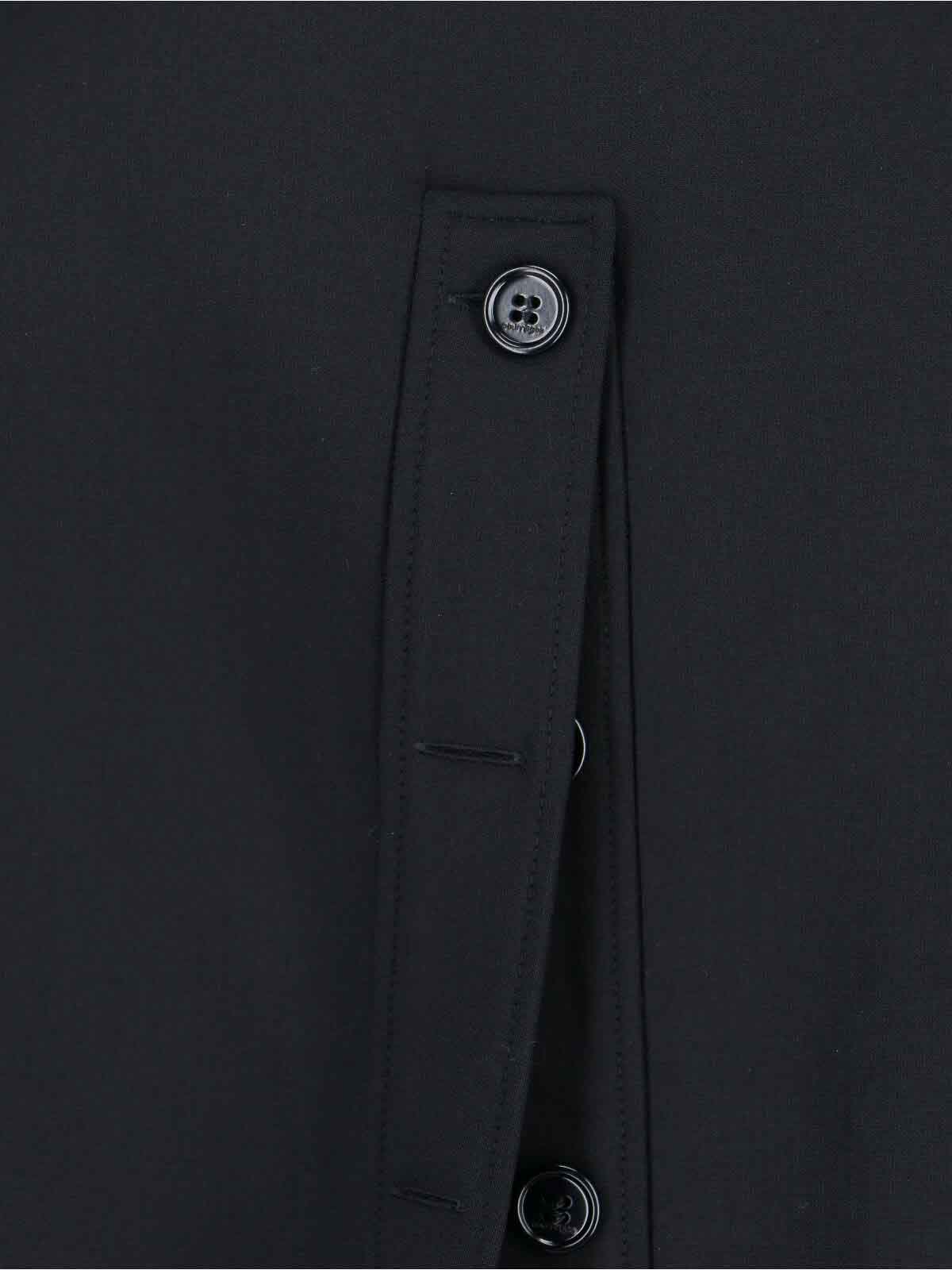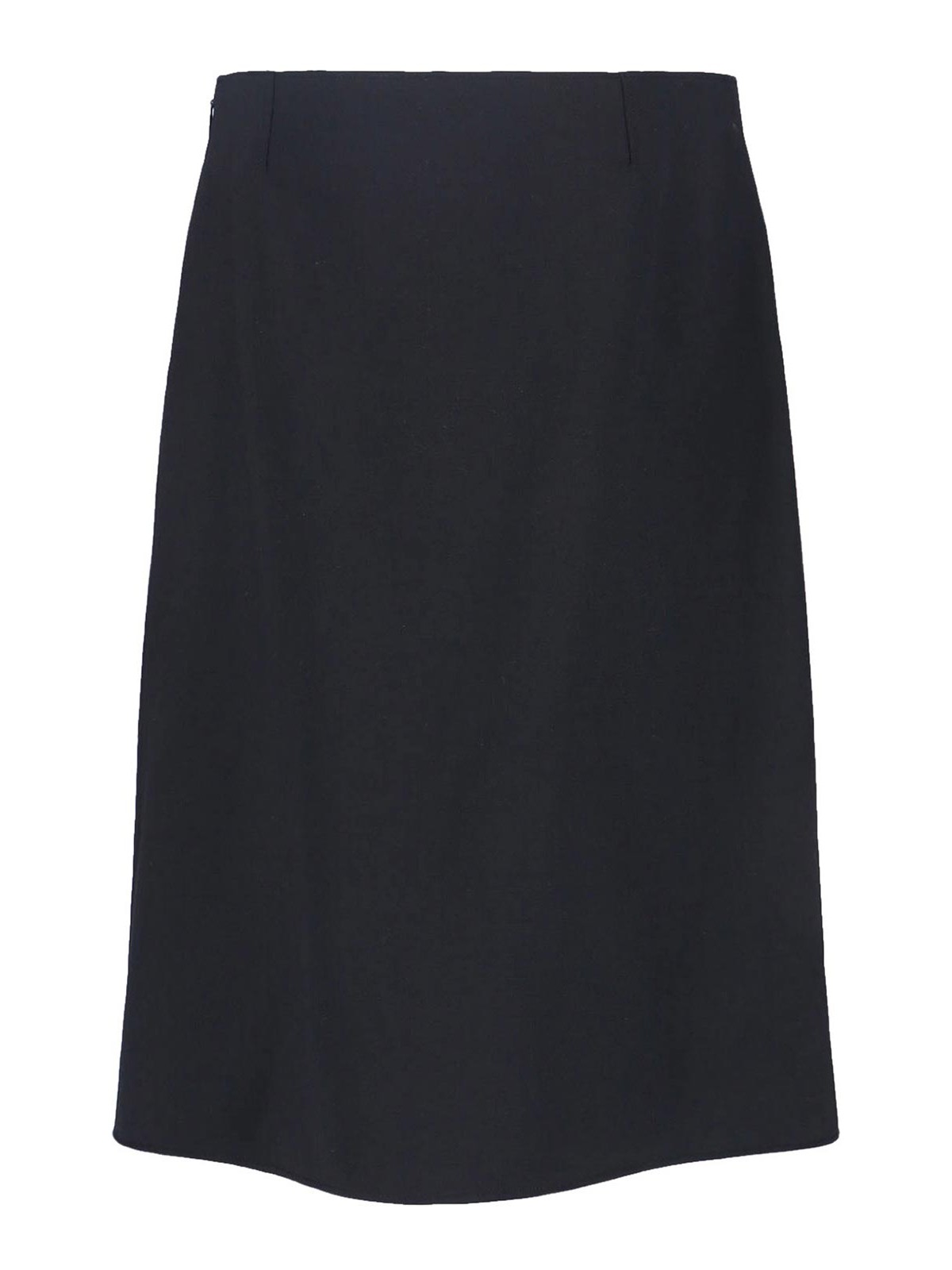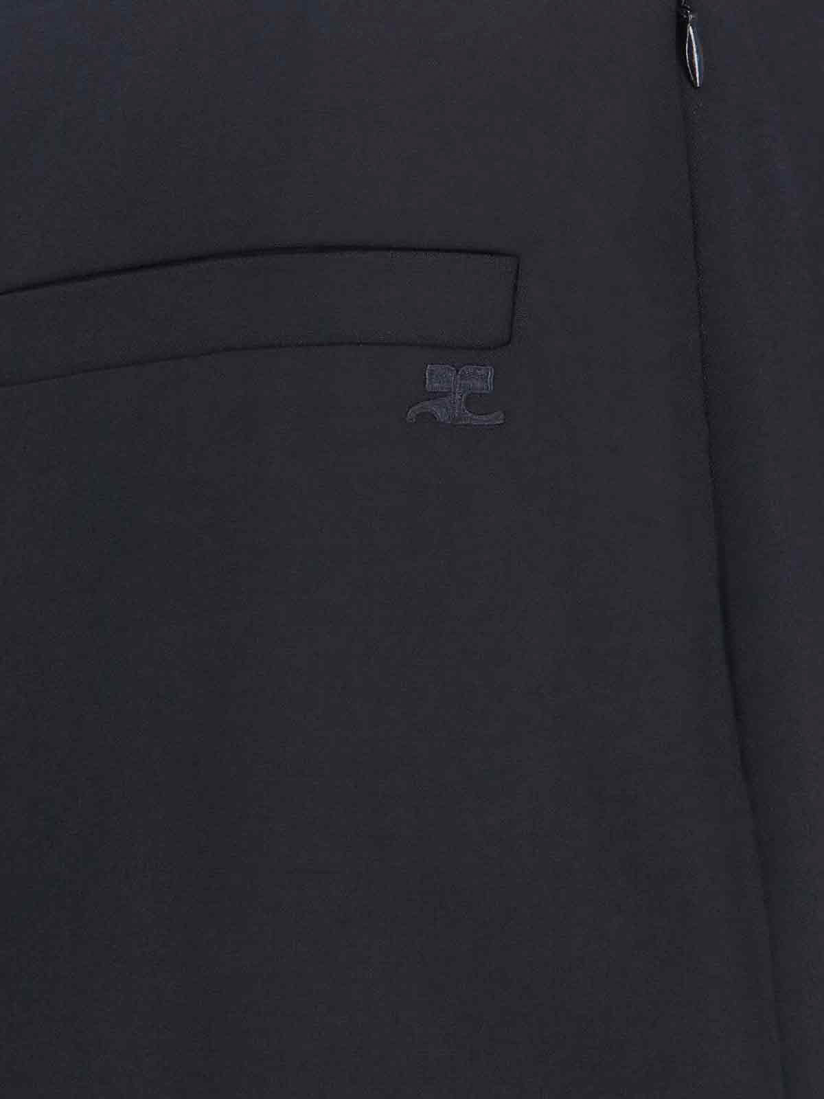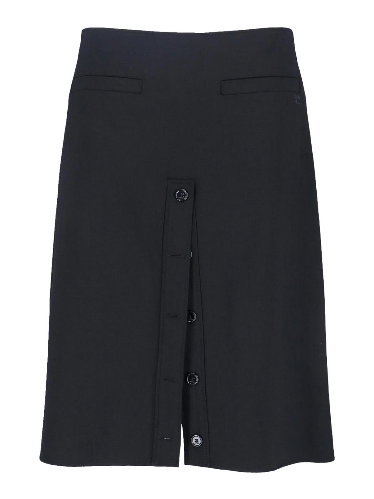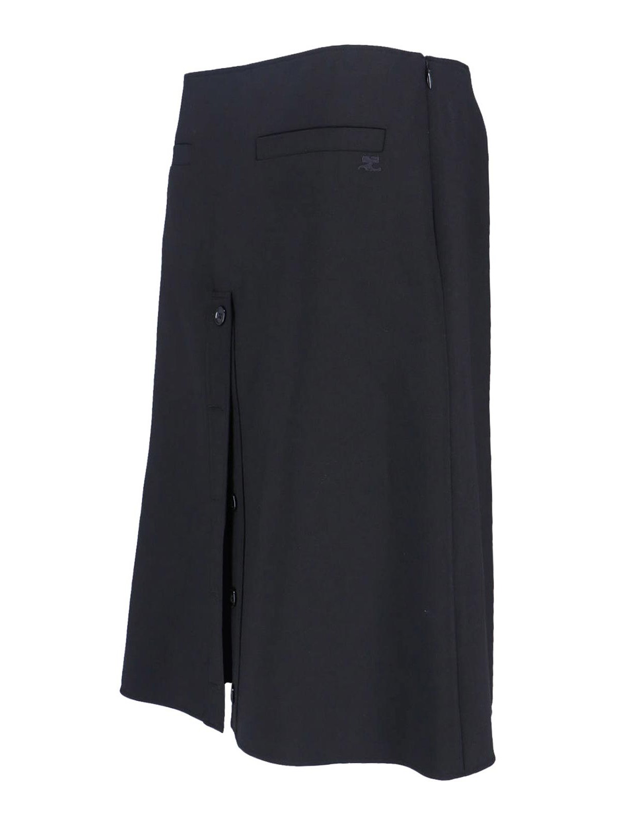 Courregesロゴミディスカート、ブラックウールブレンド、ミディアムウエスト、サイドジッパー、フロントフラットポケット2つ、サイドトーン・オン・トーンのロゴ刺繍、フロントボタン留め、ストレートヘム。