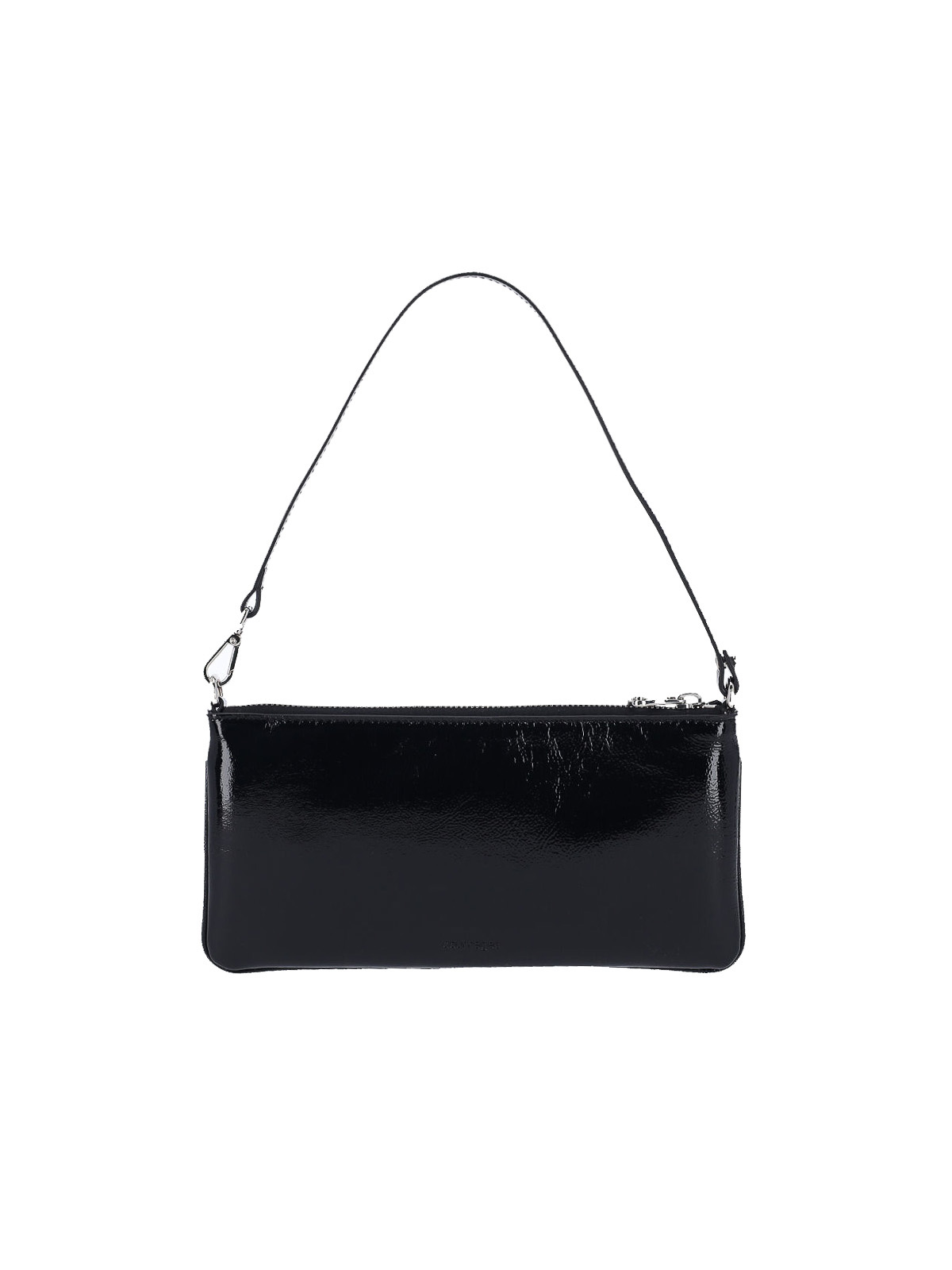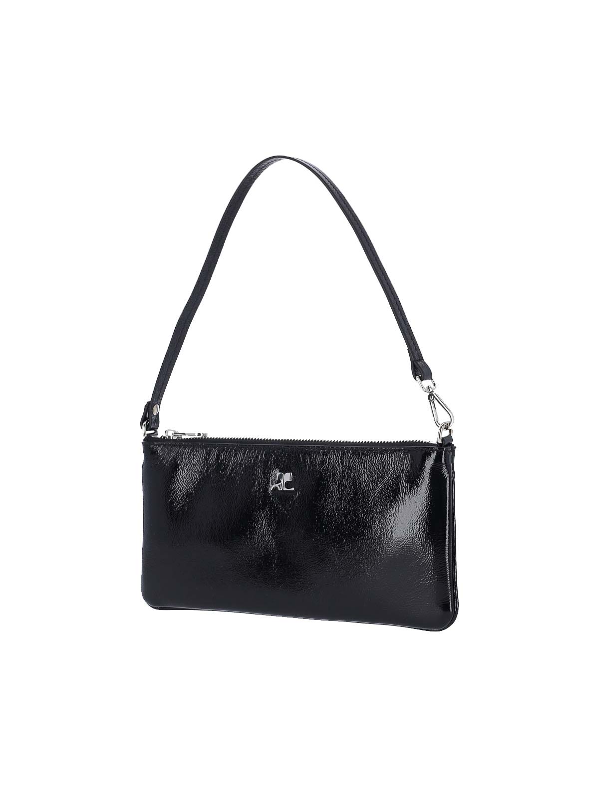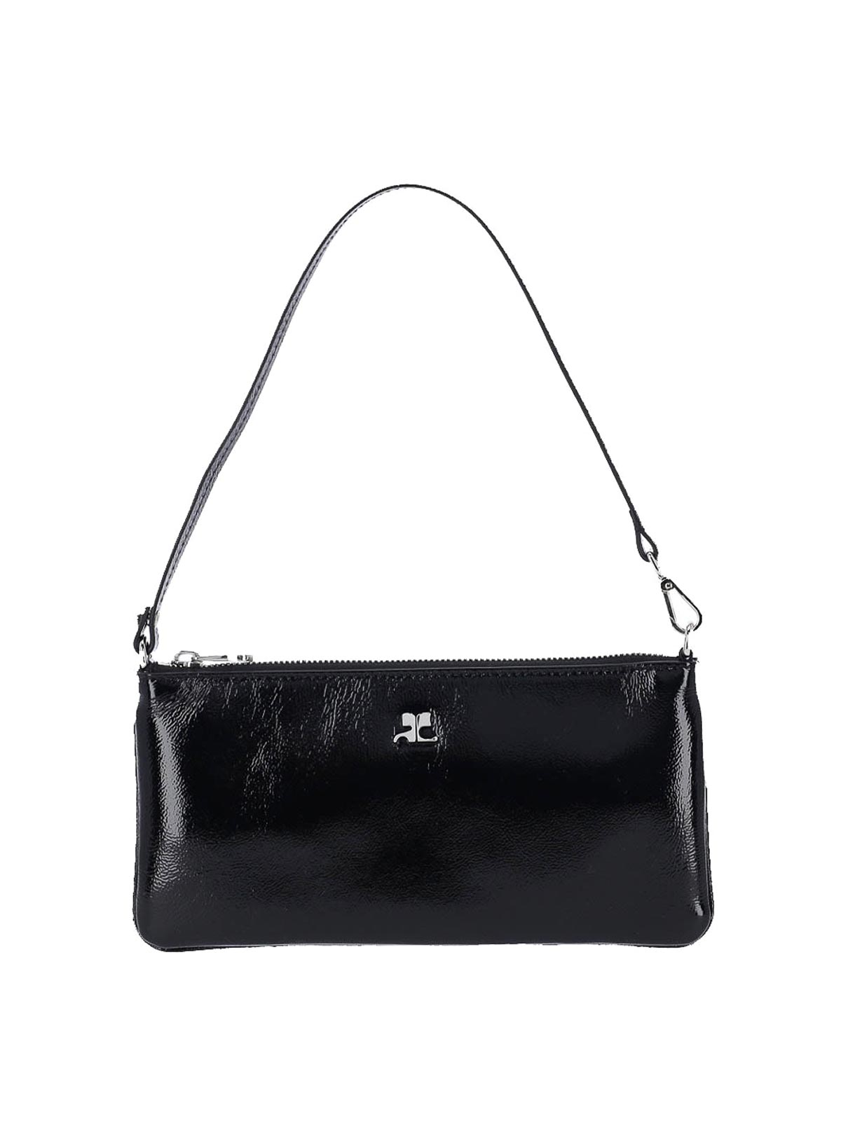 ブラックカーフスキンのCourregesロゴポーチ、調節可能なトップハンドル1つ、トップジッパー、前面にシルバーメタルのロゴ、内部コンパートメント1つ。