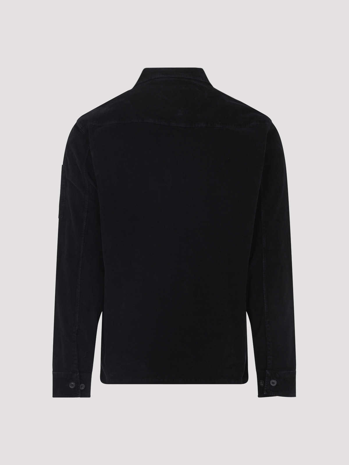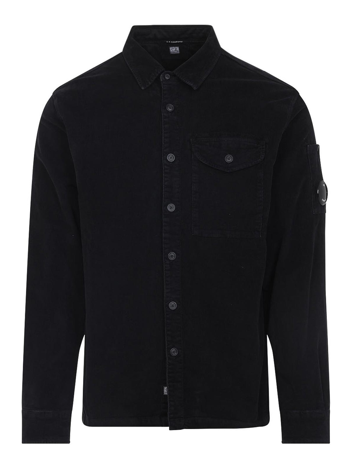 Cp company ls コーデュロイブラックコットンシャツ。ブラックコットンコーデュロイ製、ポインテッドカラー、フロントボタン留め、胸にフラップポケット、レンズのディテールが施されたスナップボタンポケット、ボタン付きカフス付き長袖、バックヨーク、カーブヘム。