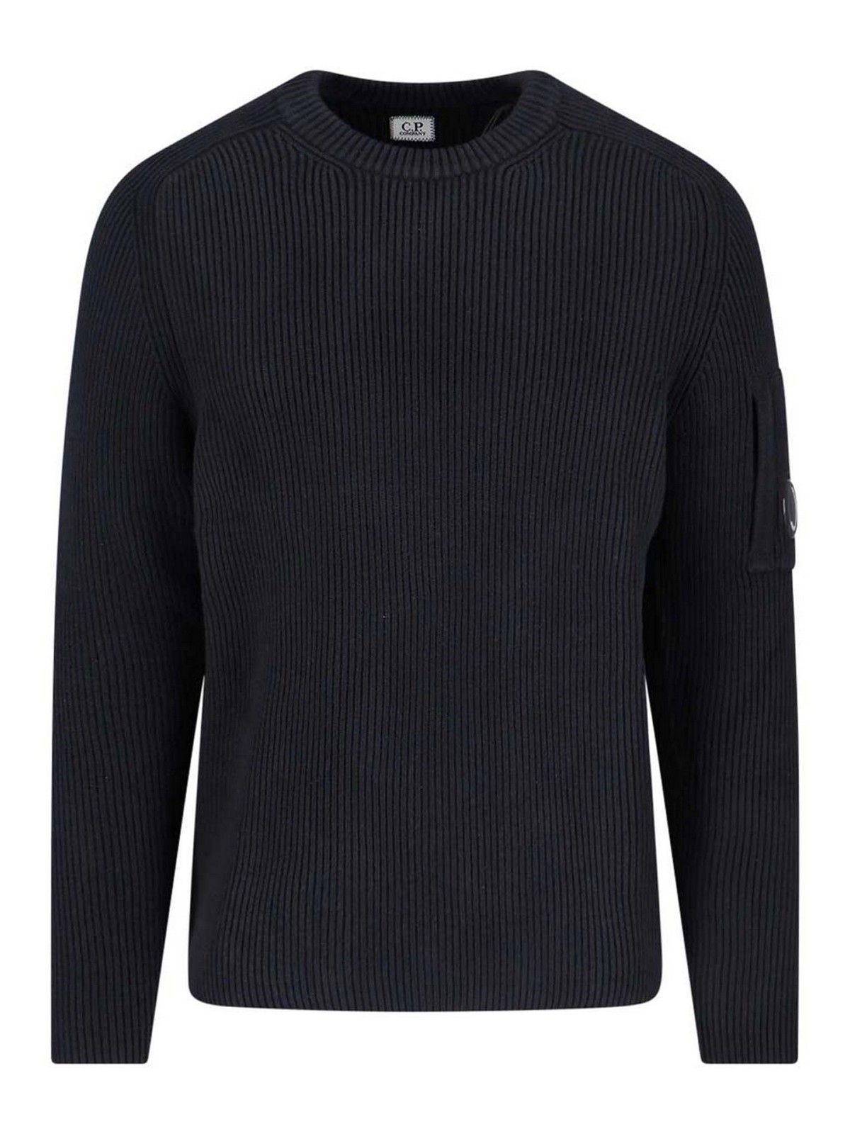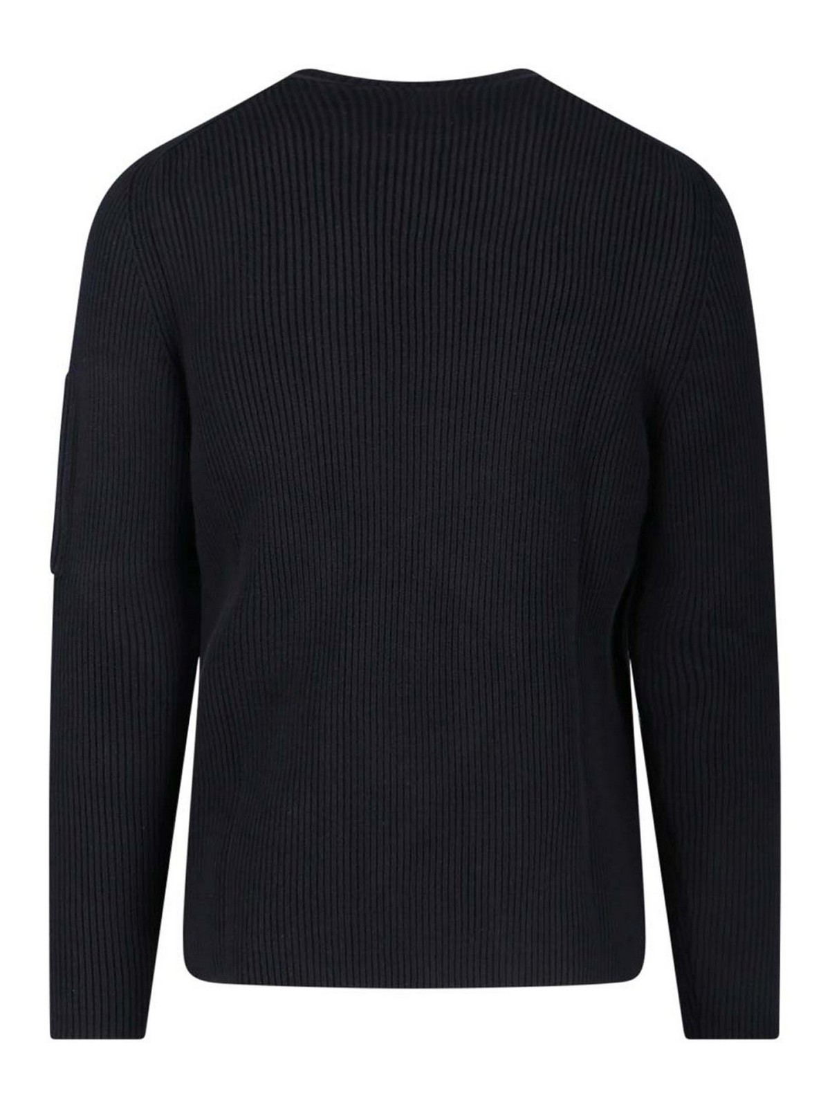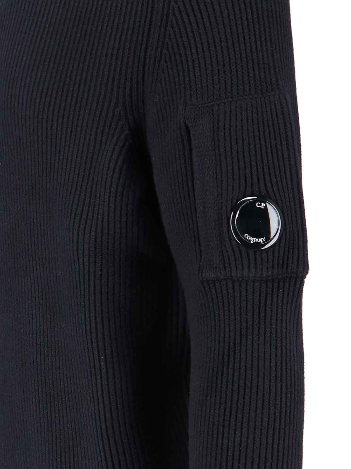 セーターロゴコード C.P. Company、ブラックコットン混紡、コースト加工、袖にポケットフラップ、コントラストカラーのハードウェアロゴディテール、ストレートヘム