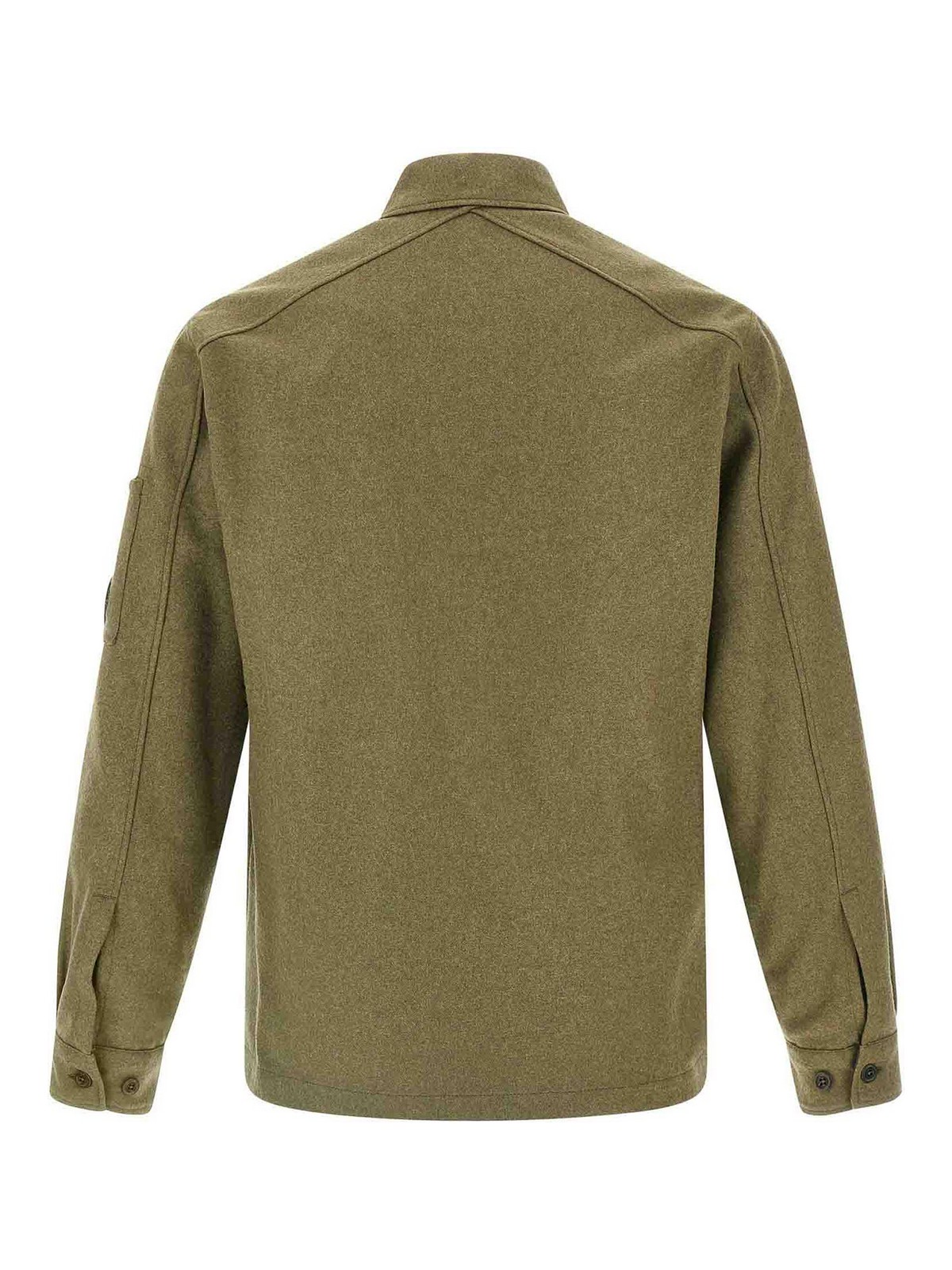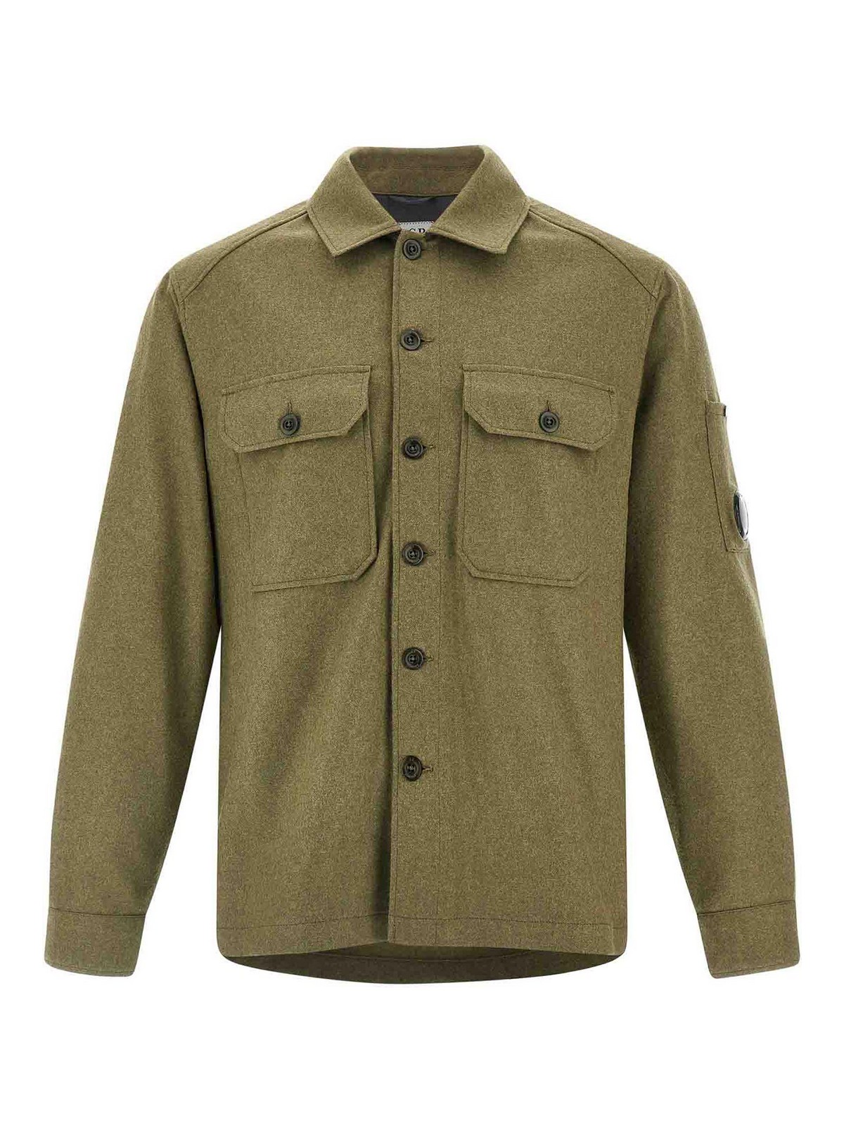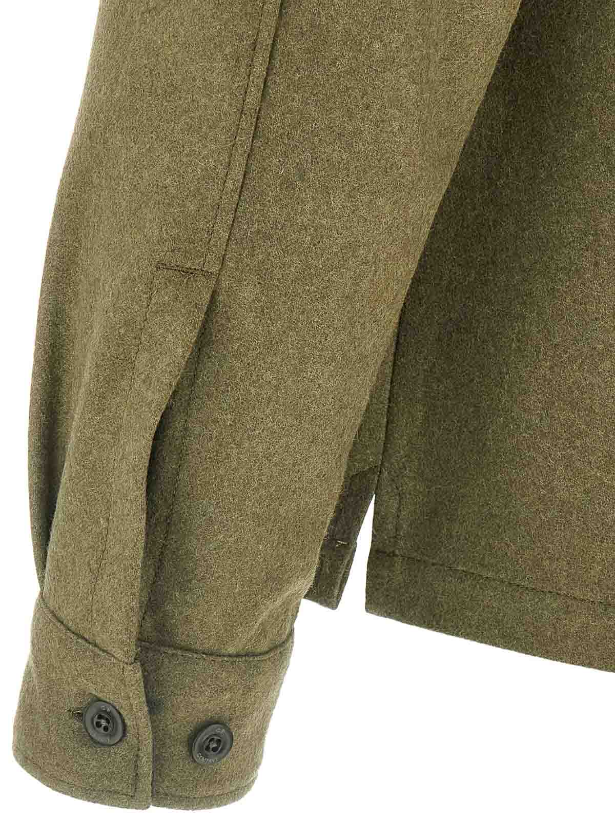 ウールオーバーシャツ、裏地なし、シャツカラー、フロントポケット、サイドスリット、ボタンクロージャー、サイドロゴ、カフス付きロングスリーブ。