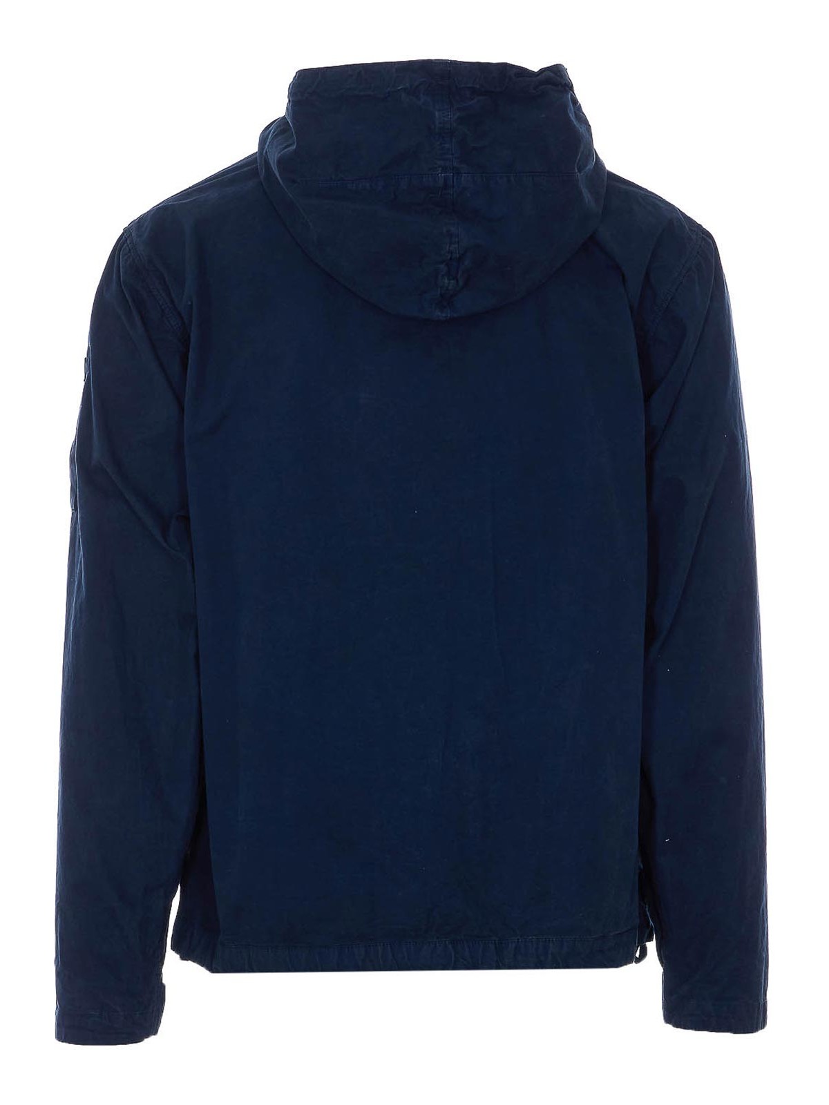 C.P. company ブルーマイクロレップジャケット、正面ファスナー付き、フード付きクーリス、ロングスリーブ、袖にパッチロゴ、ポケット