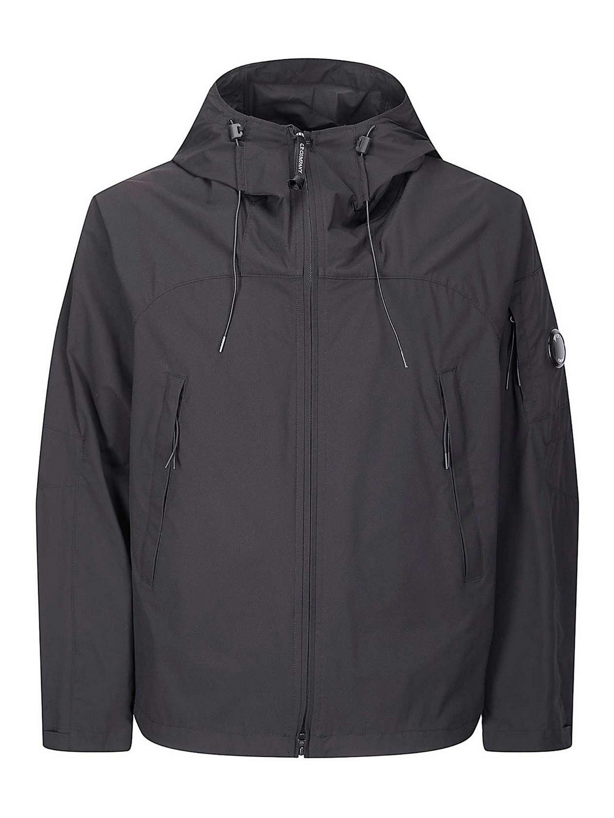 シャツの重さと快適さをアウターウェアの保護性と兼ね備えたメカニカルストレッチポリエステルであるプロテック製の軽量フード付きジャケット。アイコニックなC.P. lens.社が特徴で、フルダブルスライダーのジッパーとサイドジッパーポケットが付いています。滴り落ち防止加工。レギュラーフィット。