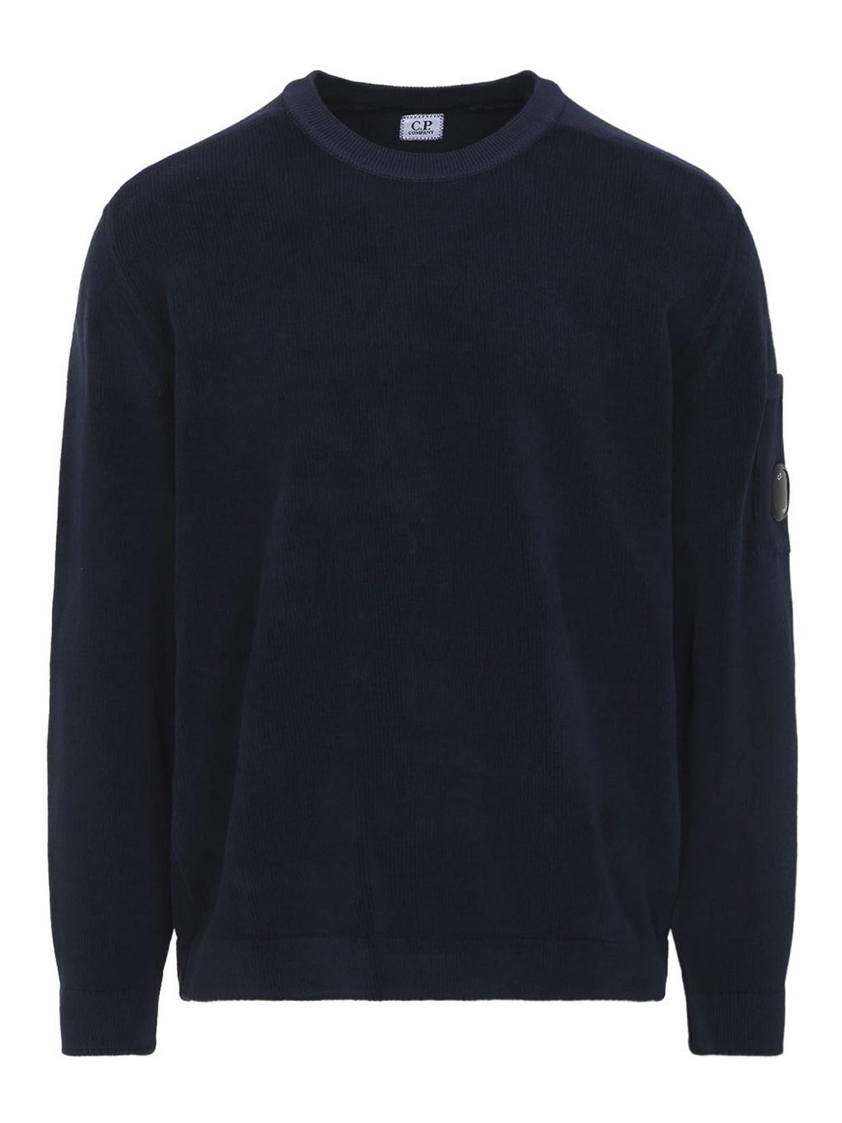 Cp Companyのクルーネックレンズネイビーブルーコットンプルオーバー。ネイビーブルーのニットコットン製で、ラウンドネックライン、ロングスリーブ、アイコニックなCPレンズ、リブ編みのエッジ、ストレートヘムが特徴です。