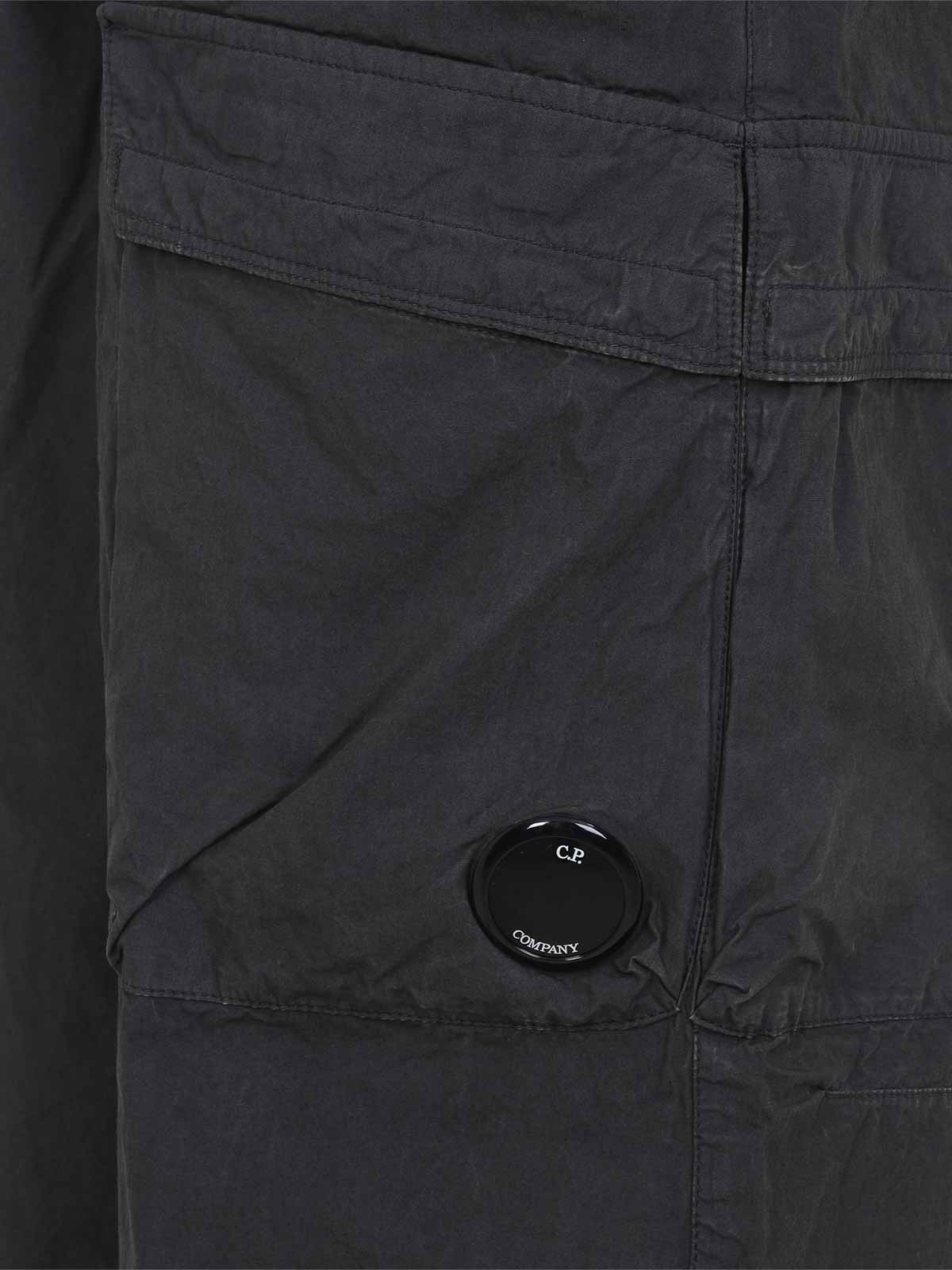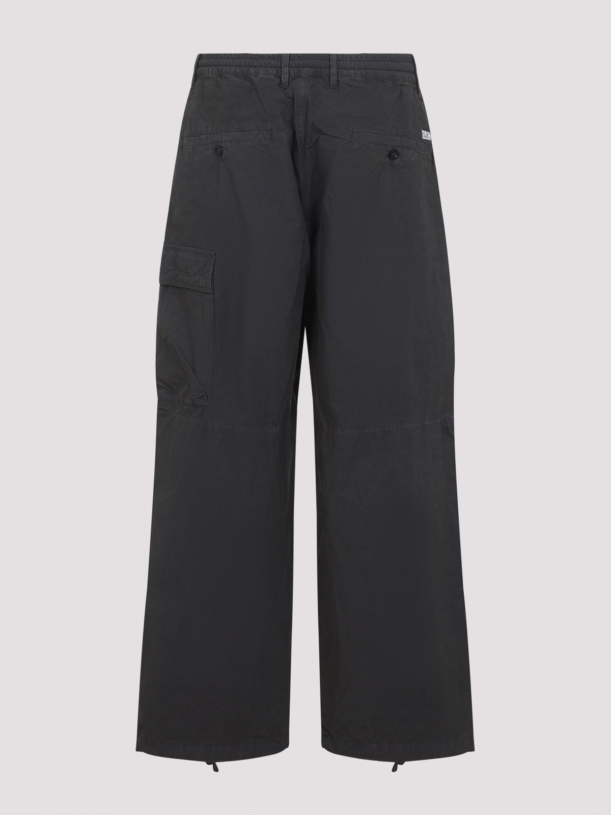Cp company micro-reps ボクシーグレーコットンカーゴパンツ。ダークグレーのコットン製で、伸縮性のあるウエストバンド、ベルトループ、フロントボタンとジップフライ、サイドポケット、片側にカーゴポケット、CPレンズのディテール、背面にウェルトポケット、袖口に隠しドローストリングが付いています。