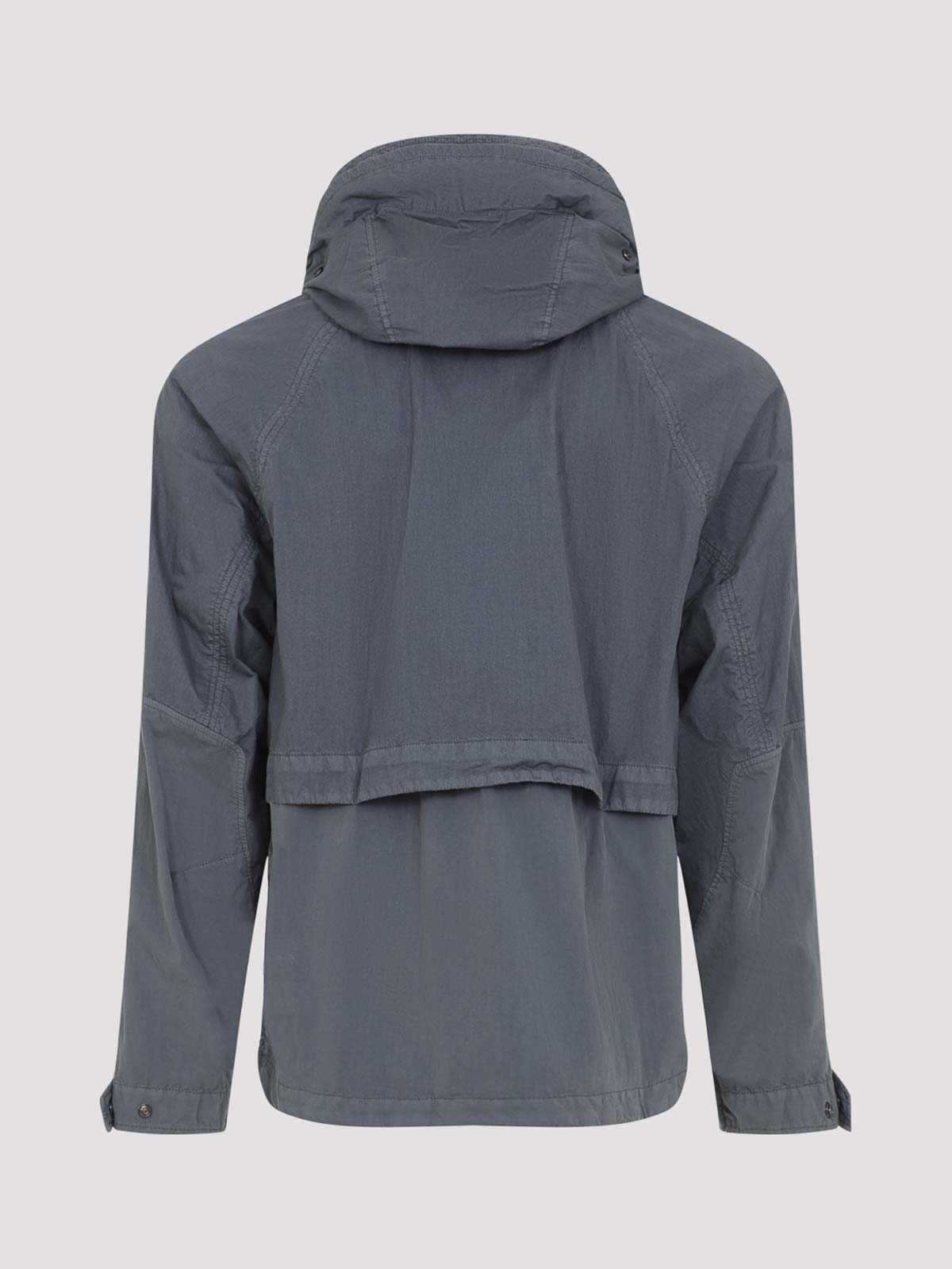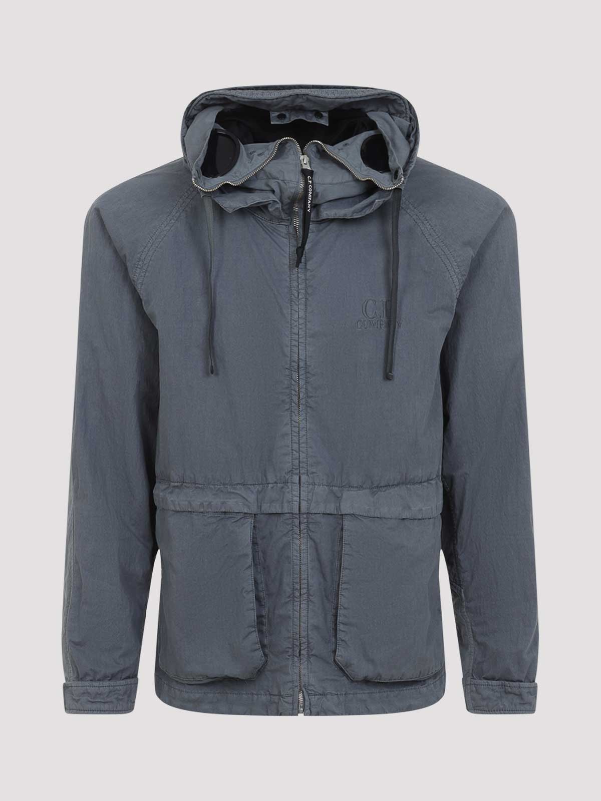 Cp companyのワックスエクスプローラーグレーコットンジャケット。グレーのワックスコットン製の撥水ジャケット。ゴーグルレンズ付きのシグネチャーエクスプローラーフード、フロントファスナー、胸に同系色のロゴ刺繍、2つのフロント拡張可能なポケット、ウエストに隠しドローストリング、調節可能な袖口付きの長袖、レギュラーフィットが特徴です。