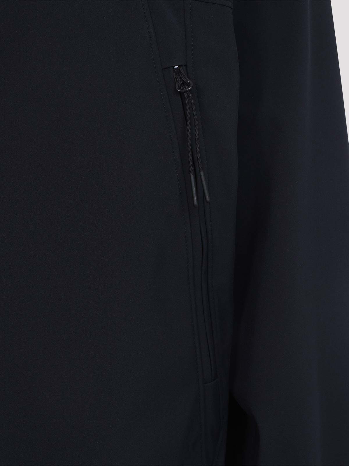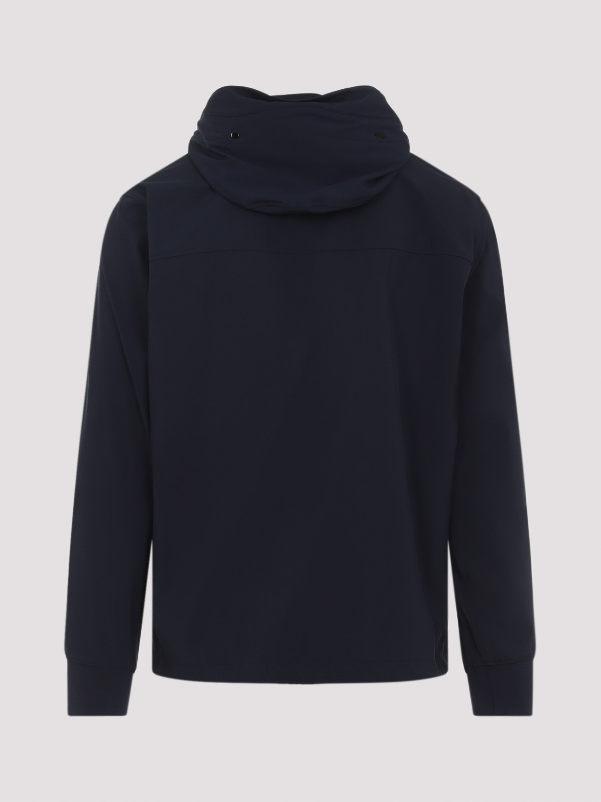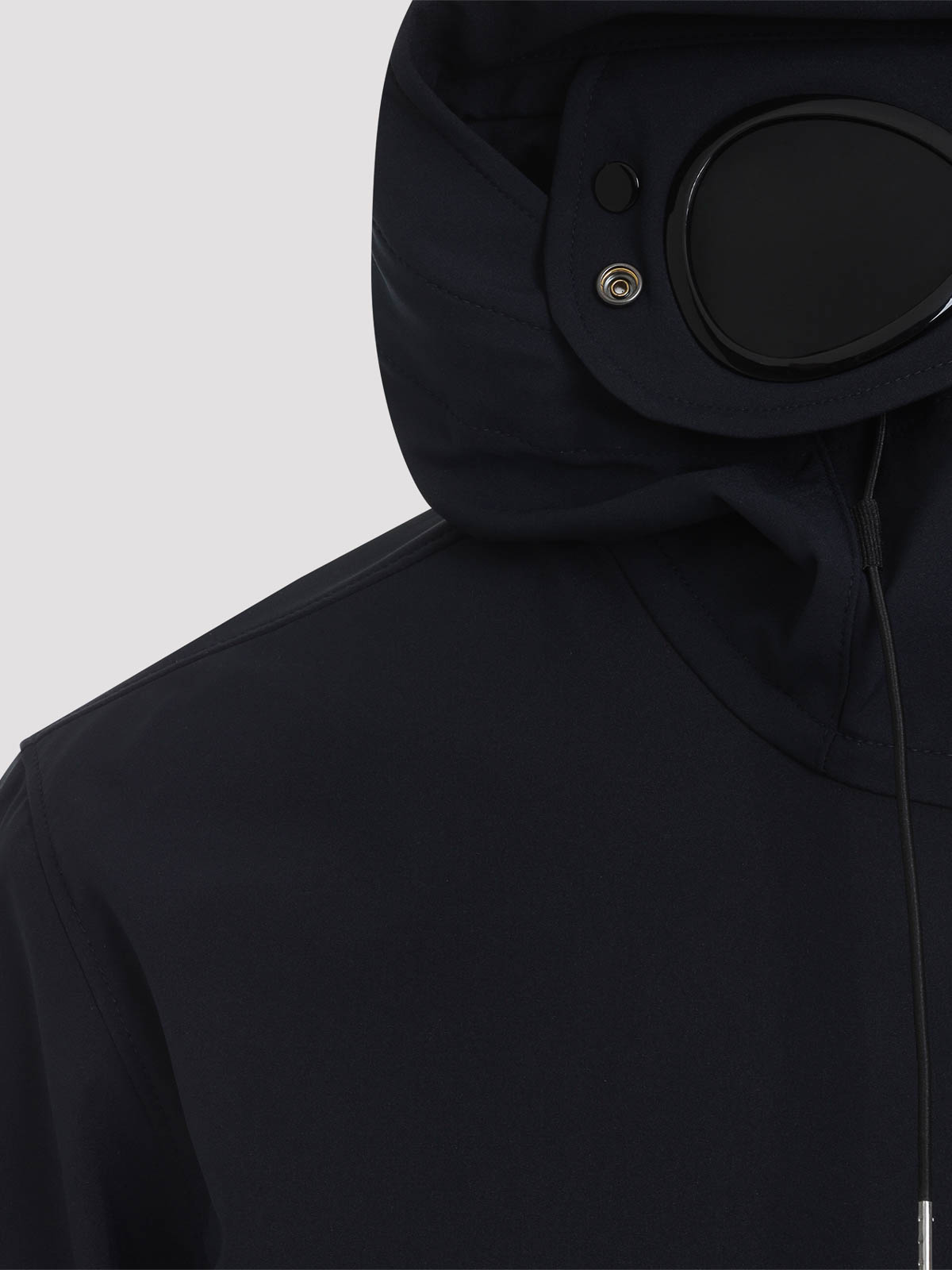 Cp Companyのshell-rゴーグルトータルエクリプスポリエステルジャケット。ダークブルーのソフトシェルストレッチで作られており、アイコニックなゴーグルレンズとドローストリングが付いたフード、ブランドテキスタイルプラー付きのフロント2ウェイジッパー、フロントに2つのジッパーポケット、リブ編みの袖口が付いた長袖、裾の隠しドローストリングが特徴です。ジャケットは防風性と撥水性があります。