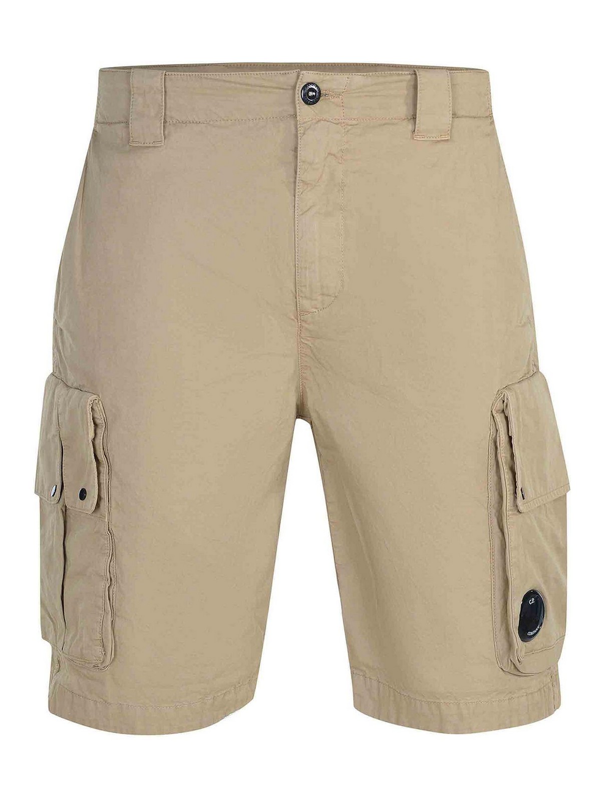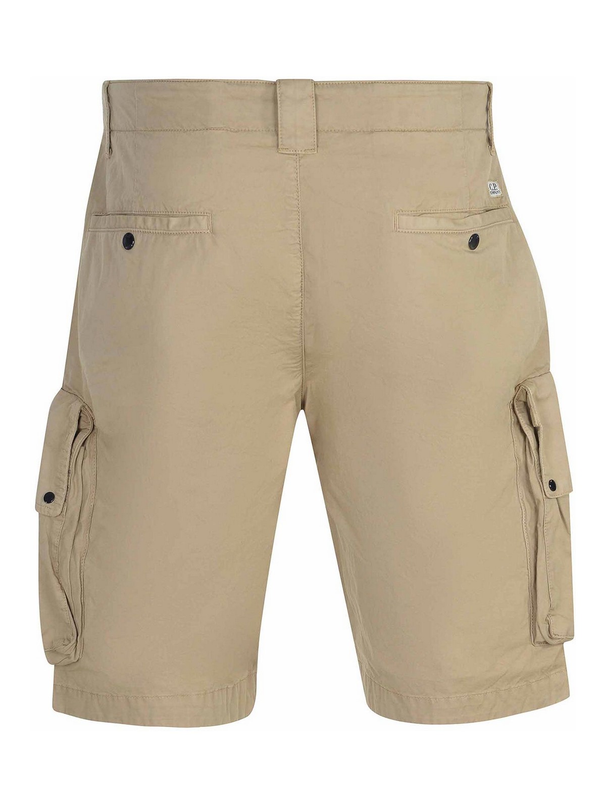 Bermuda C.P. 社製ベージュコットン、ボタン&ジッパー、ベルトループ、サイドポケット、ボタン付きサイドカーゴポケット、裾にロゴレンズ、ボタン付きバックポケット、バックにコントラストの効いたロゴラベル、100% コットン